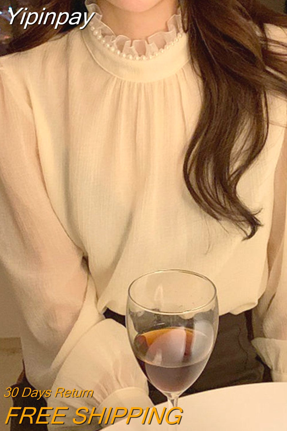 Yipinpay Femininas Blouse Women Camisa Femme Mujer Stand Transparent Shirt Chiffon Puff Tops 2023 Shirts for Women Lady Beaded
