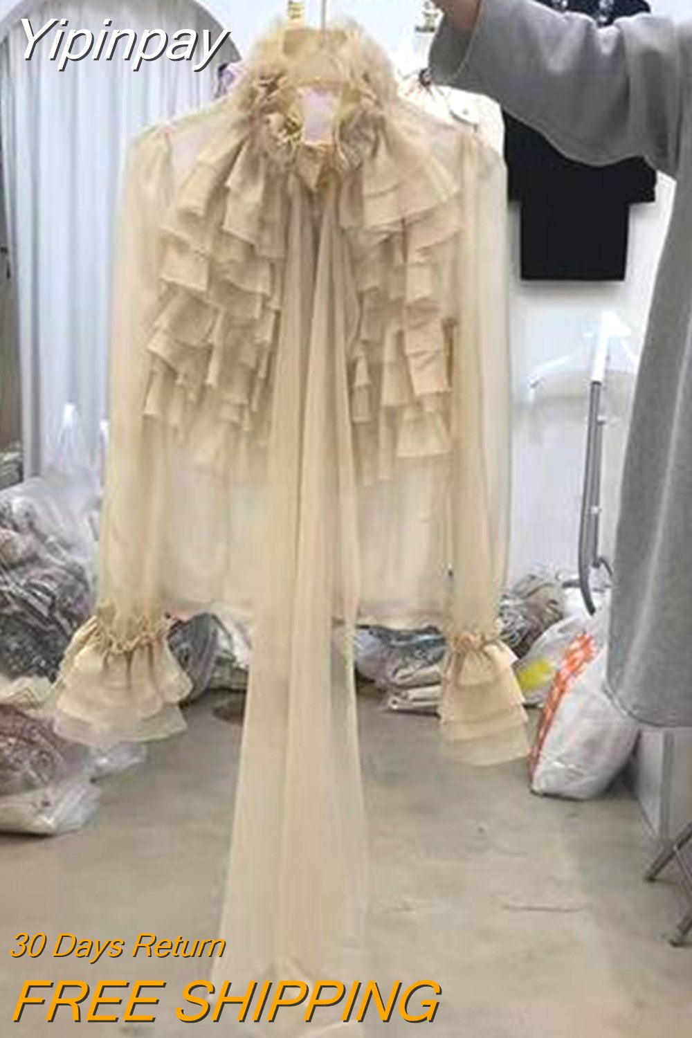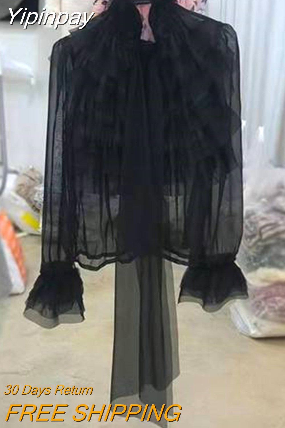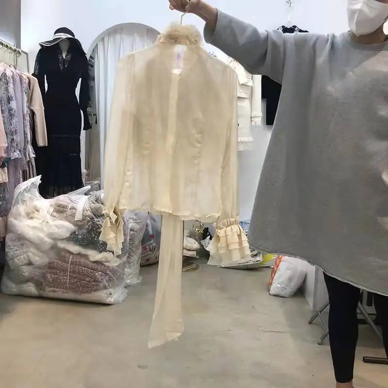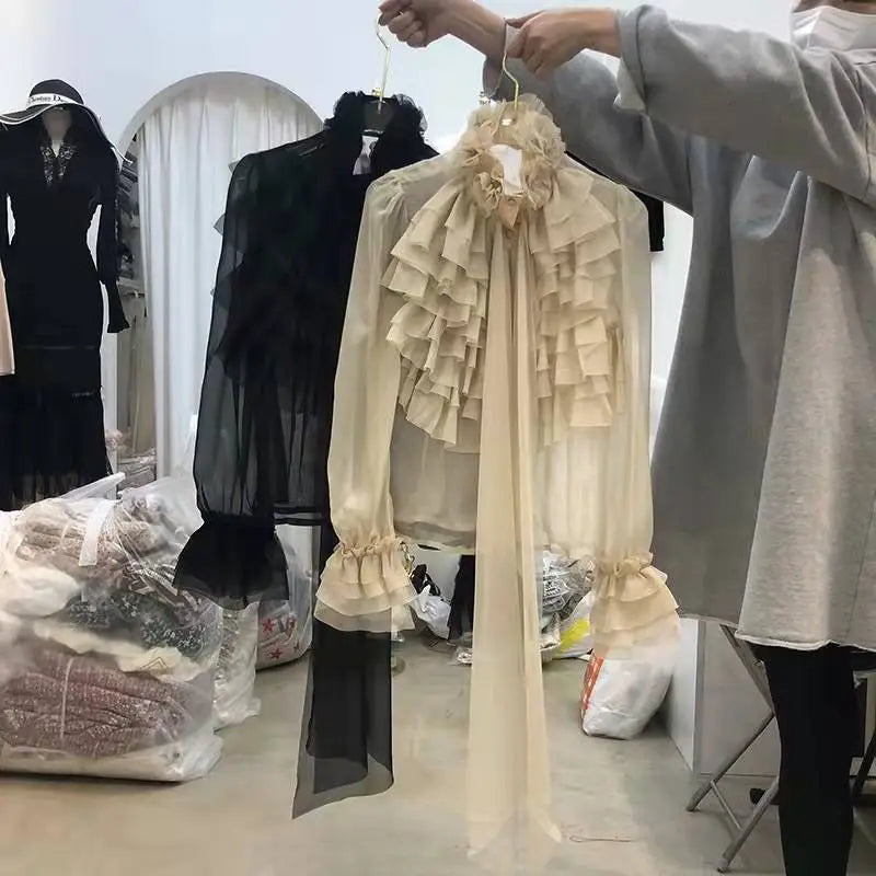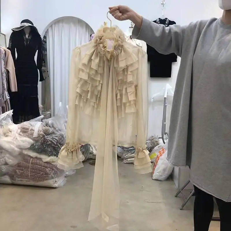 Yipinpay Femininas Elegantes Stand Neck Bow Ruffle Long Sleeve Casual Shirt Top Women Perspective Black Mesh Shirts Blouse
