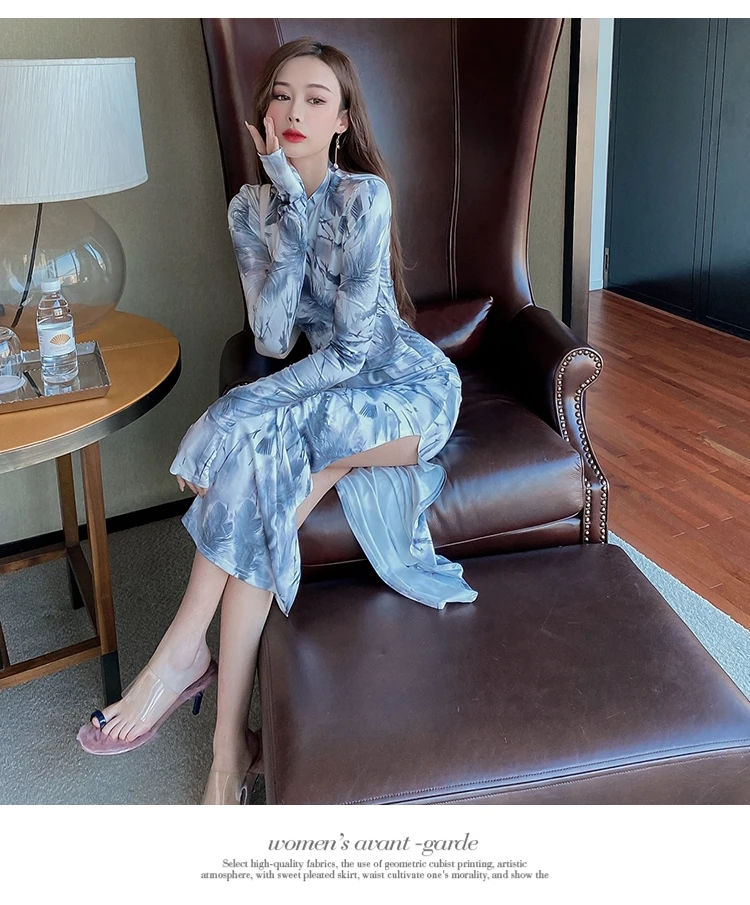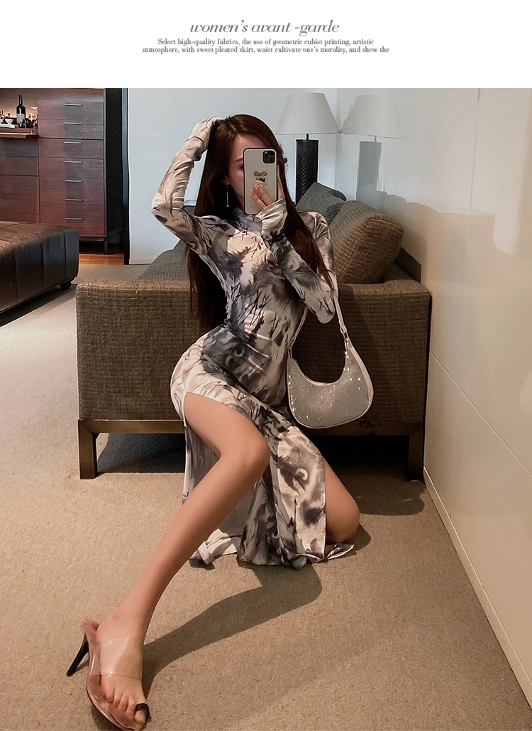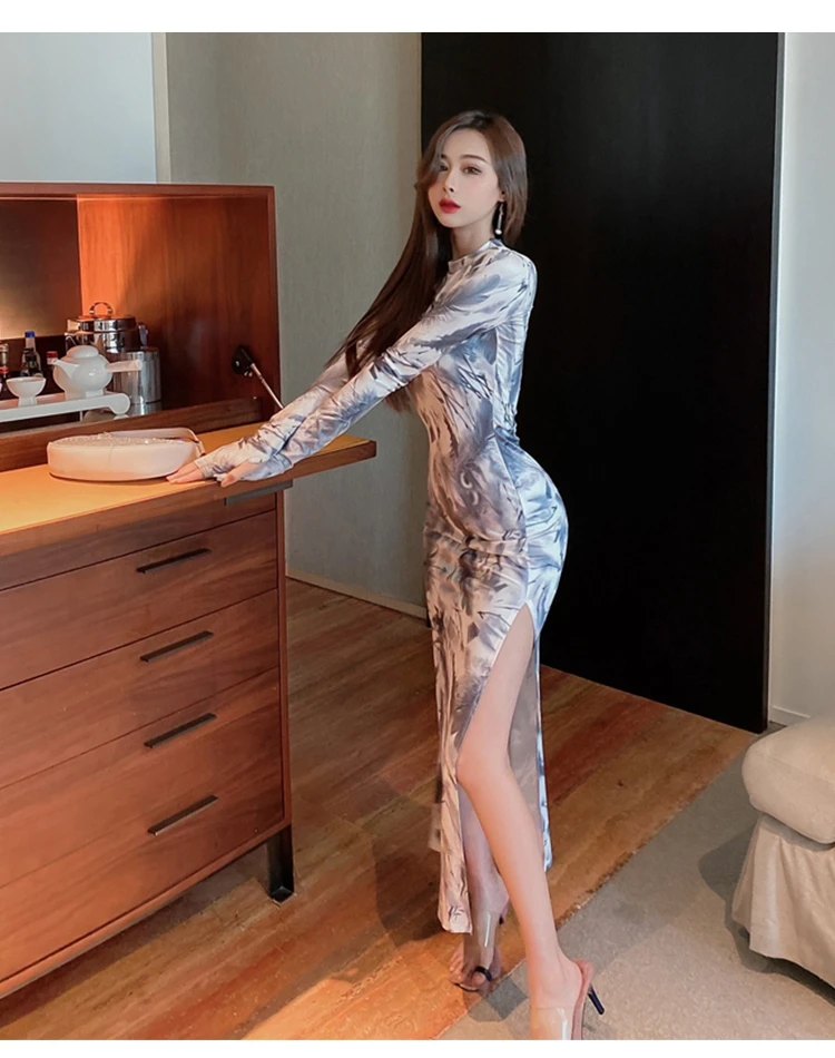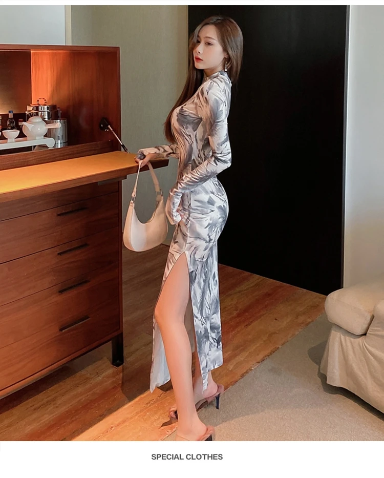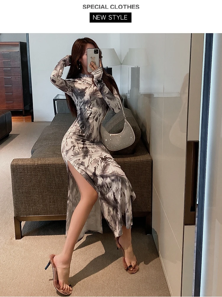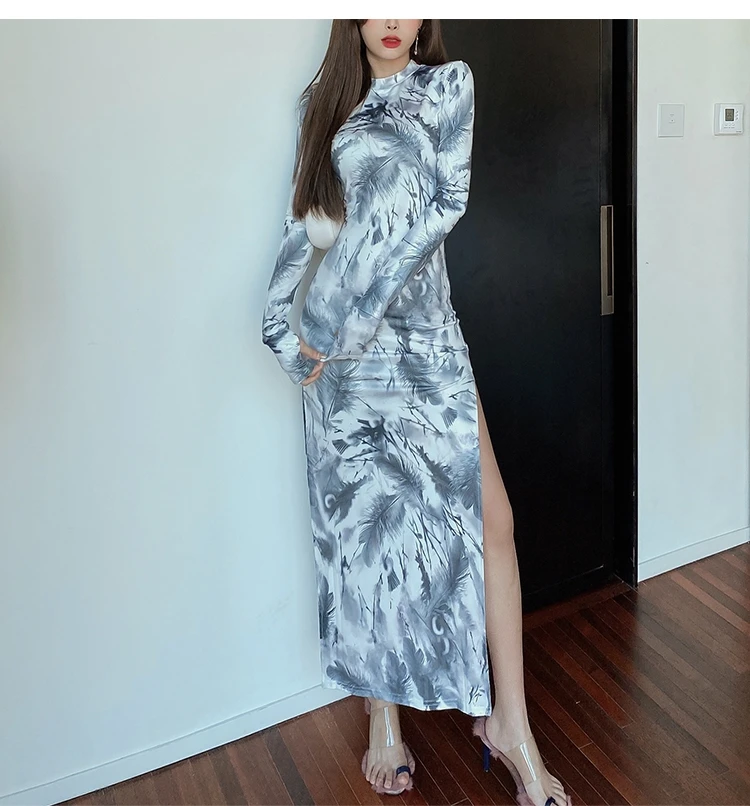 Yipinpay Femme Spring Slim Sexy Retro Print High Slit Dress Women Wrap Hip O Long Sleeve Elegant Chinese Style Fashion Clothes
