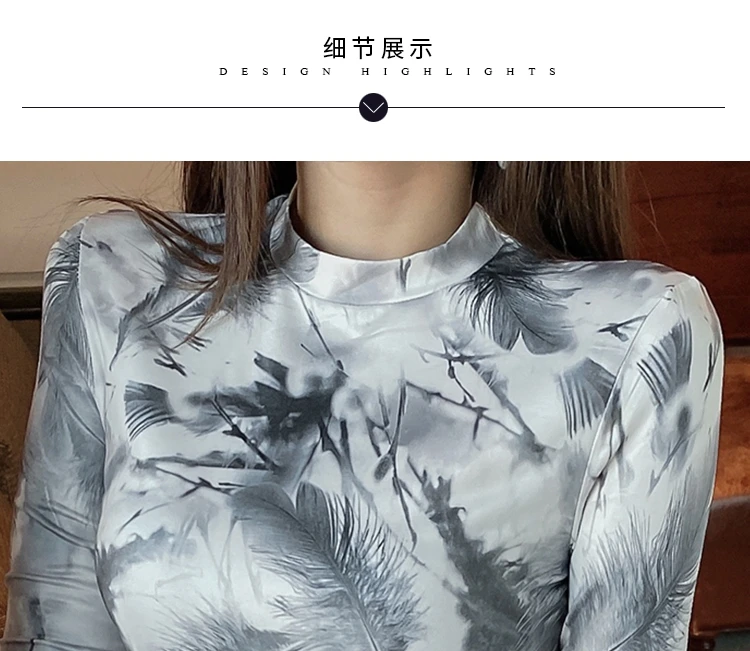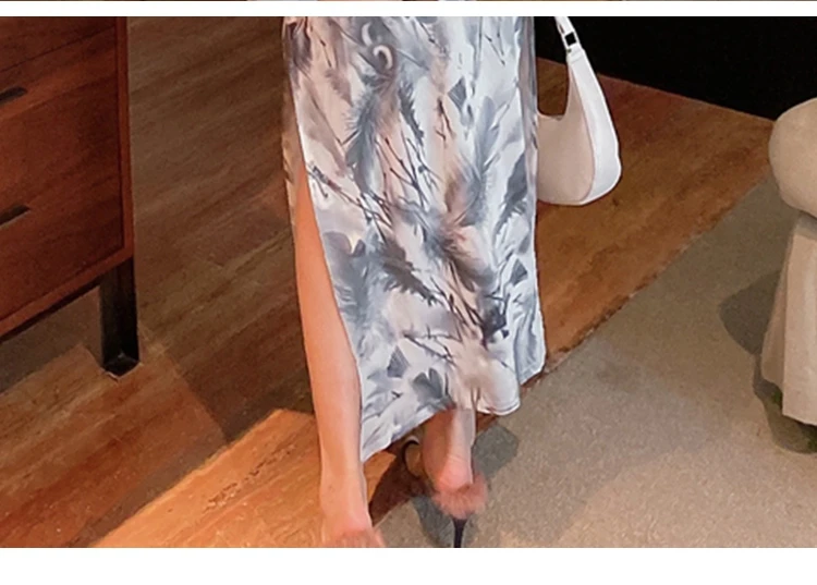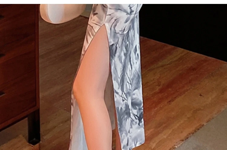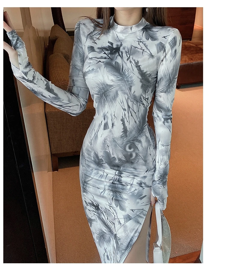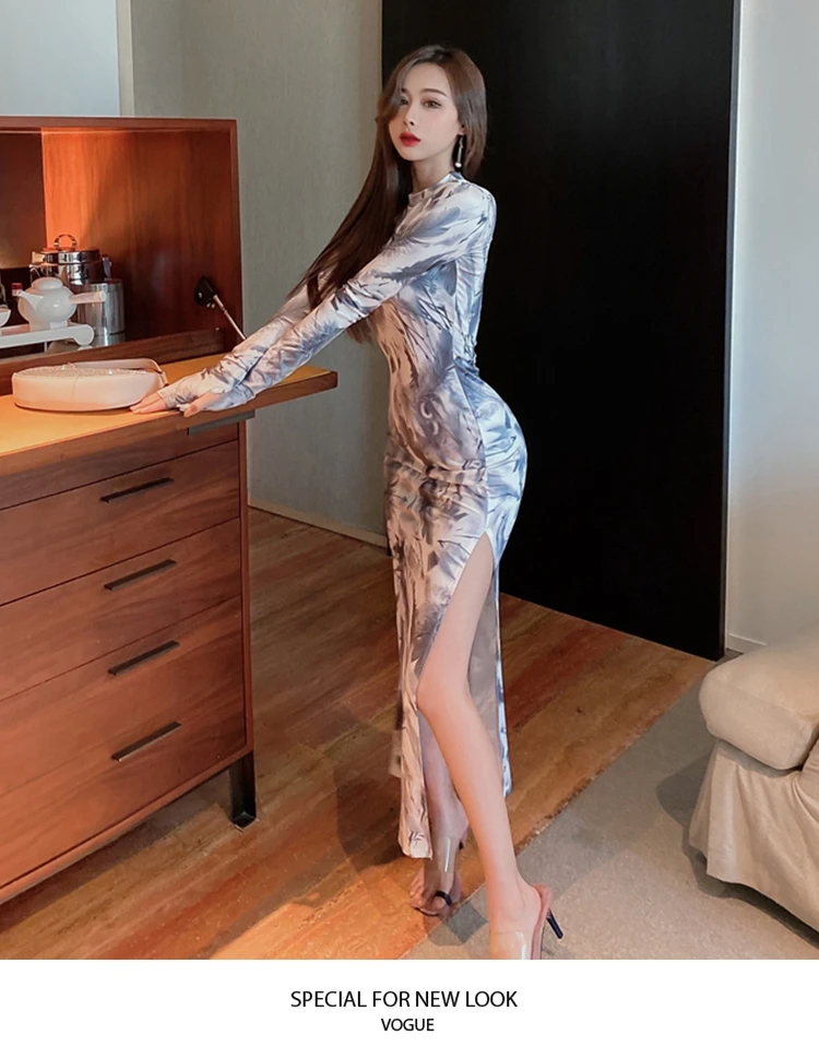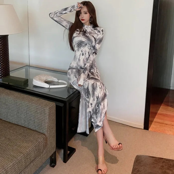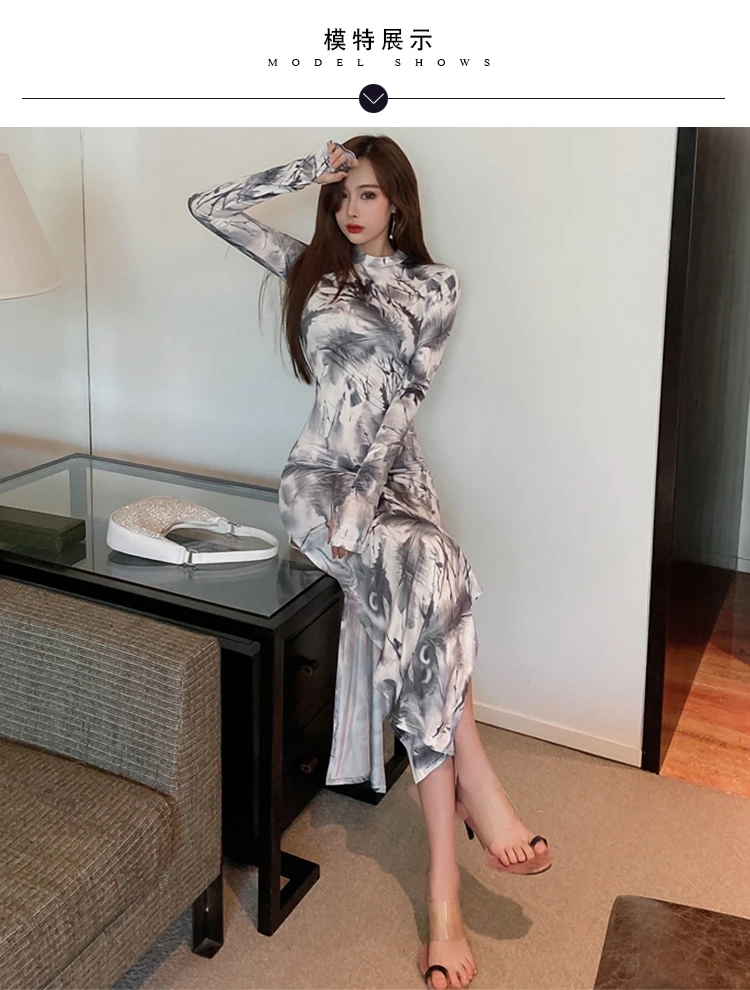 Yipinpay Femme Spring Slim Sexy Retro Print High Slit Dress Women Wrap Hip O Long Sleeve Elegant Chinese Style Fashion Clothes