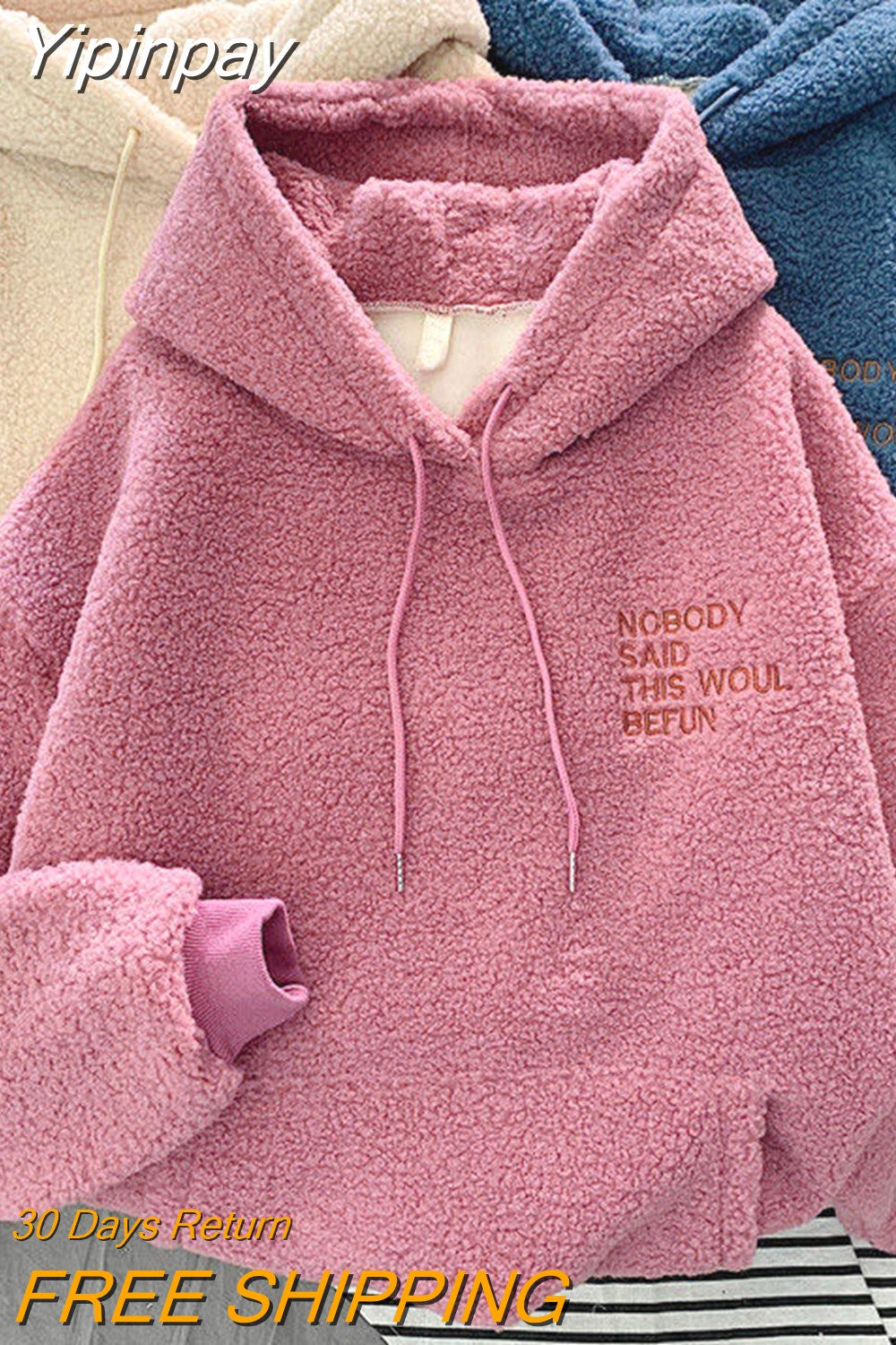 Yipinpay Fleece Hooded Sweatshirt Women Padded Thickened Warm Long Sleeve Pullover Preppy Style Casual Letters Winter Female Coat