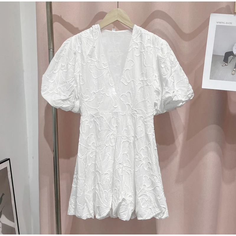 Model Number: Embroidered Fluffy Short Puff Sleeve Dress