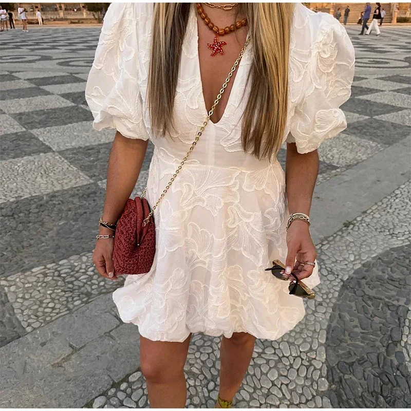Yipinpay Fluffy Short Puff Sleeve Dress Women White High Waist V-neck Mini Dresses 2024 Summer New Ladies Elegant Vestidos