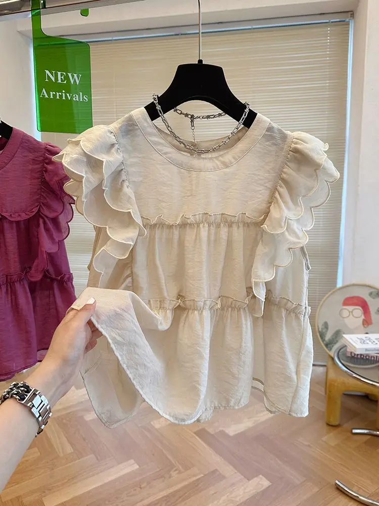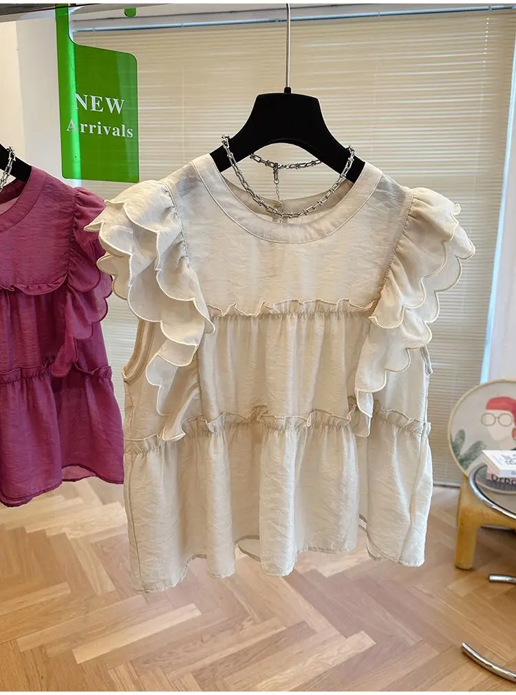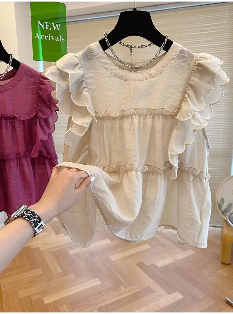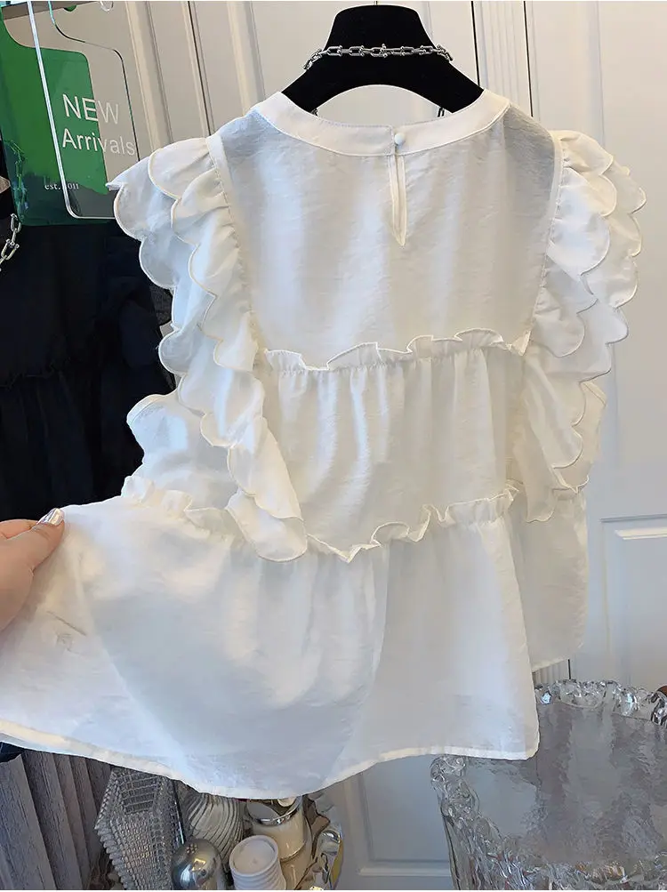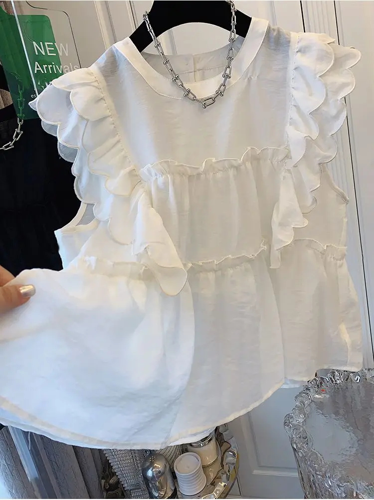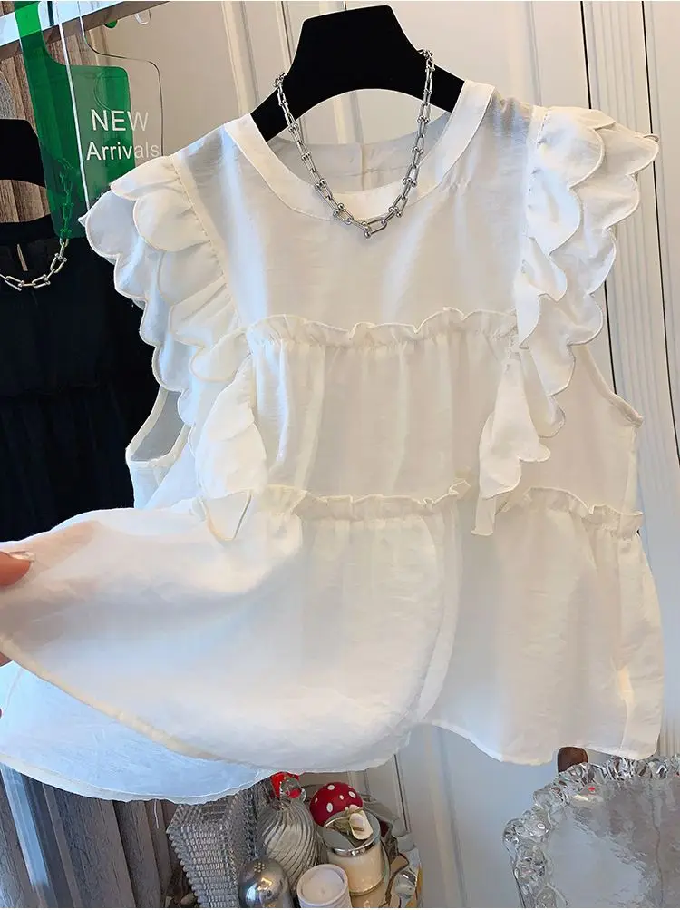 Yipinpay Fly Sleeve Round Neck Shirts for Women Summer Sweet Doll Shirt Loose Niche Sleeveless Top Blusas White Shirt Blouses