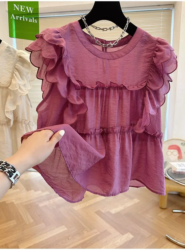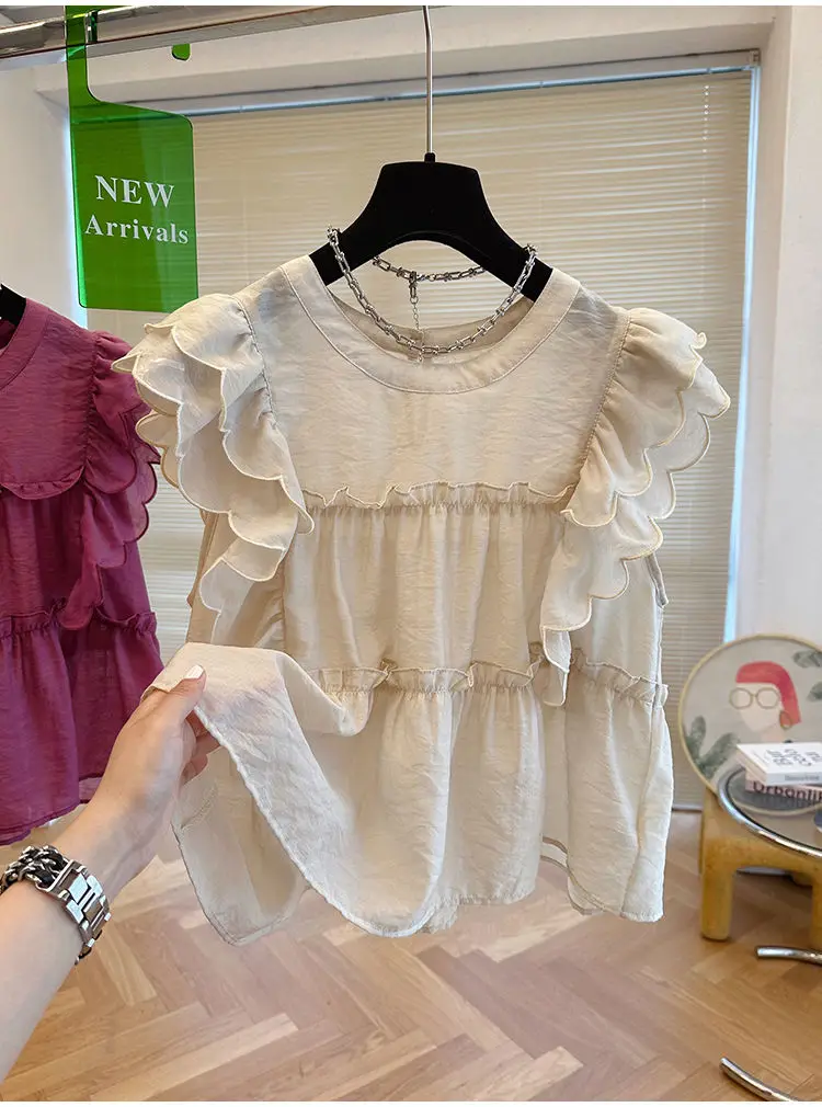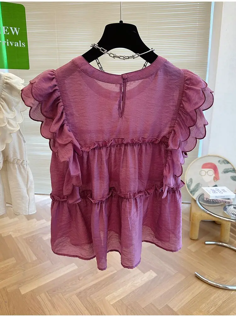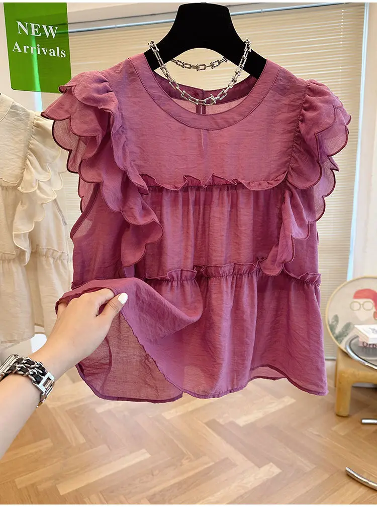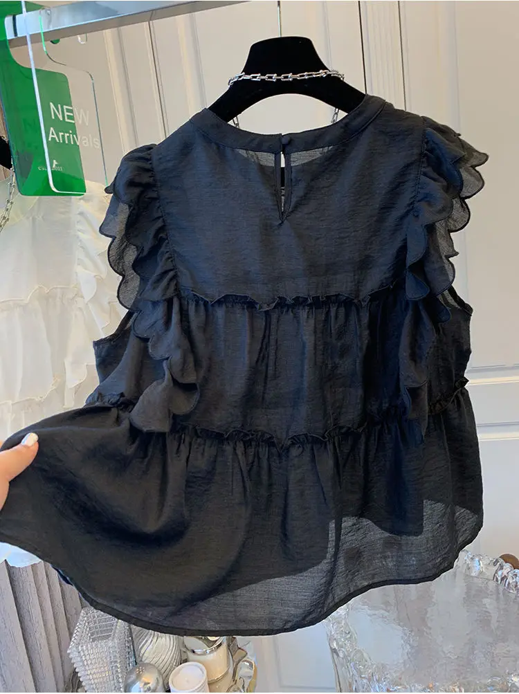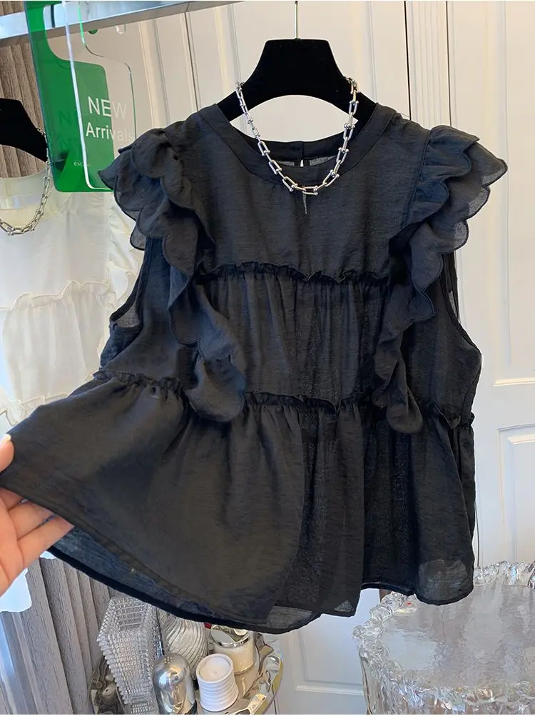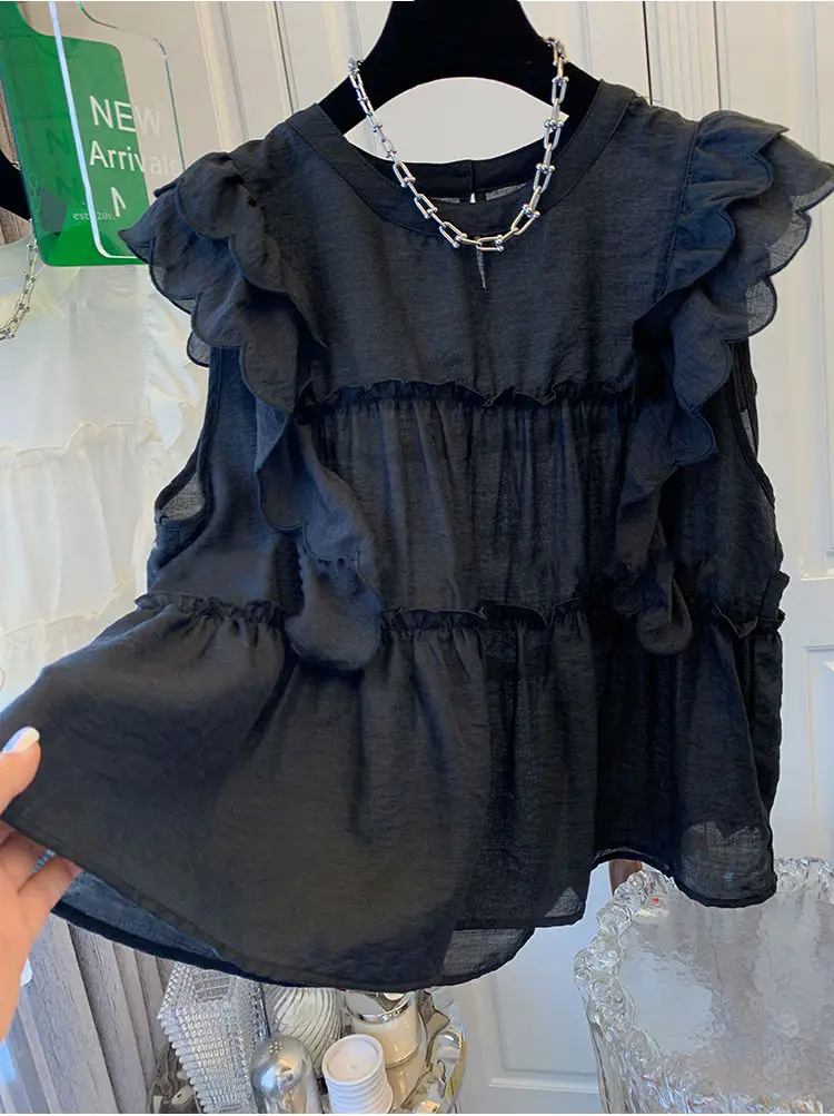 Yipinpay Fly Sleeve Round Neck Shirts for Women Summer Sweet Doll Shirt Loose Niche Sleeveless Top Blusas White Shirt Blouses