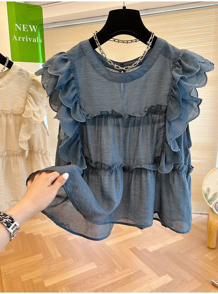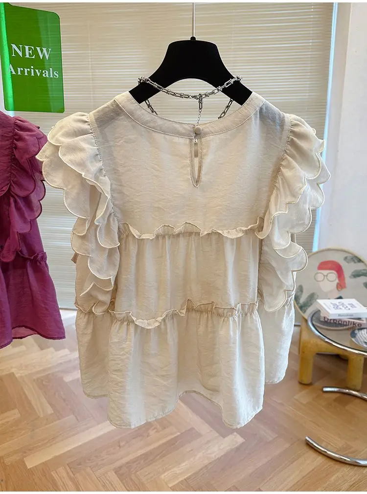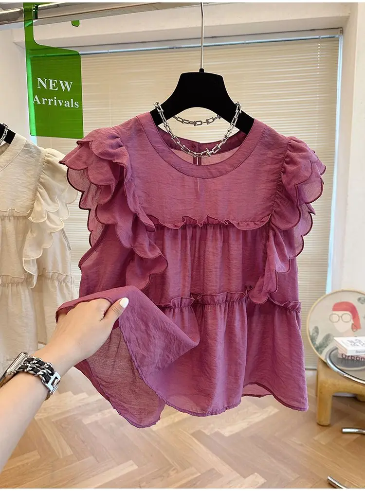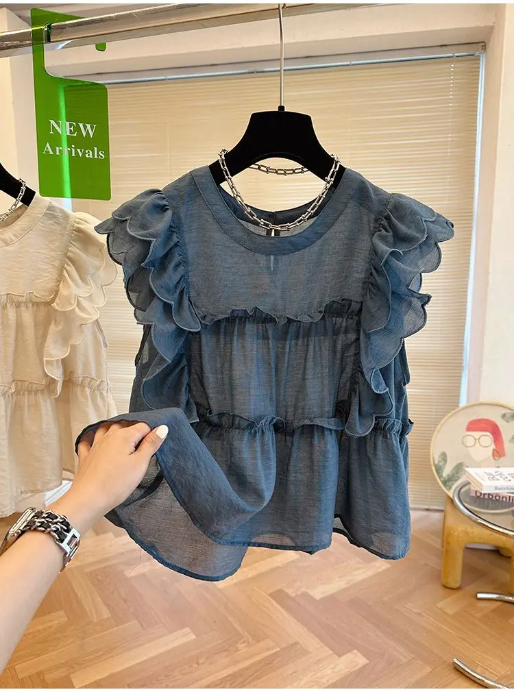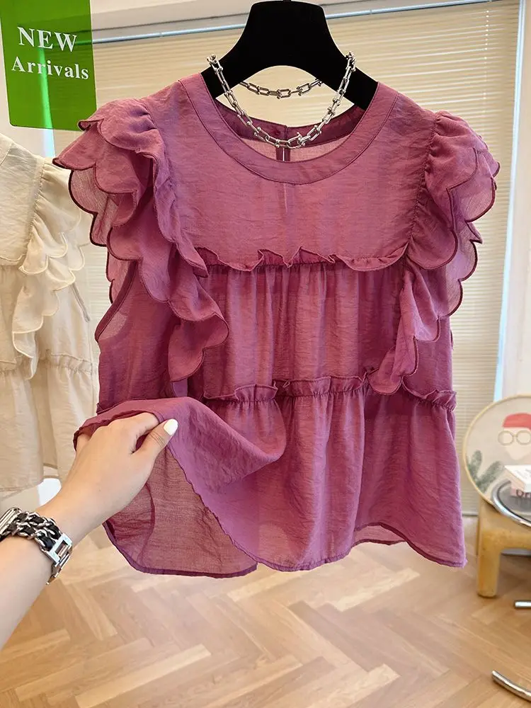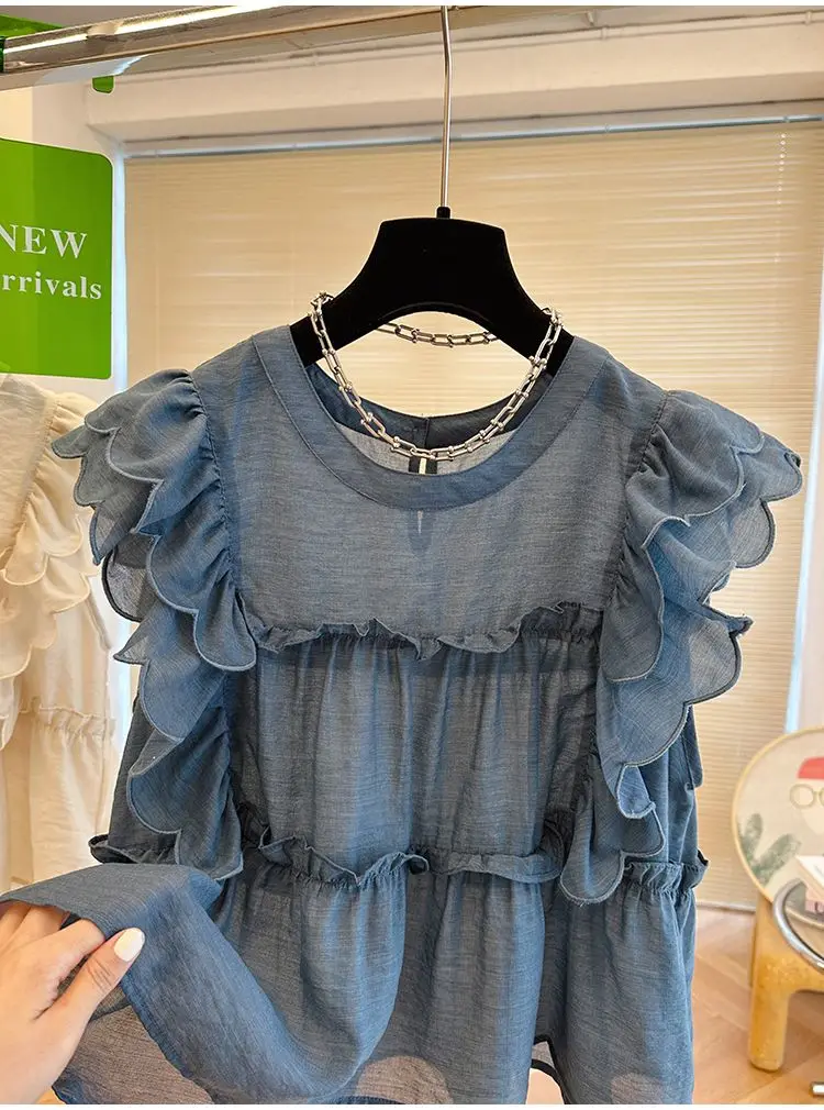 Yipinpay Fly Sleeve Round Neck Shirts for Women Summer Sweet Doll Shirt Loose Niche Sleeveless Top Blusas White Shirt Blouses