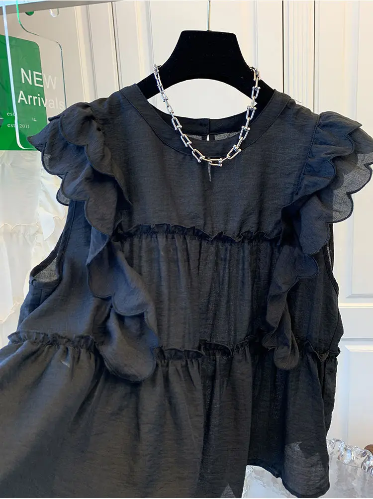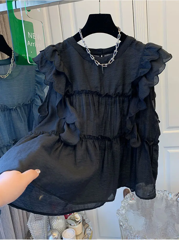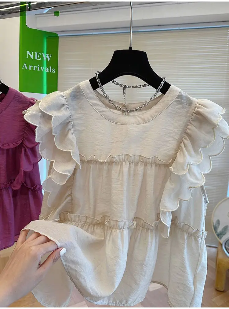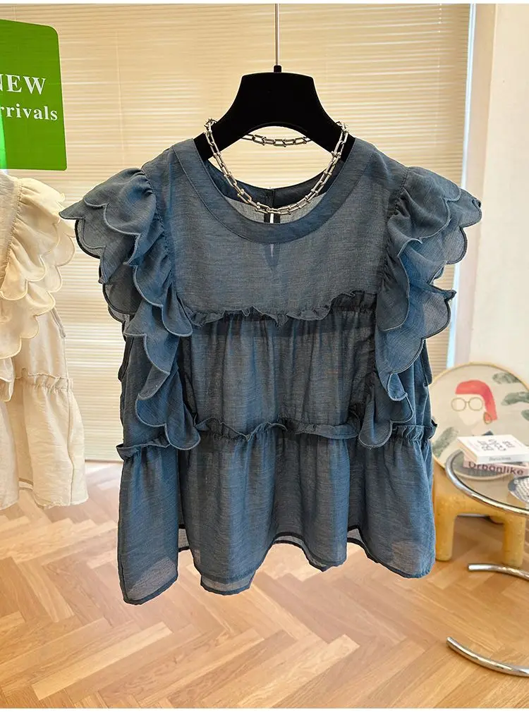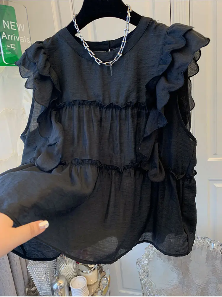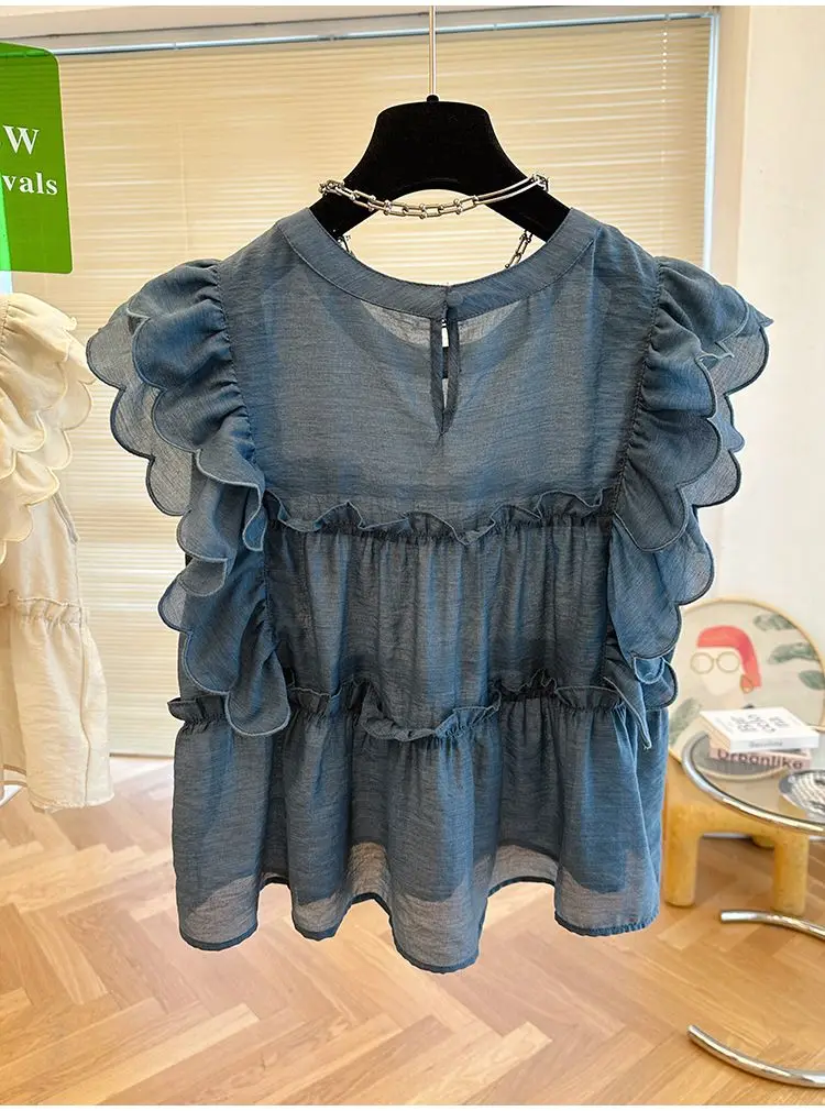 Yipinpay Fly Sleeve Round Neck Shirts for Women Summer Sweet Doll Shirt Loose Niche Sleeveless Top Blusas White Shirt Blouses