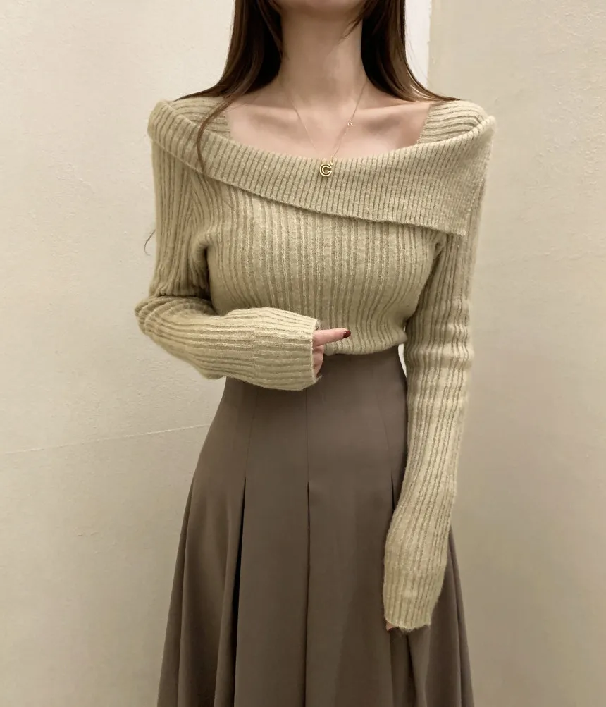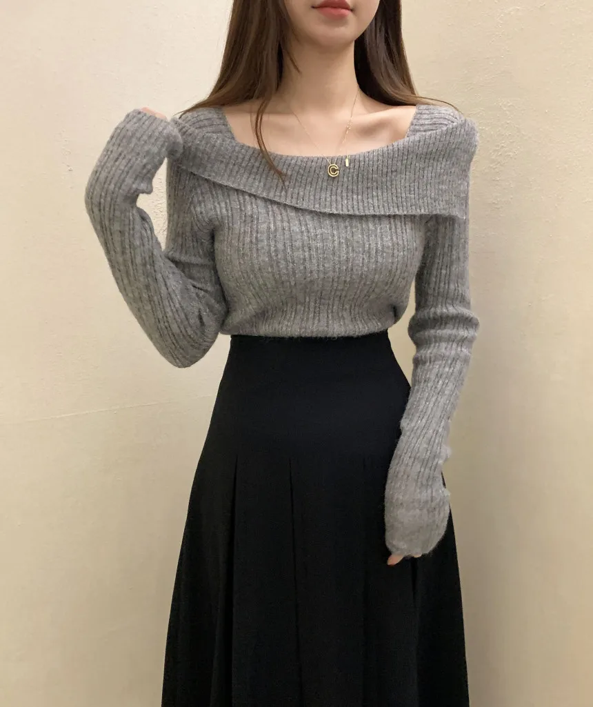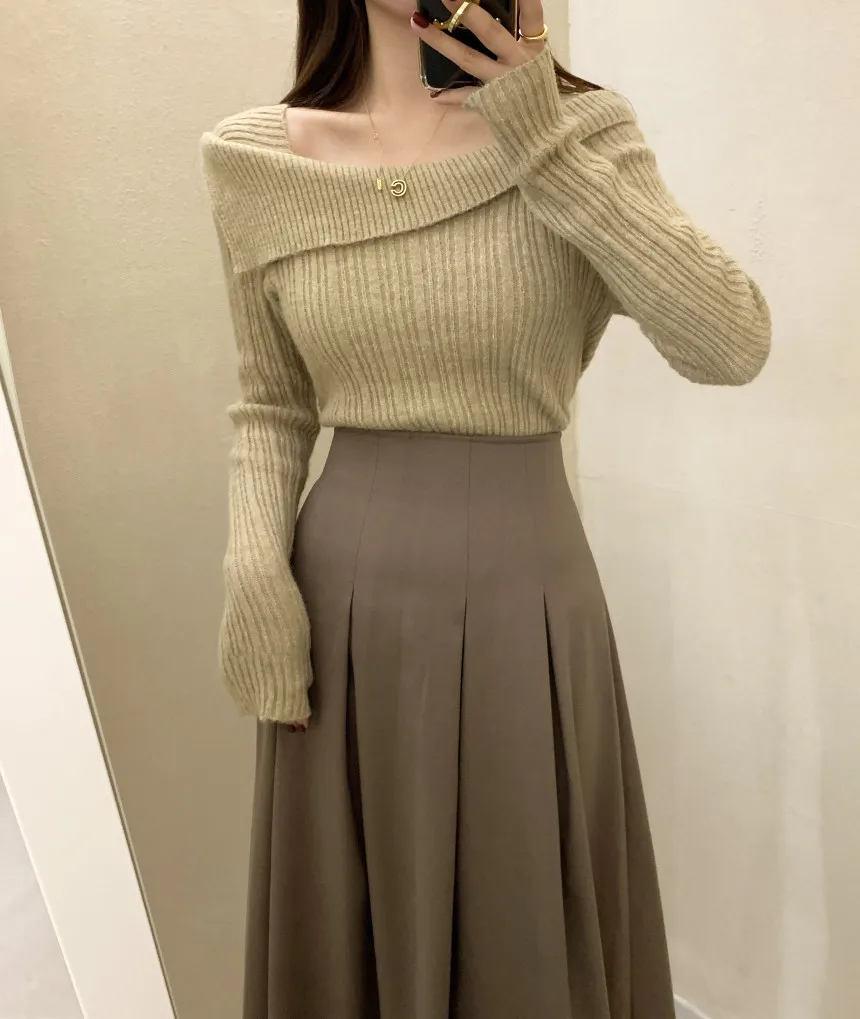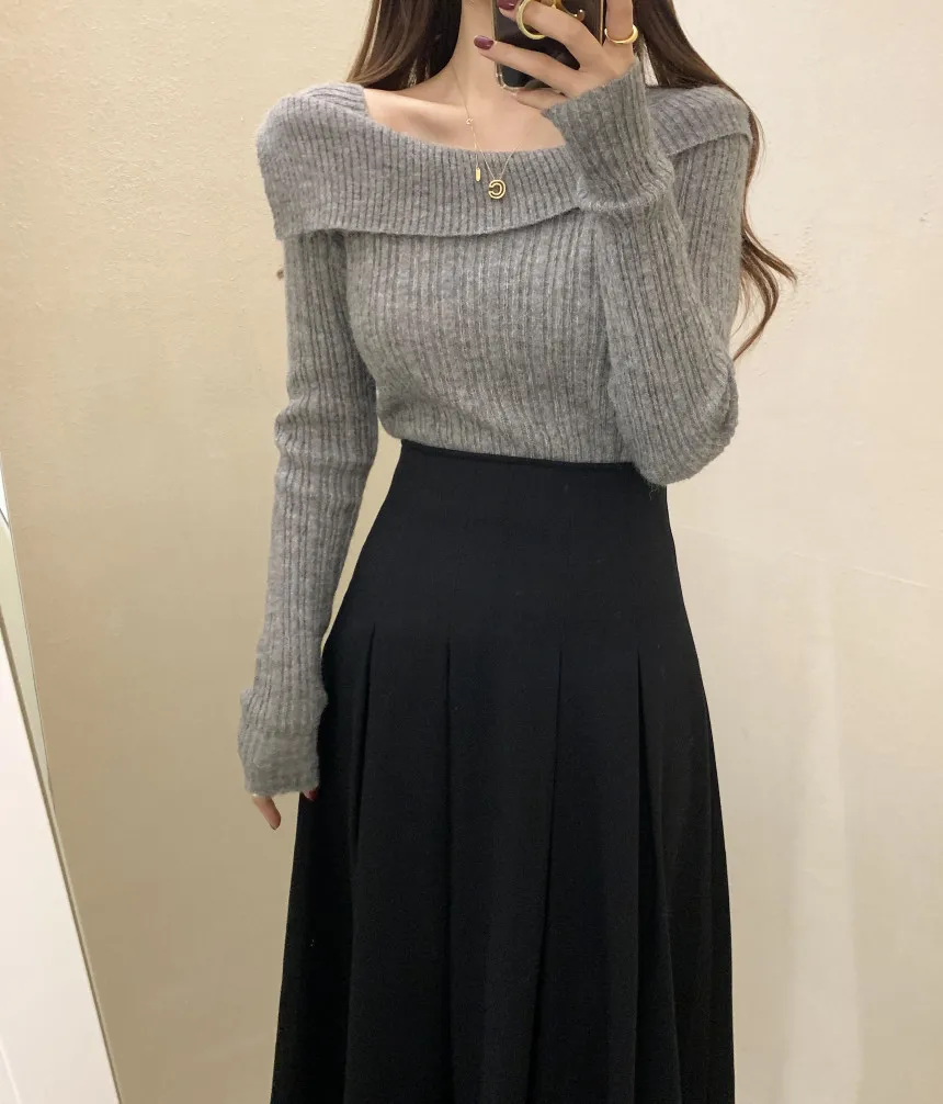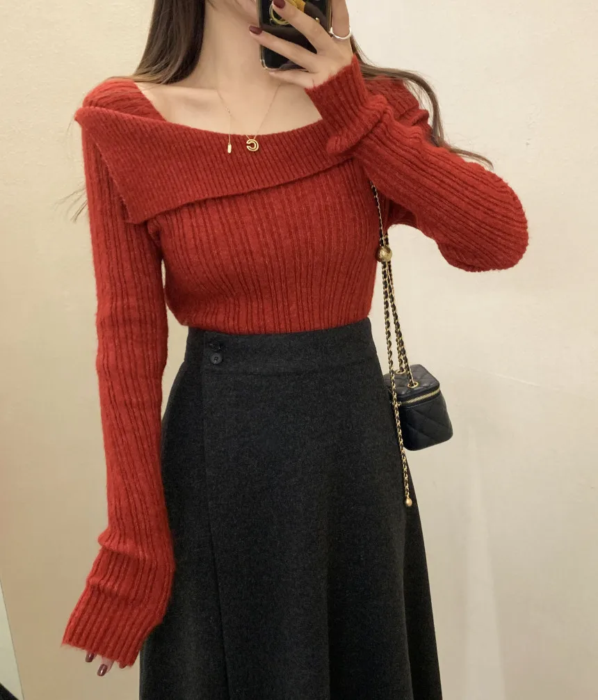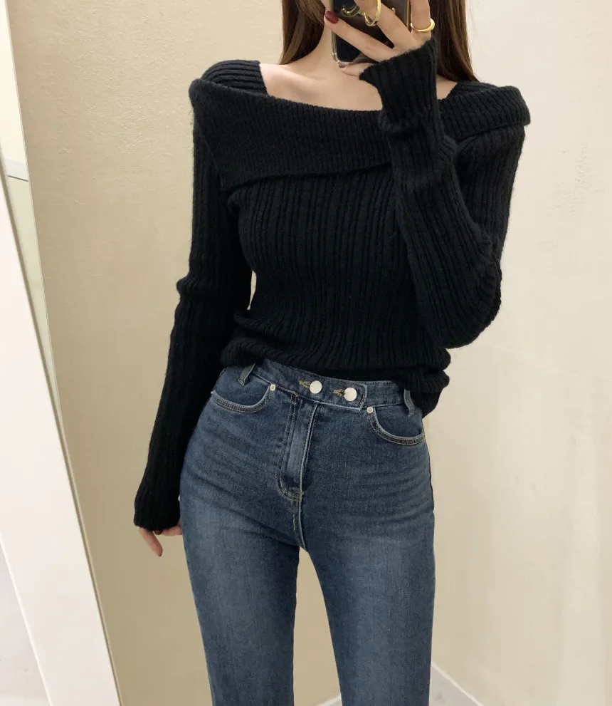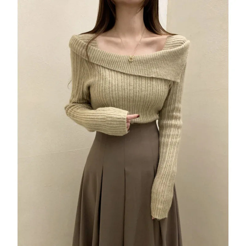 Yipinpay for Women 2023 Diagonal Collar Off Shoulder Solid Slim Pull Femme Y2k Top Sueter Mujer Long Sleeve Black Sweater Knitwear