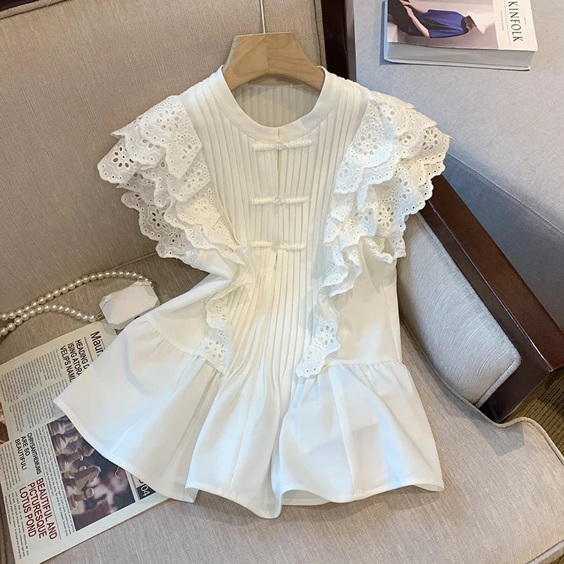 Yipinpay for Women Temperament Chinese Stand Flying Sleeve White Shirt Femme Crop Tops Blusa Feminina Ruffle Doll Blouse Mujer