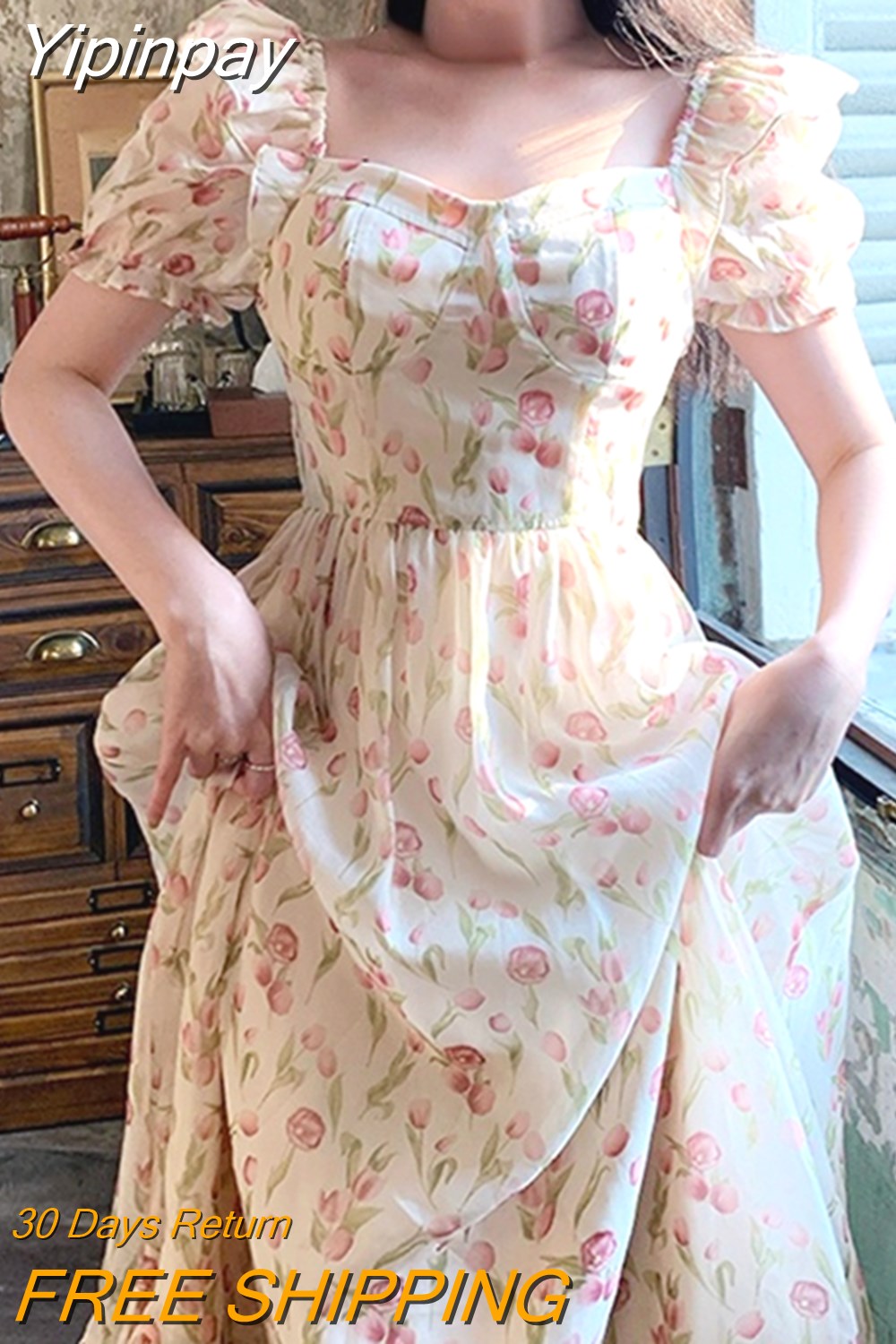 Yipinpay French Elegant Floral Midi Dress Beach Vintage Puff Sleeve Dress Women Party One Piece Dress Korean Fashion Summer 2023