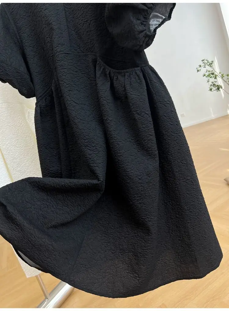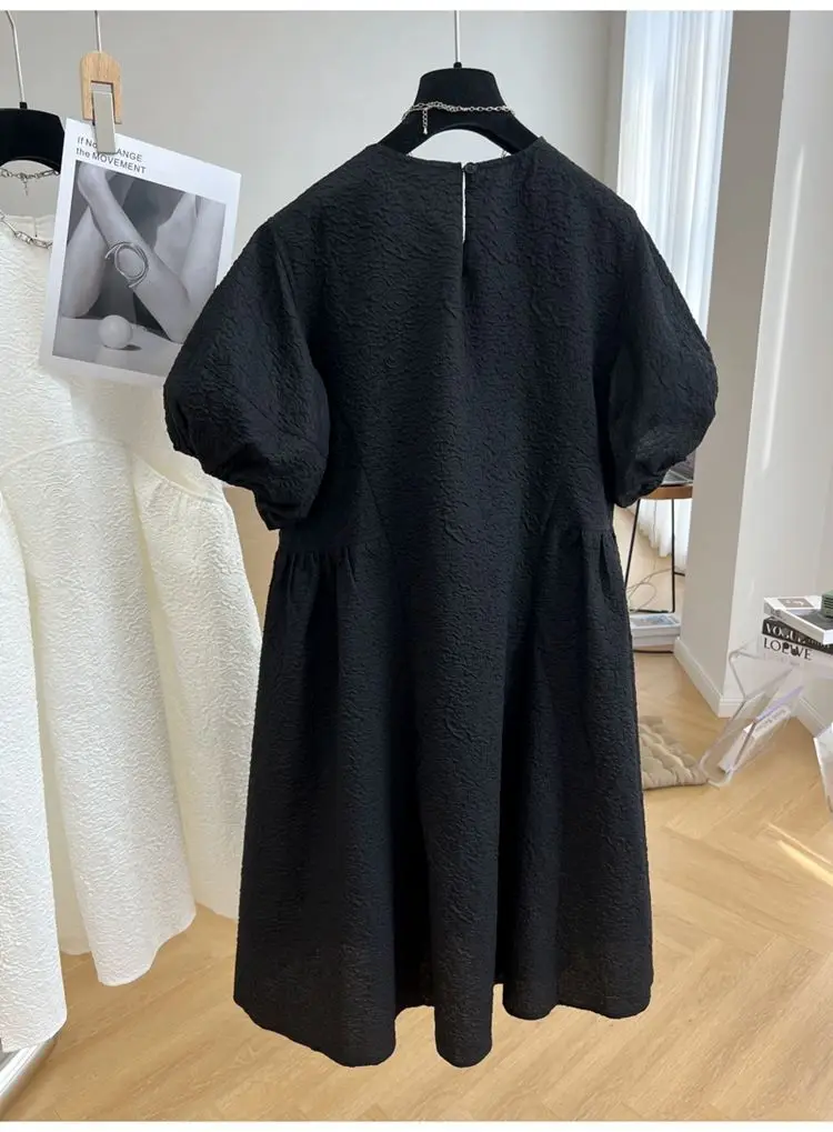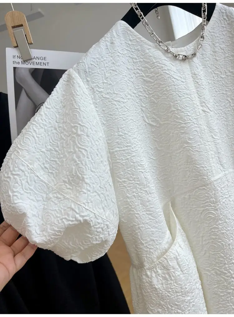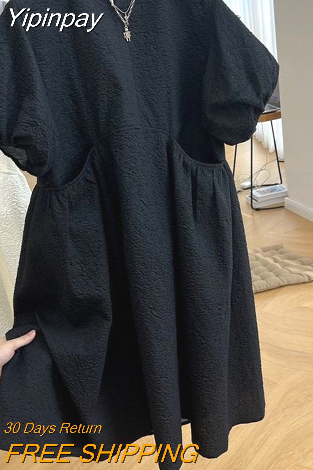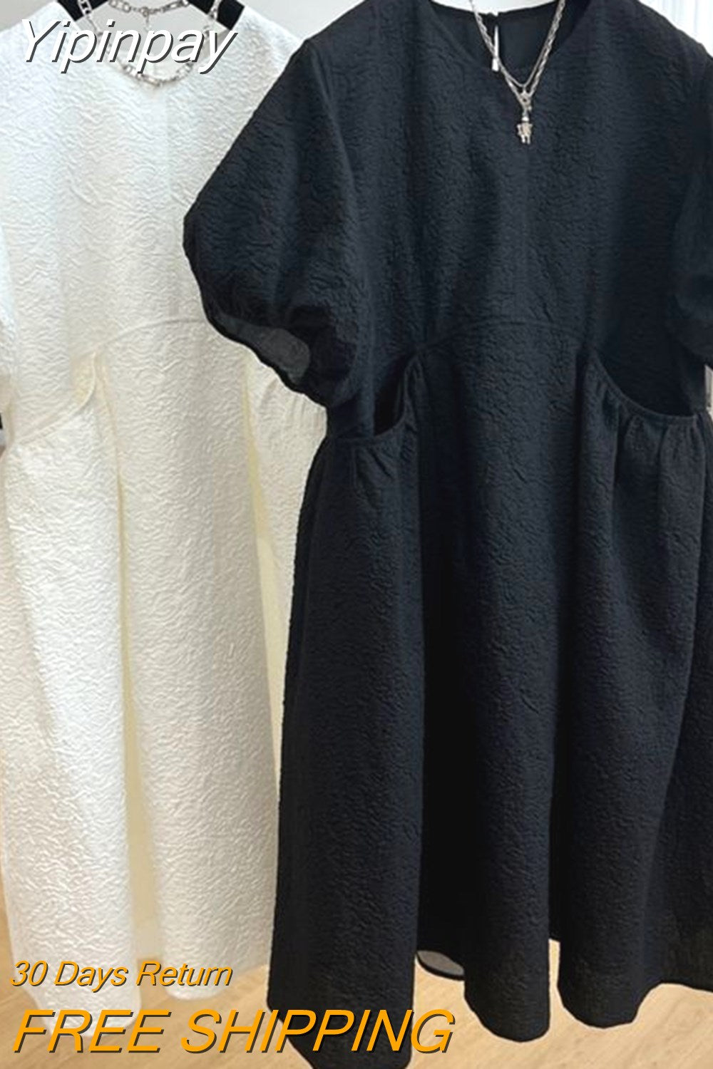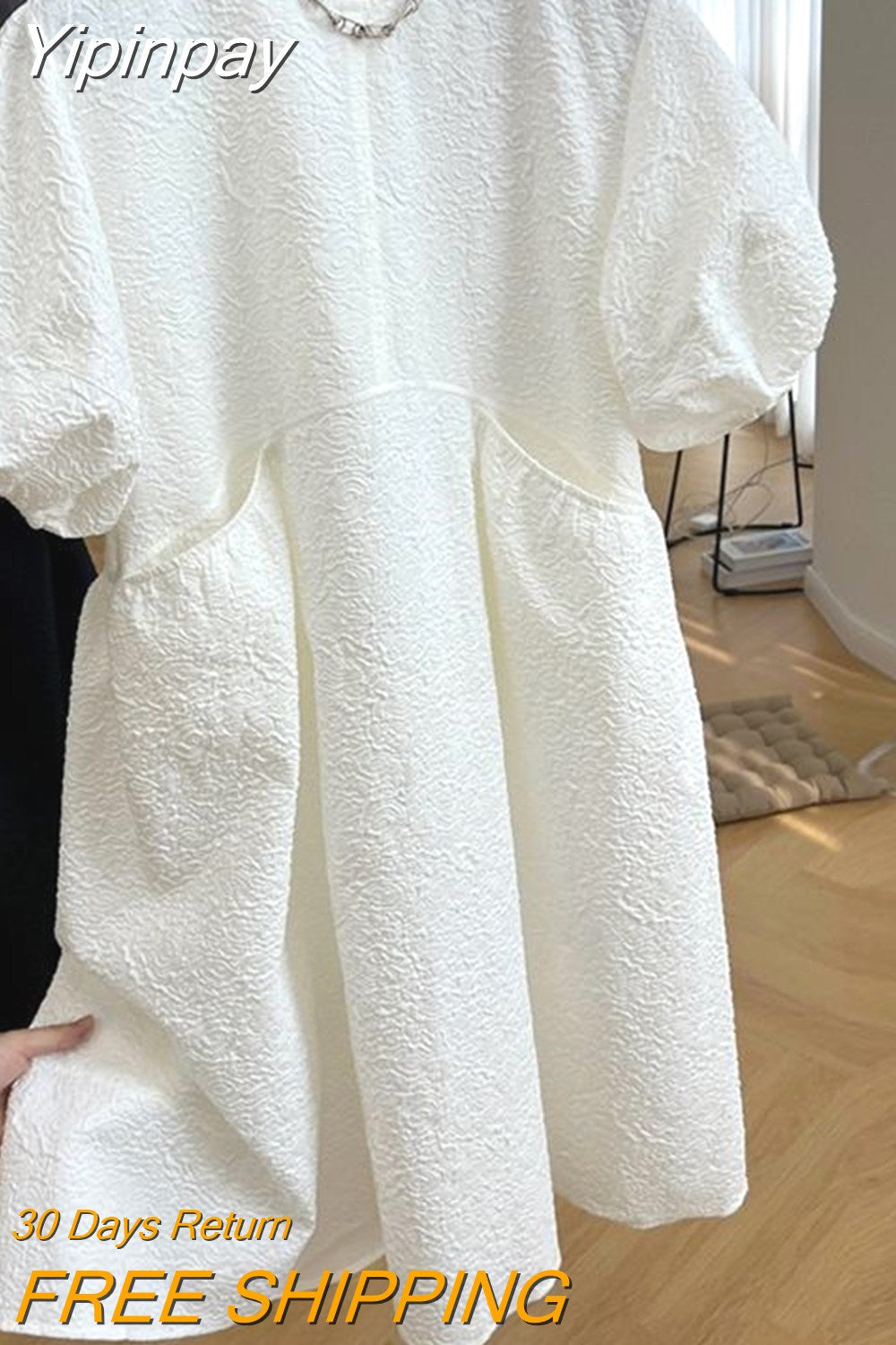 Yipinpay French Loose Jacquard Lantern Short Sleeve Dress for Women Summer Black White Casual Wild Doll Dress Vestidos De Mujer