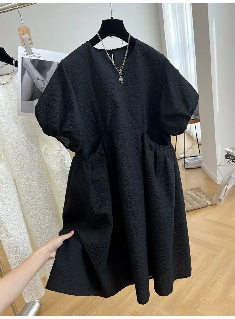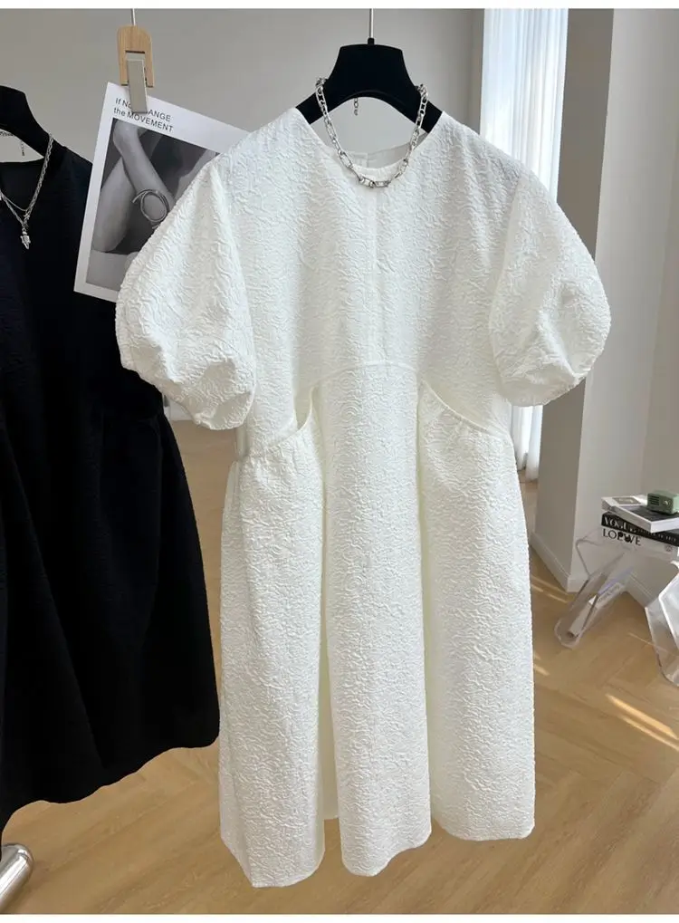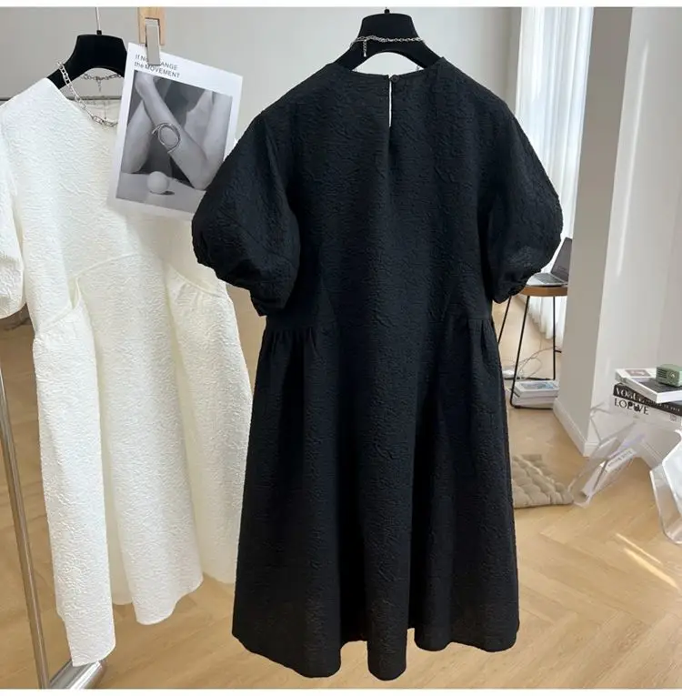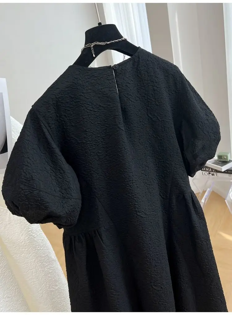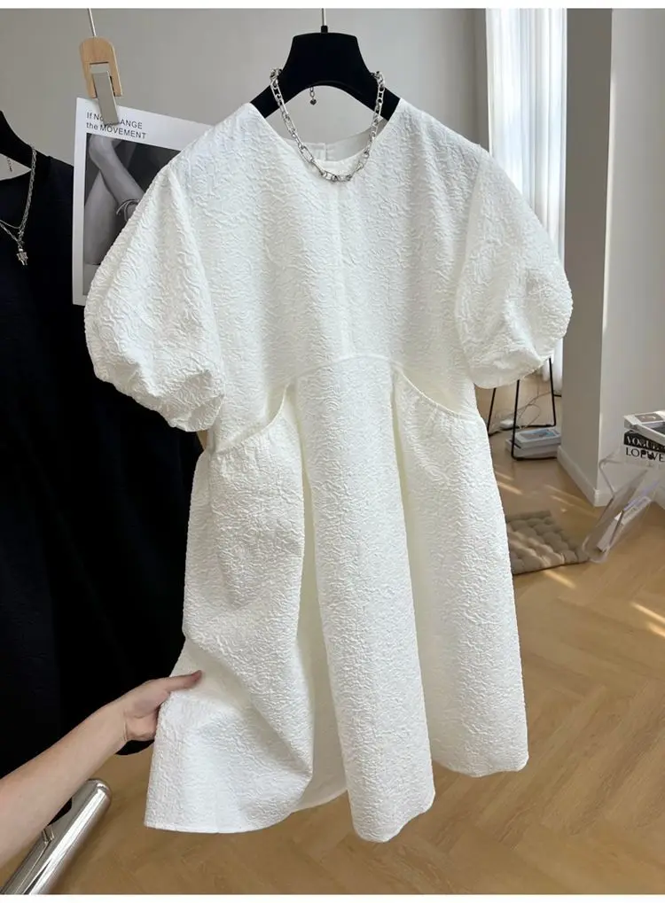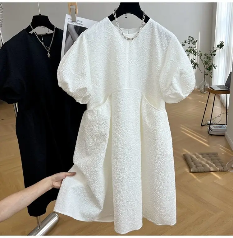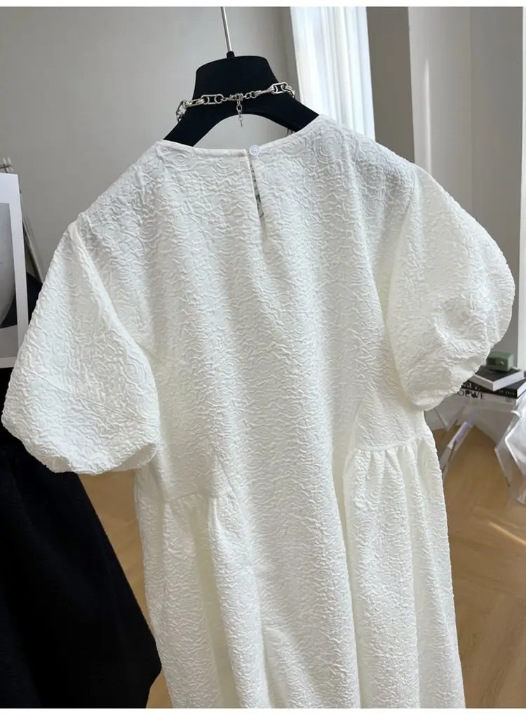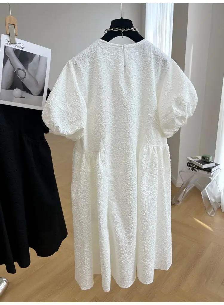 Yipinpay French Loose Jacquard Lantern Short Sleeve Dress for Women Summer Black White Casual Wild Doll Dress Vestidos De Mujer