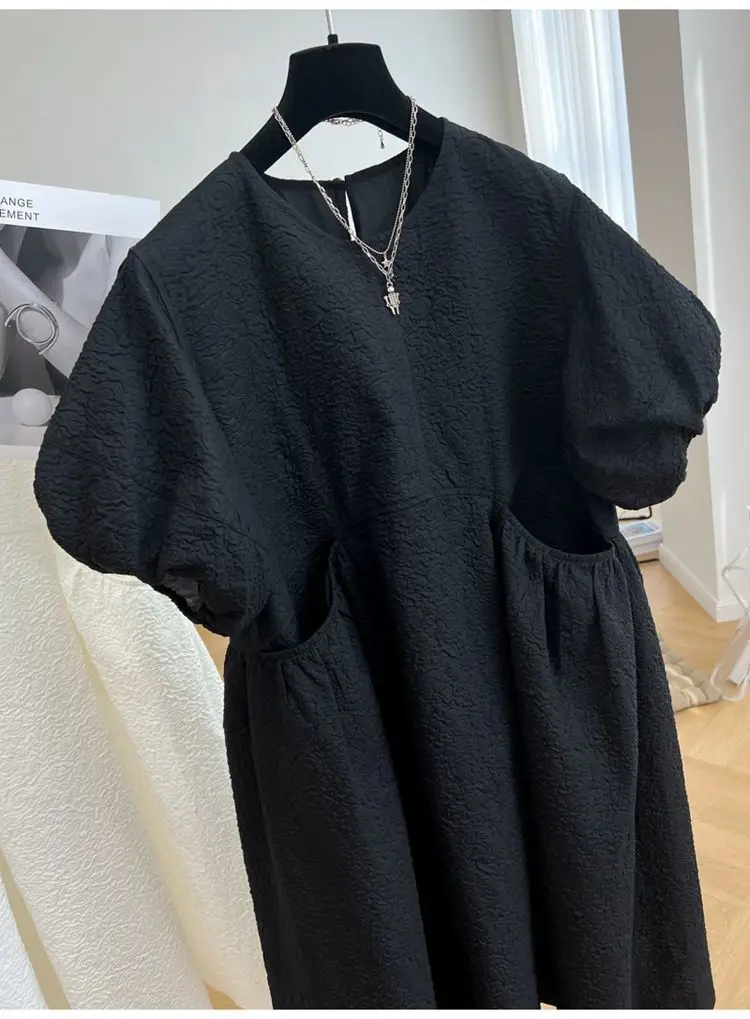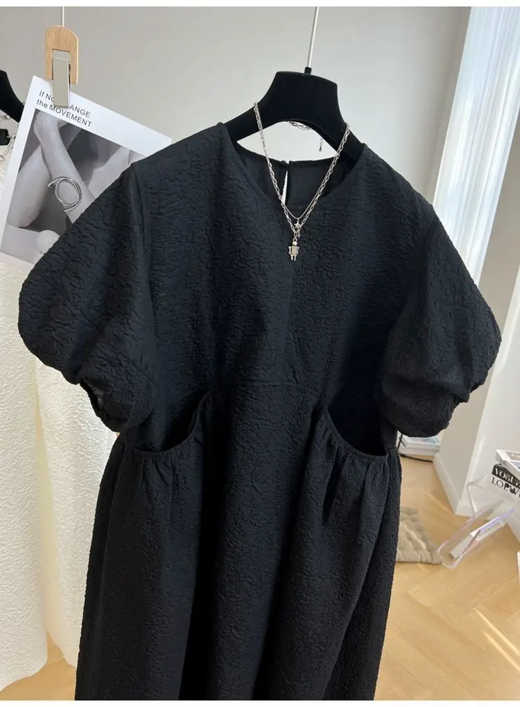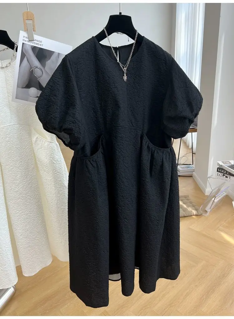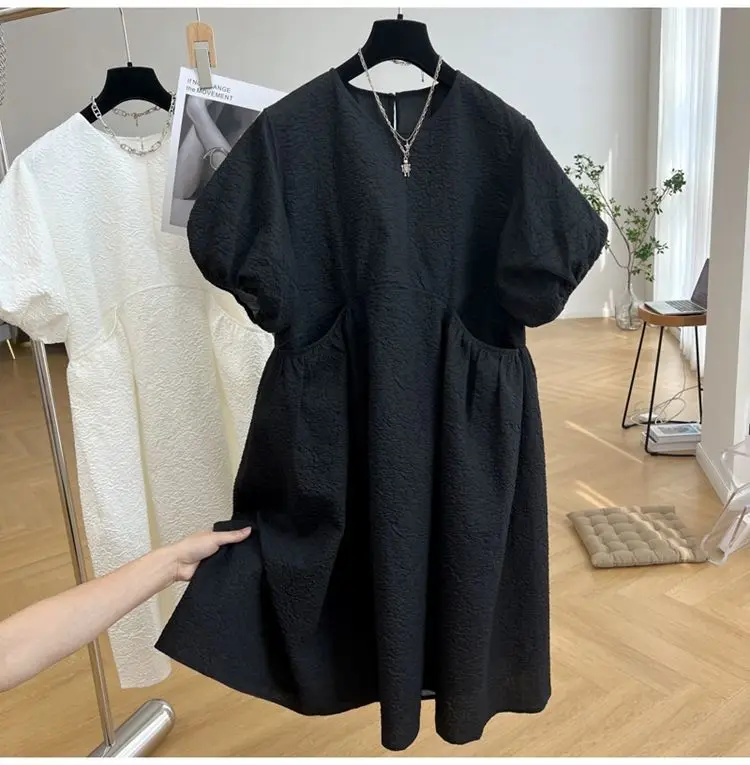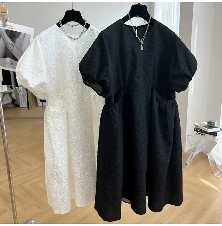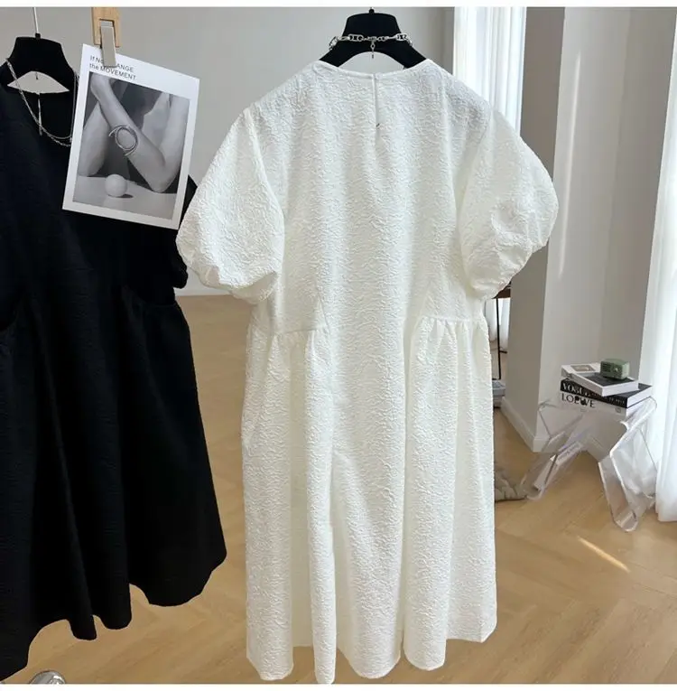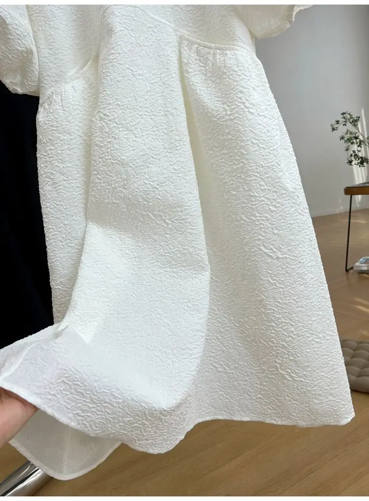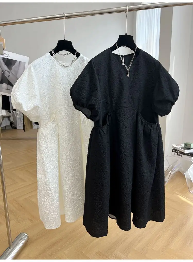 Yipinpay French Loose Jacquard Lantern Short Sleeve Dress for Women Summer Black White Casual Wild Doll Dress Vestidos De Mujer