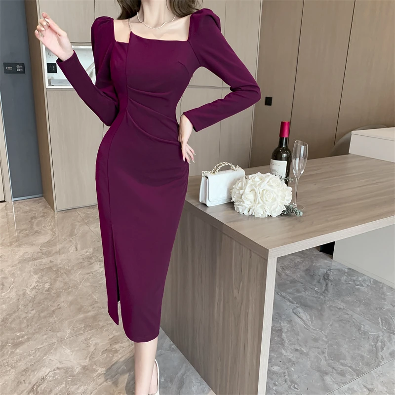 Yipinpay French Style Elegant Dresses Women Sexy Long Sleeve Slash Neck Slim Solid Vintage Dress Ladies Sexy Split Autumn Fashion