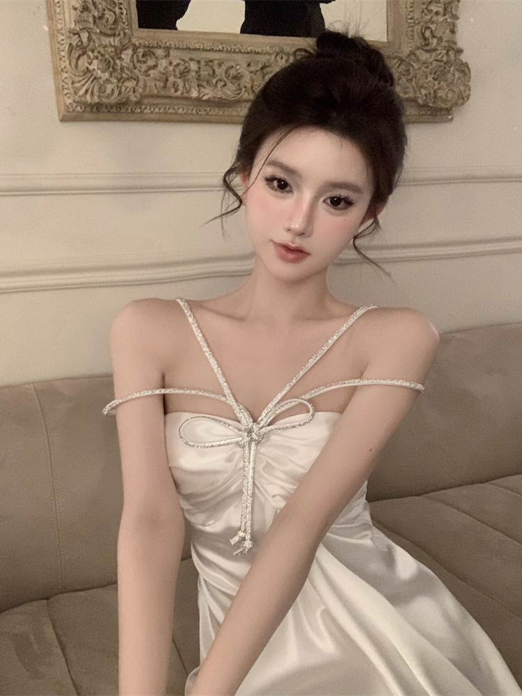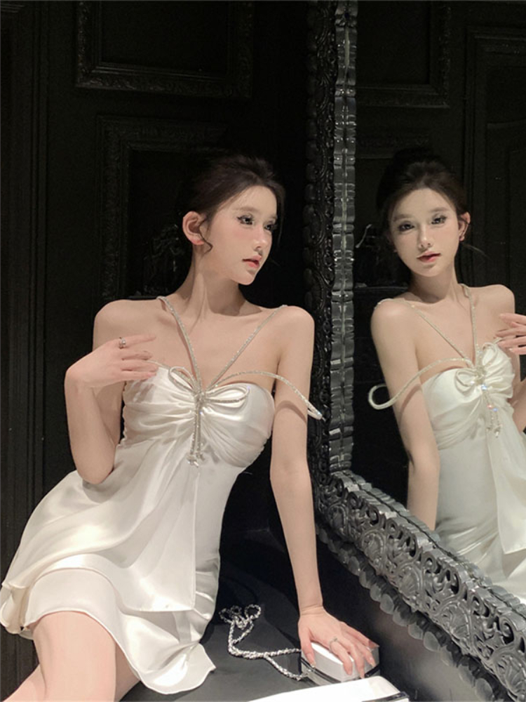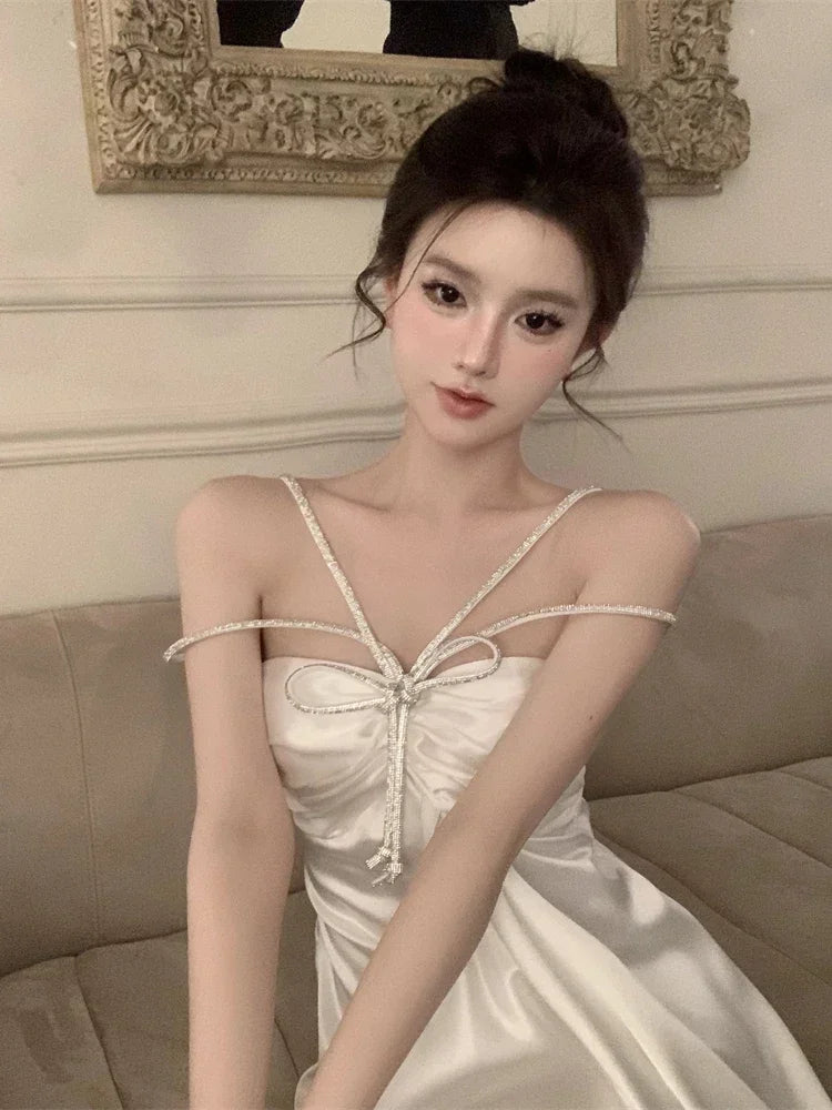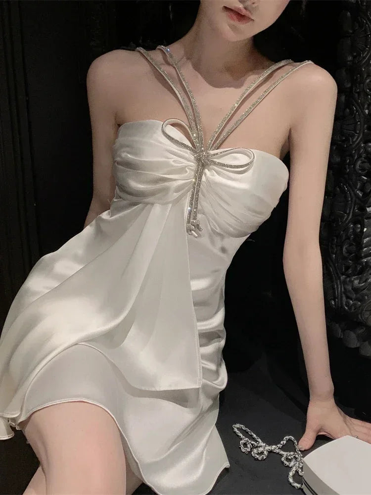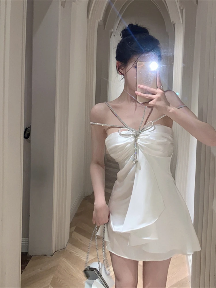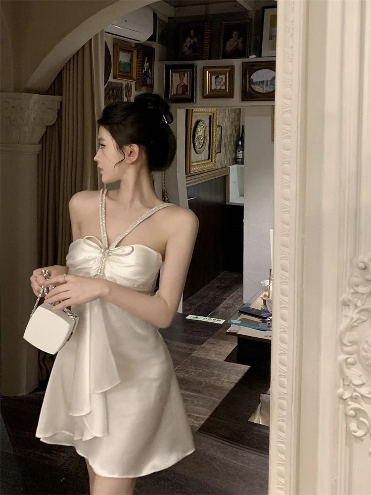 Yipinpay French Style Elegant Dresses Women Sleeveless Rhinestone Bow Patchwork Ruffles Summer Slim Stretch Sexy Dress Party