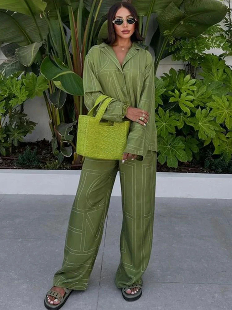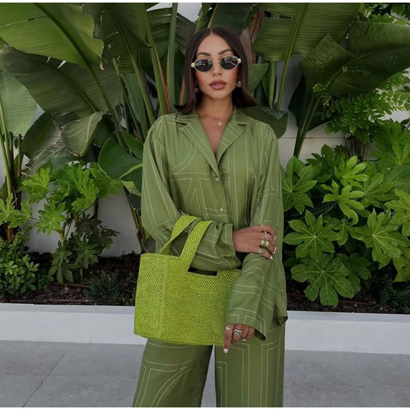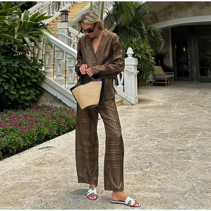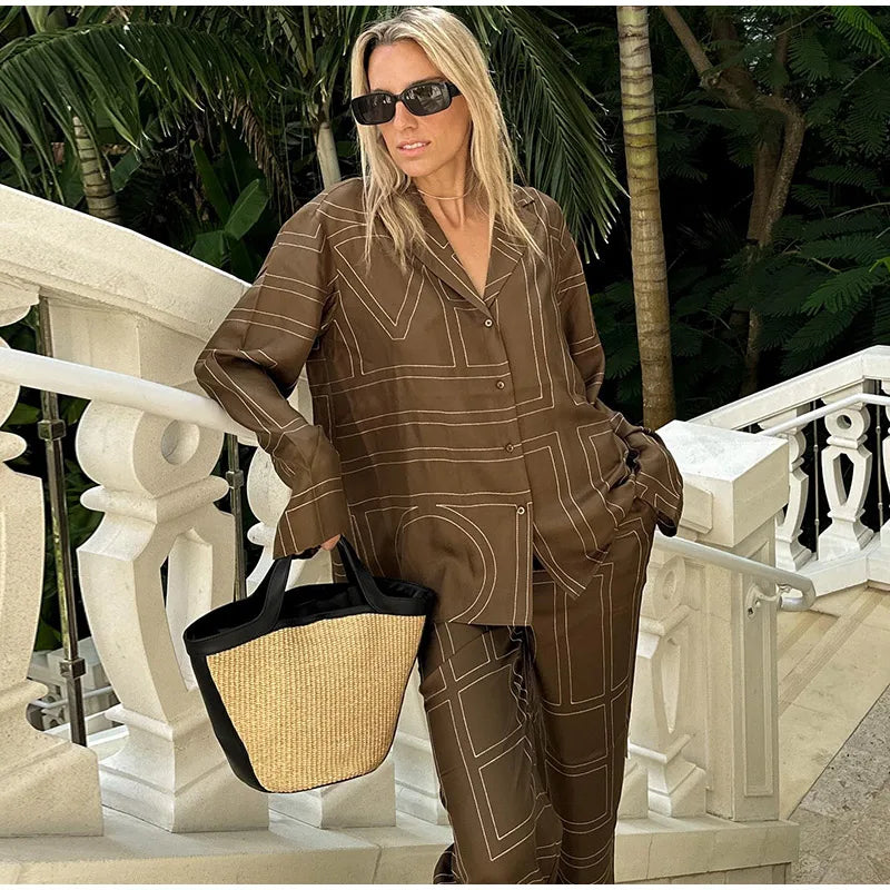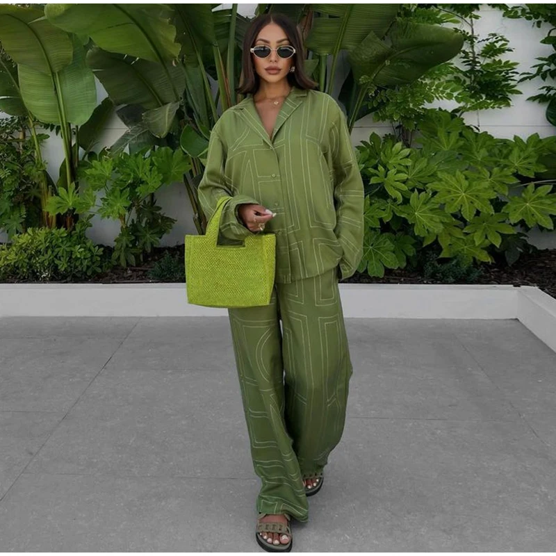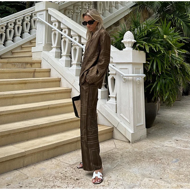 Yipinpay Geometry Print Long Pants Sets For Women Lapel Long Sleeve Single Breasted Shirt Wide Leg Pant 2 Piece Set Lady Street Suits