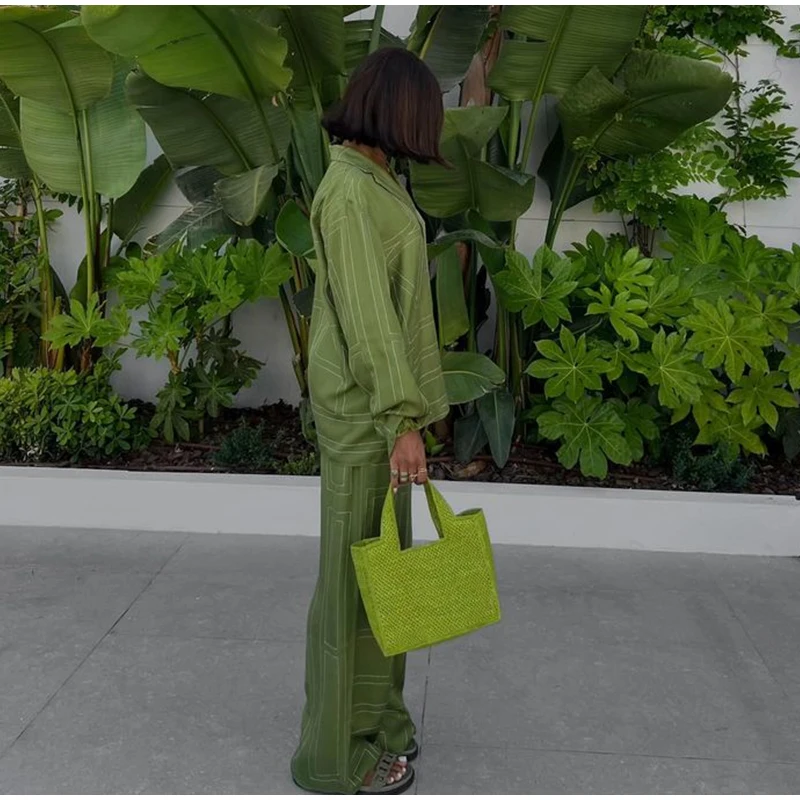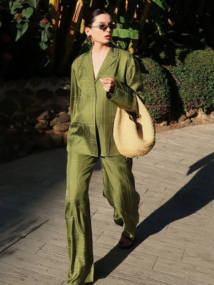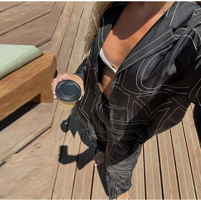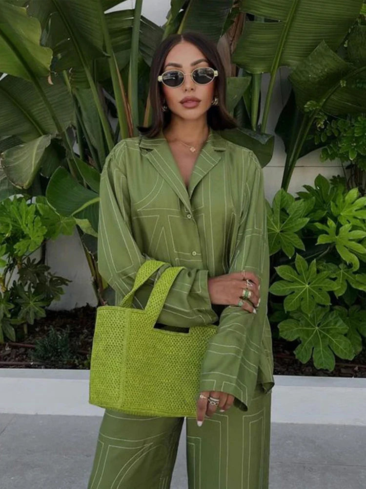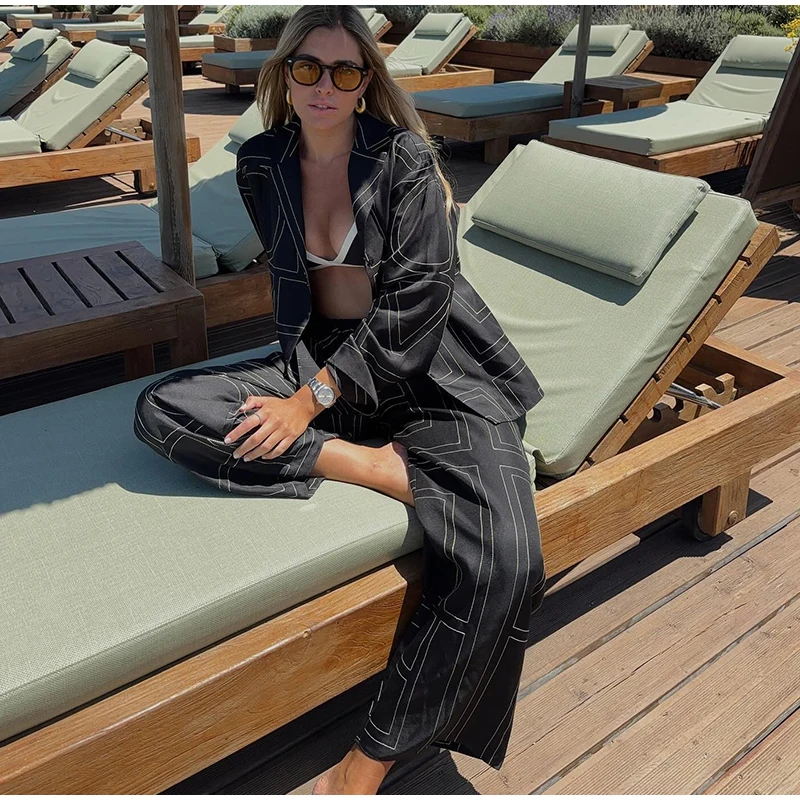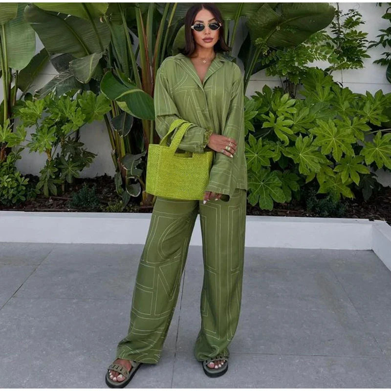 Yipinpay Geometry Print Long Pants Sets For Women Lapel Long Sleeve Single Breasted Shirt Wide Leg Pant 2 Piece Set Lady Street Suits