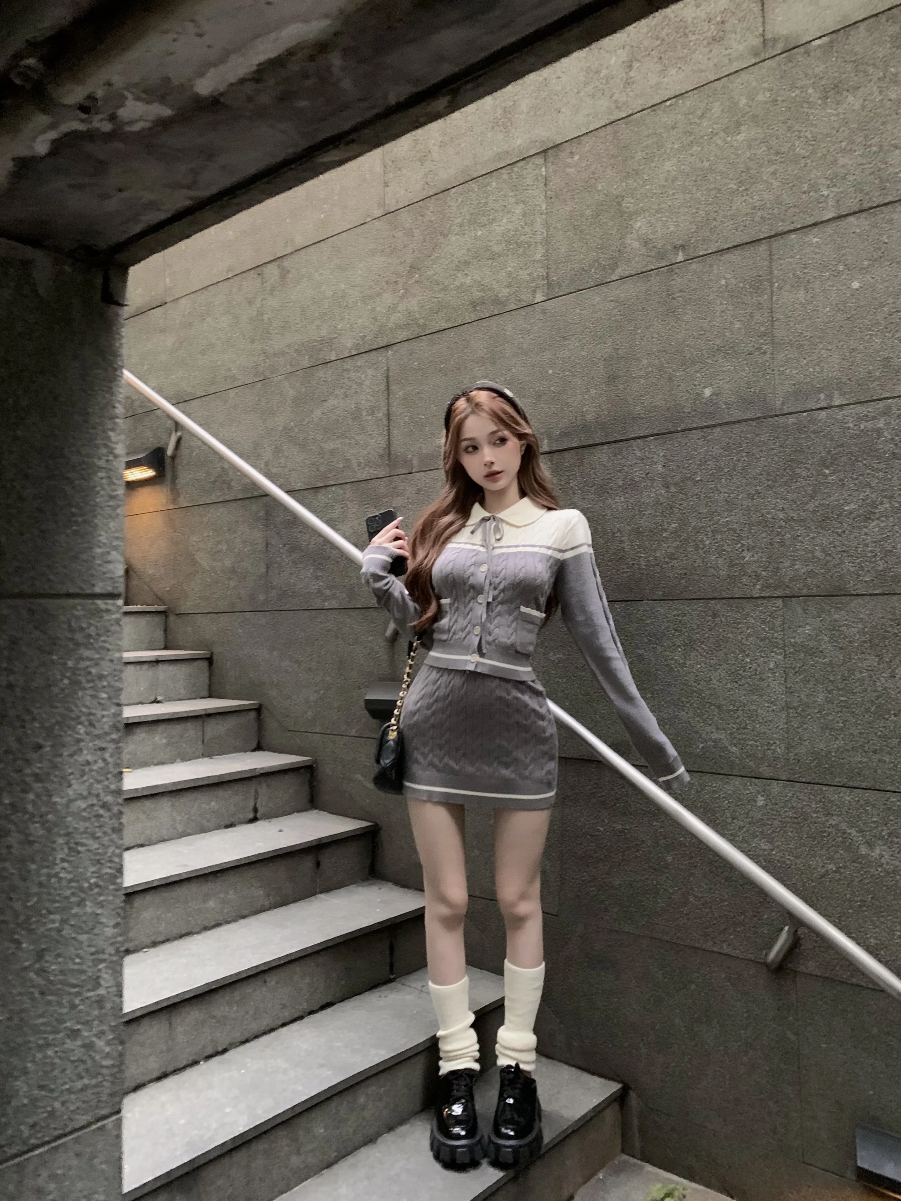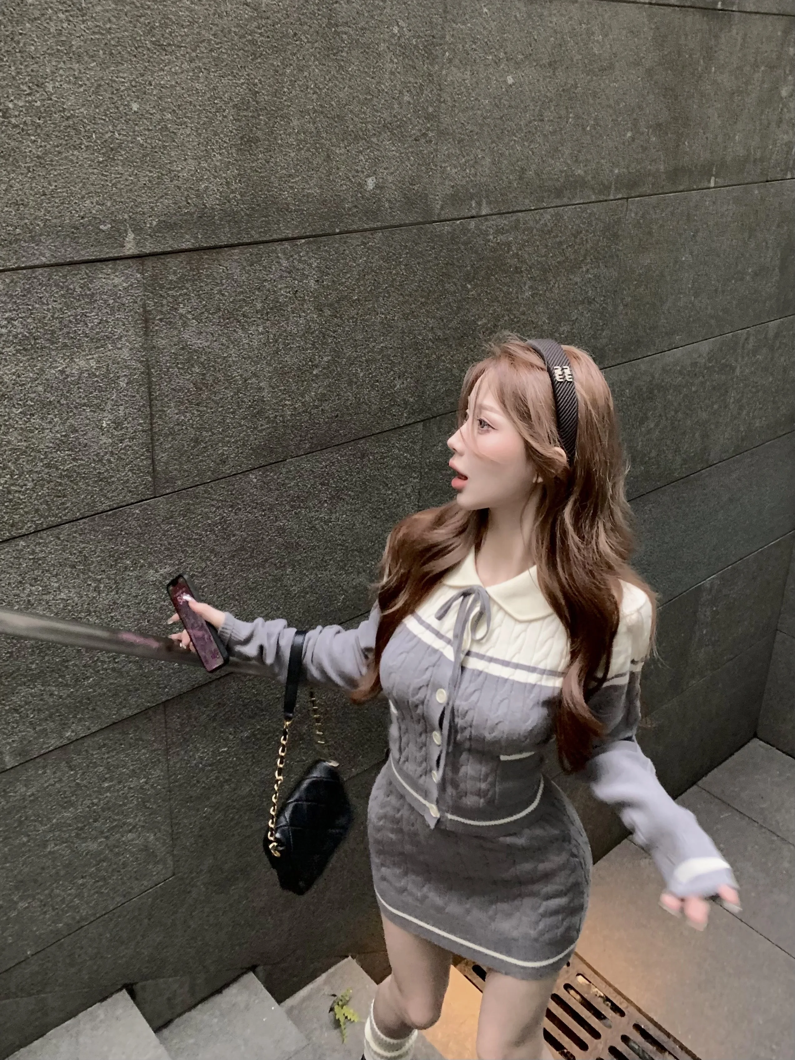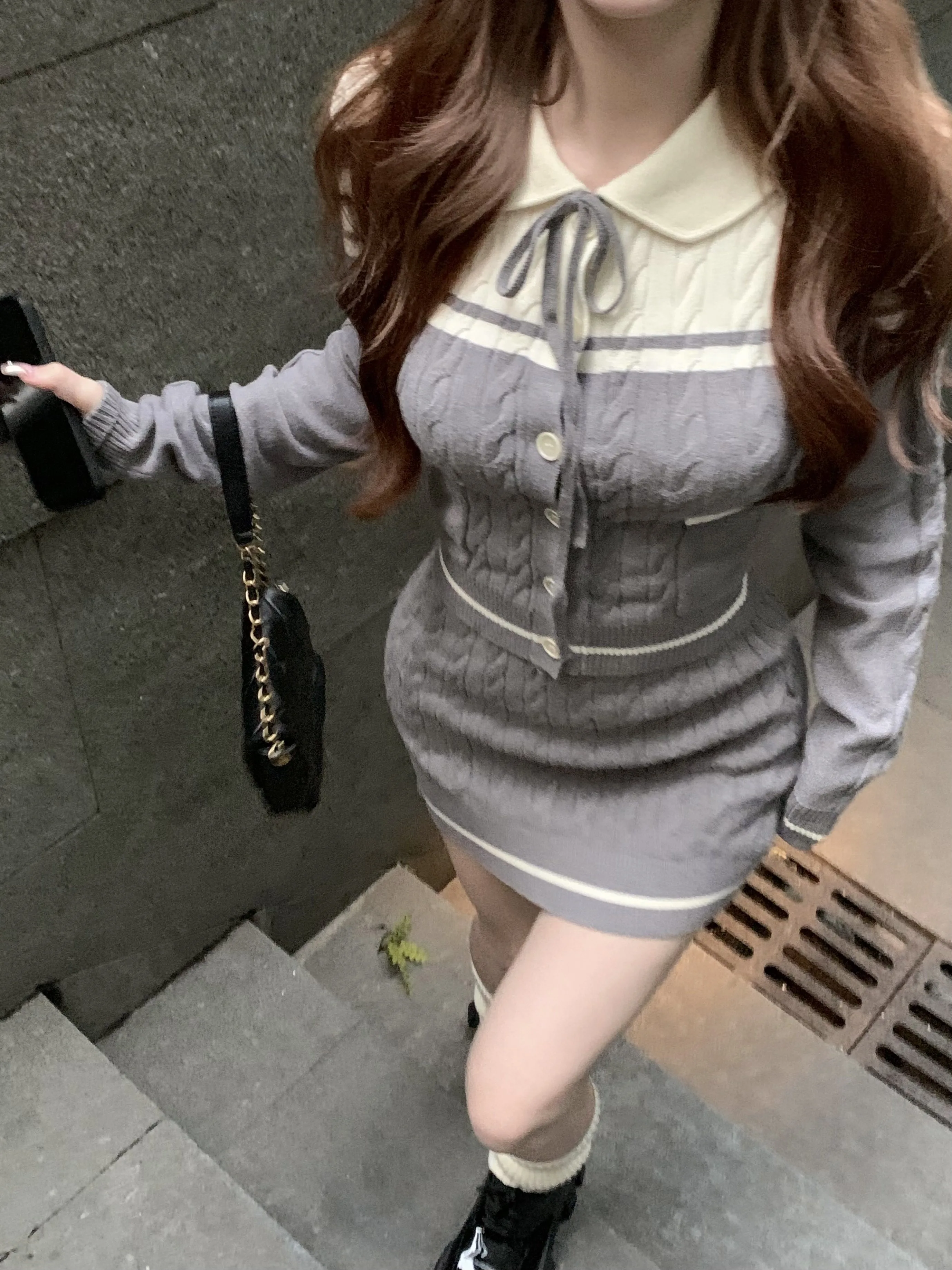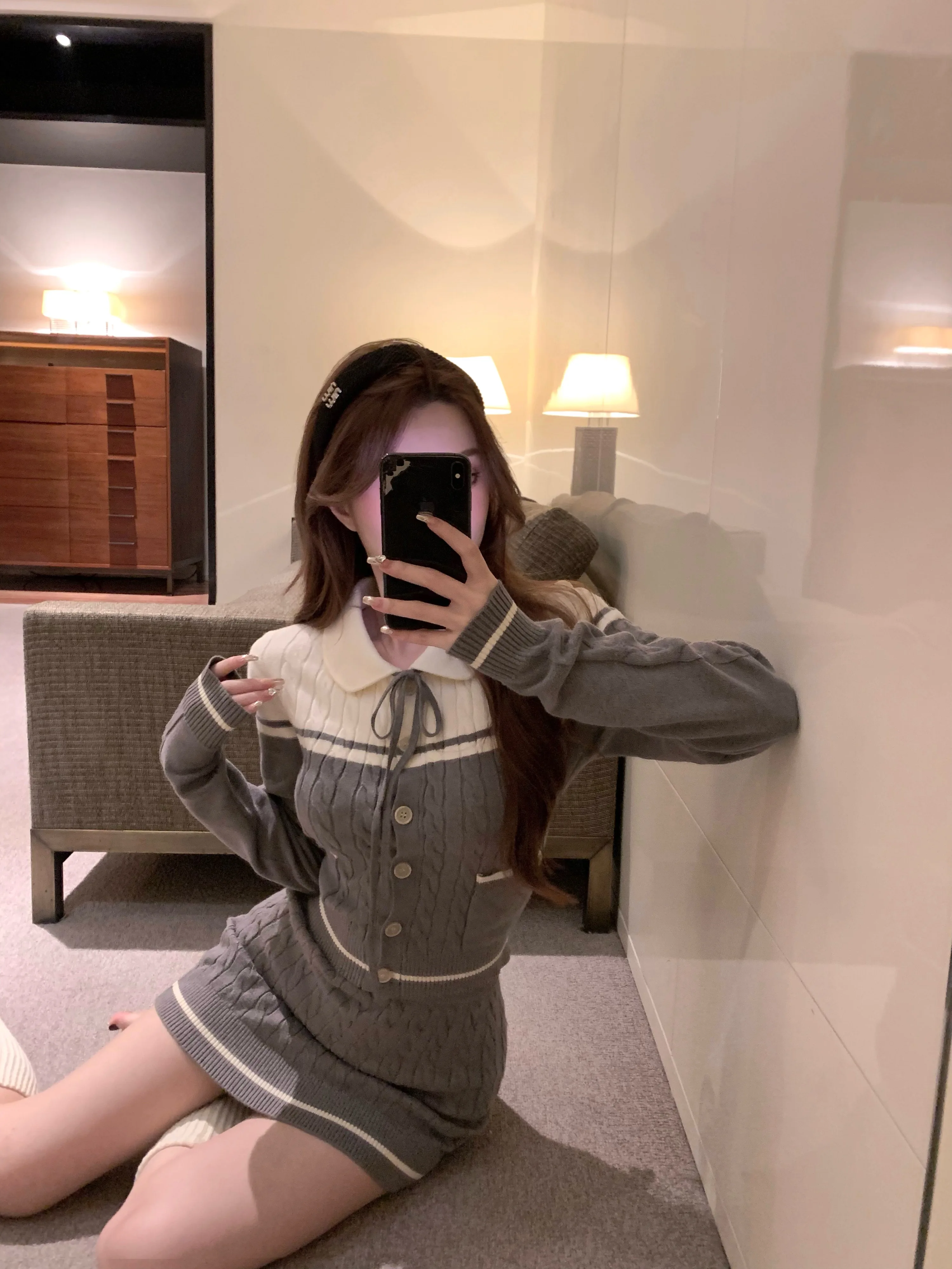 Yipinpay Girl College Style Suit Women's Autumn/Winter Peter Pan Collar Twists Knitted Cardigan Wrap Hip Short Skirt Two-piece Set