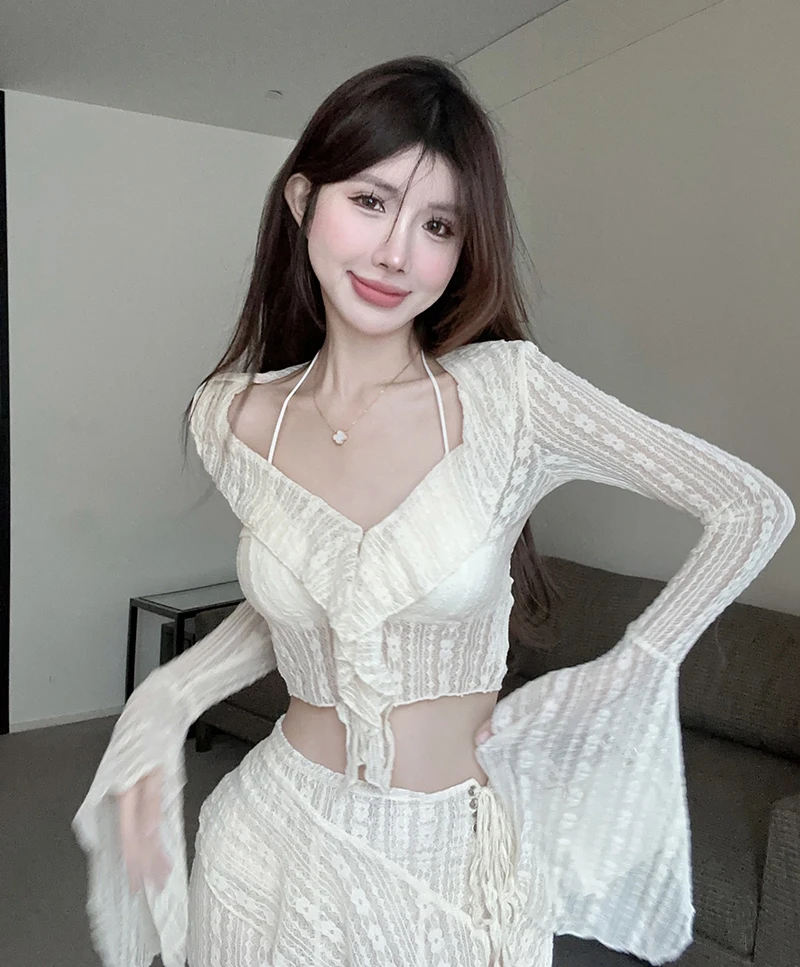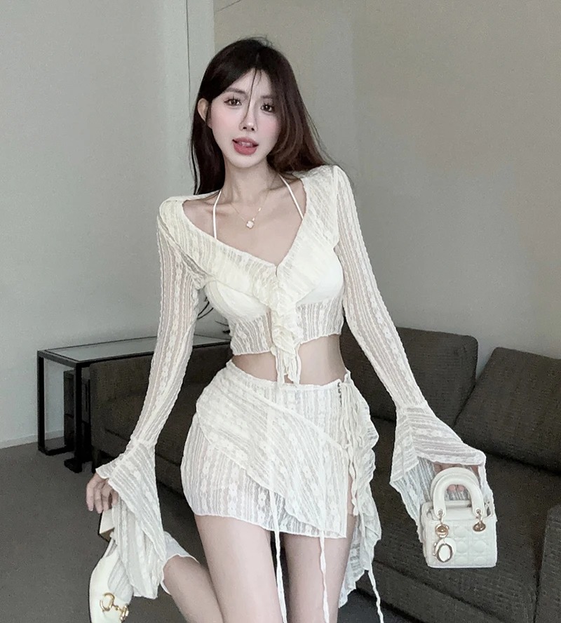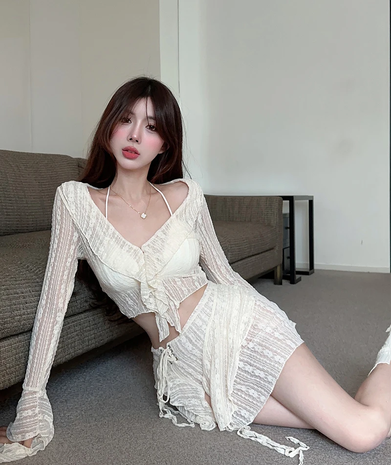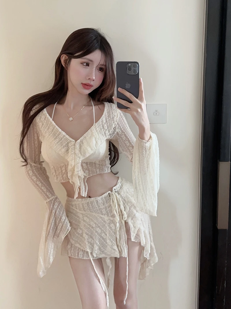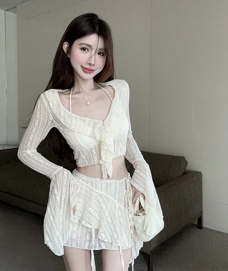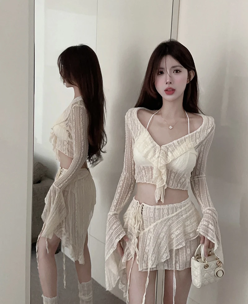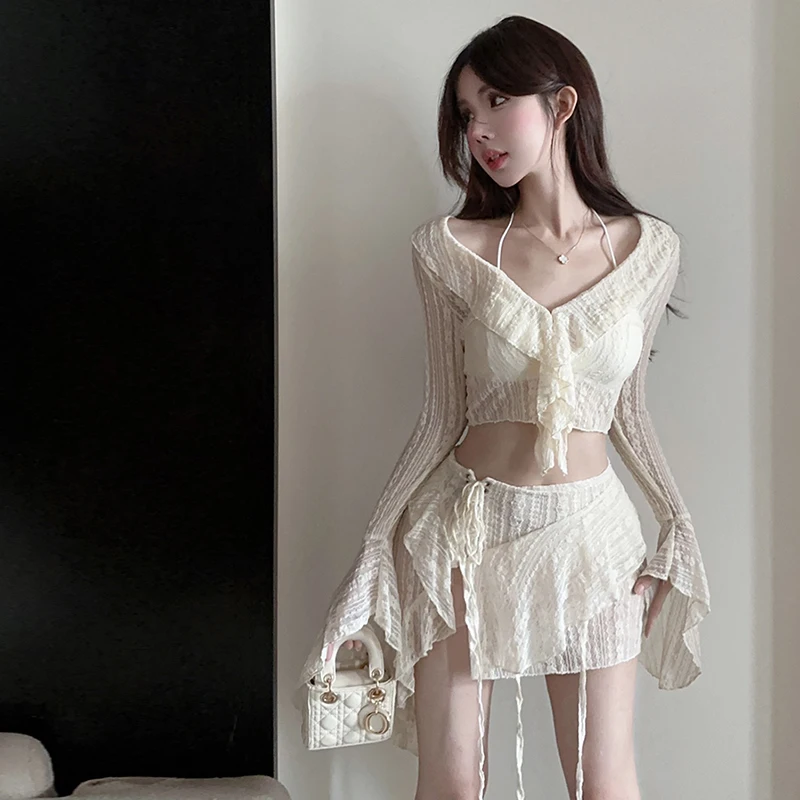 Yipinpay Girl Pure Sexy Suit Women's Autumn Lace Halter Neck V-Neck Top Irregular High Waist Chiffon Mini Skirt FashionTwo-piece Set