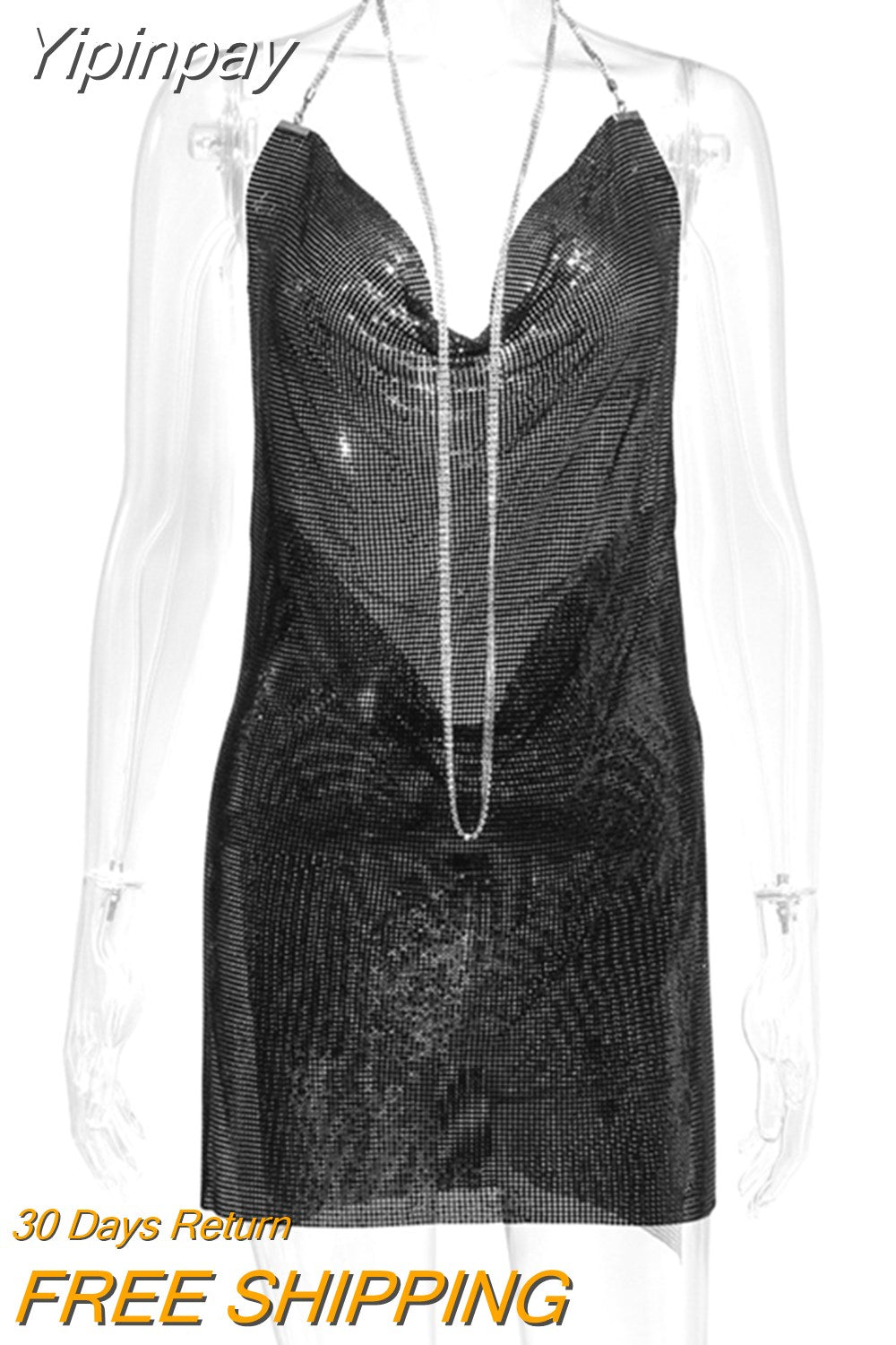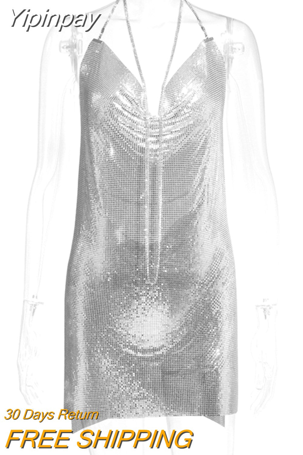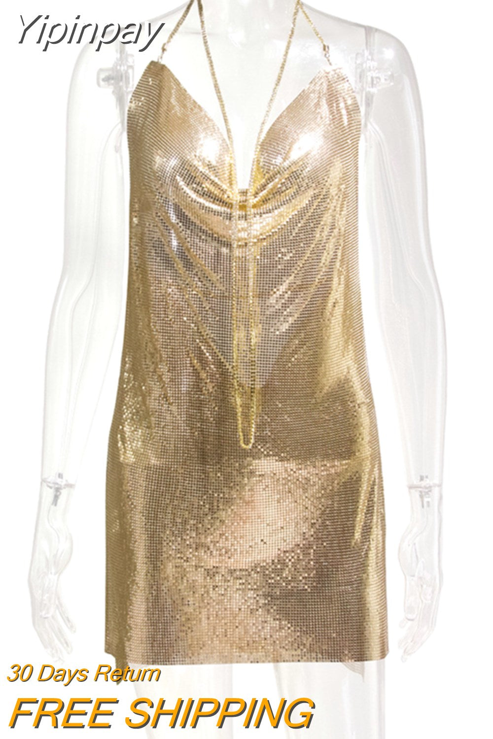 Yipinpay Gold Sequins Diamonds Sexy Night Party Dress Women Sleeveless Halter Backless Mini Dresses Femme Clubwear V-Neck Vestidos 0407