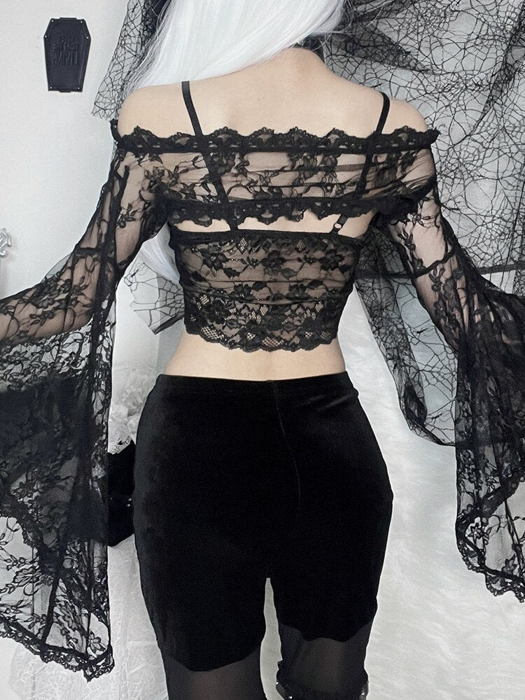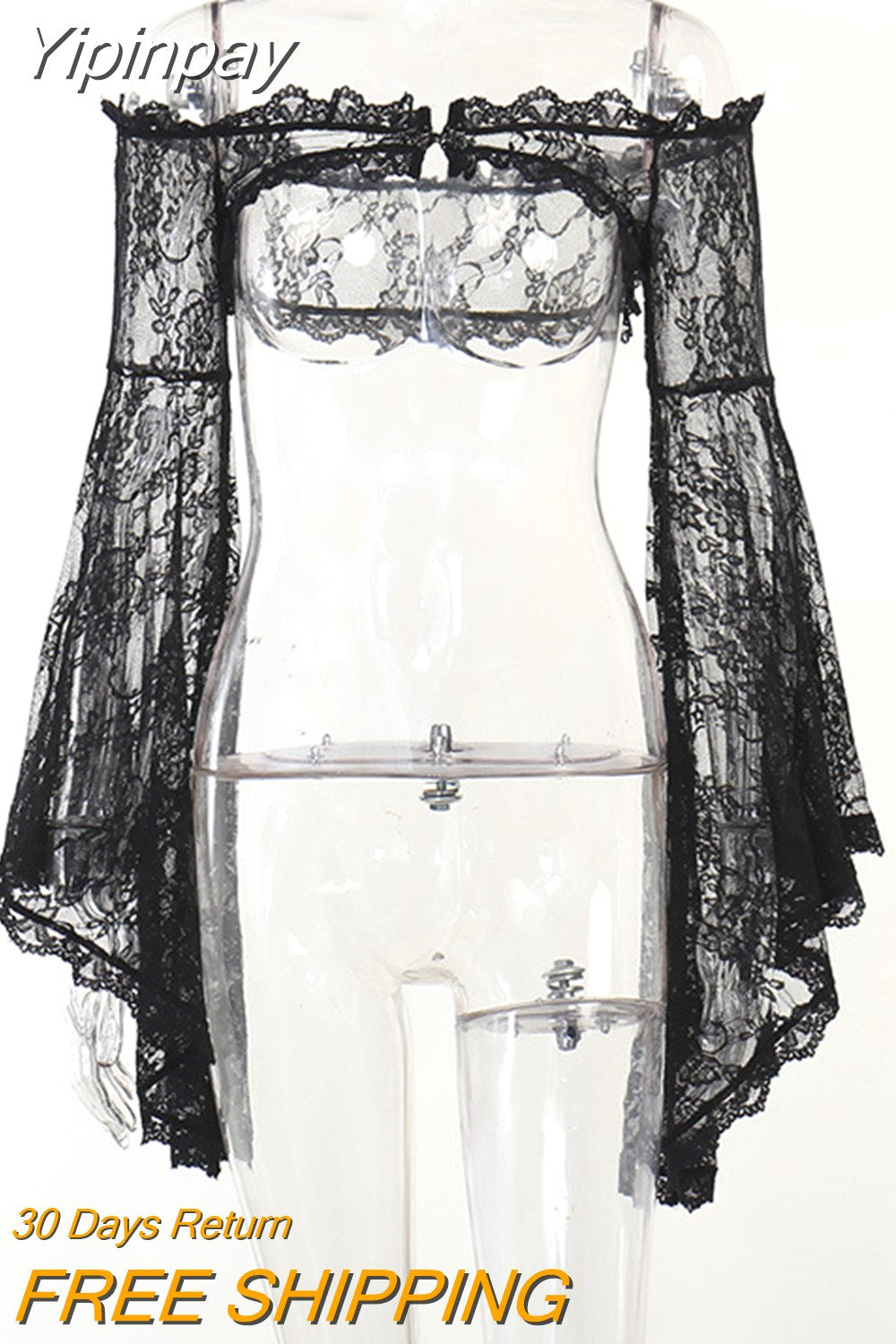 Yipinpay Goth Long Sleeve Smock Vintage Black Lace One Shoulder Grudge Aesthetic Overall Y2K Luxury Coquette Party Sexy Top