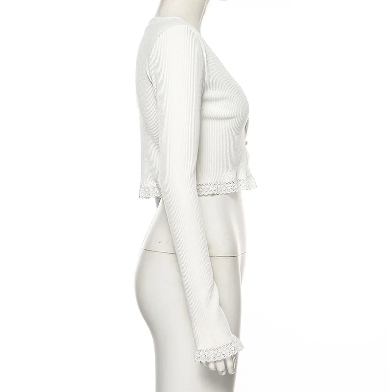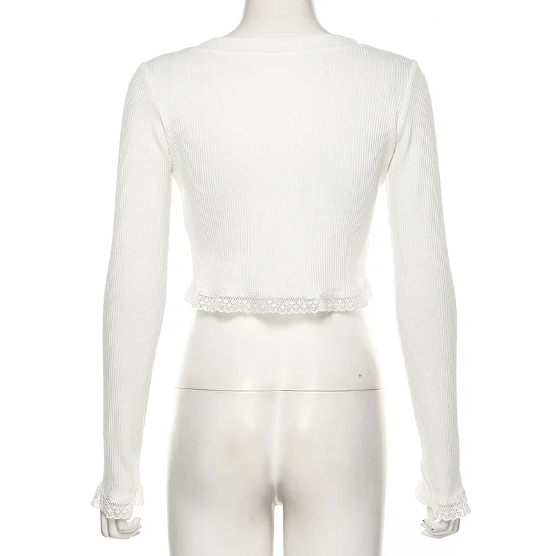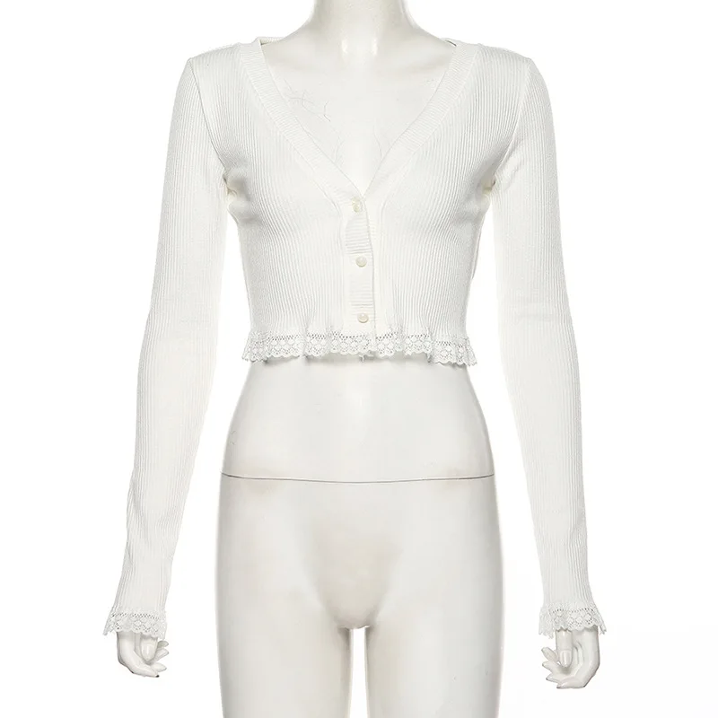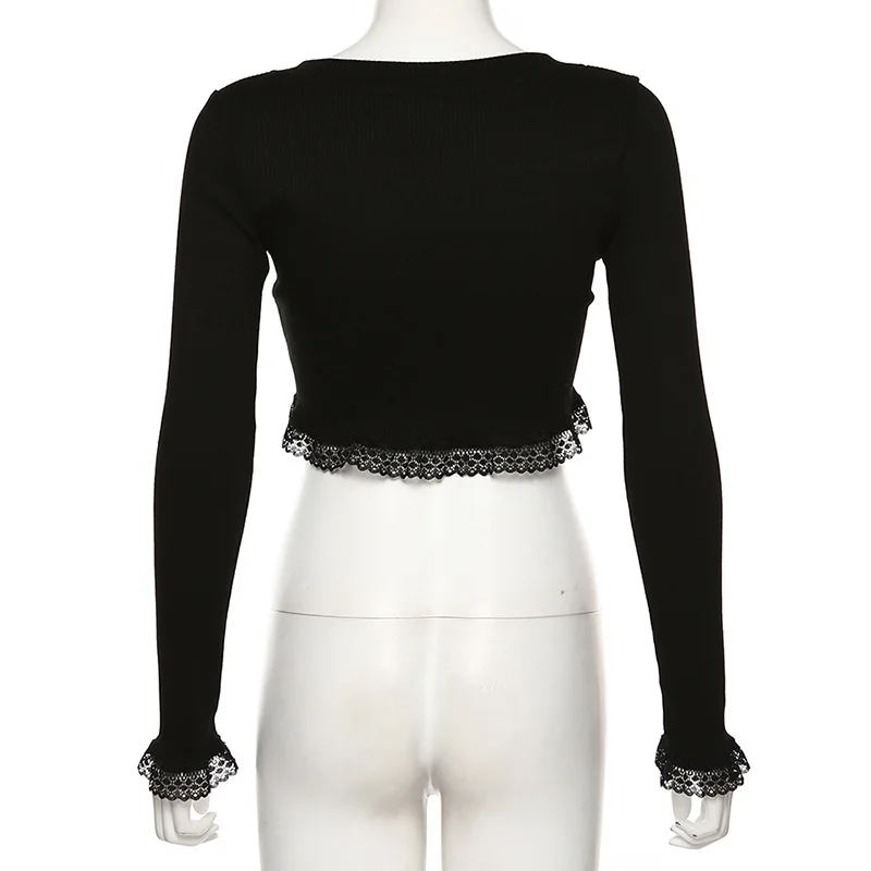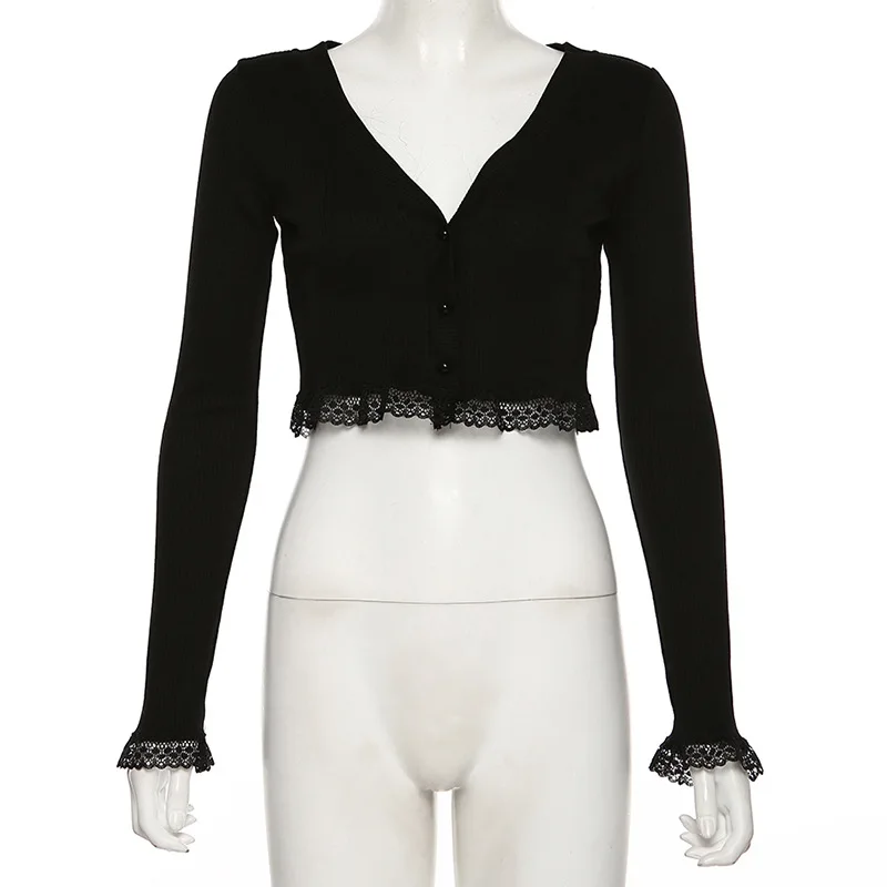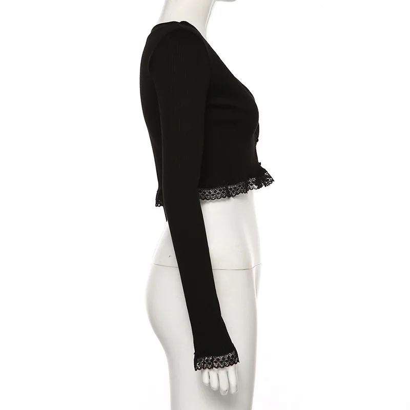 Yipinpay Gothic Dark Black Punk Sexy Lace Patchwork Knitted T-shirt Women Long Sleeve V-neck Slim Street Bottom Cardigan Female