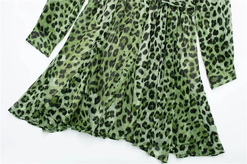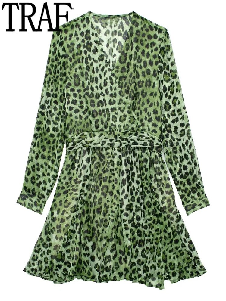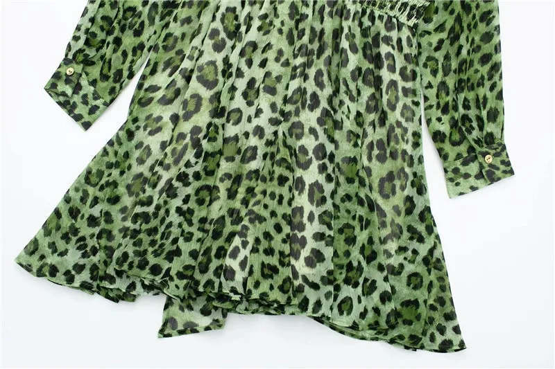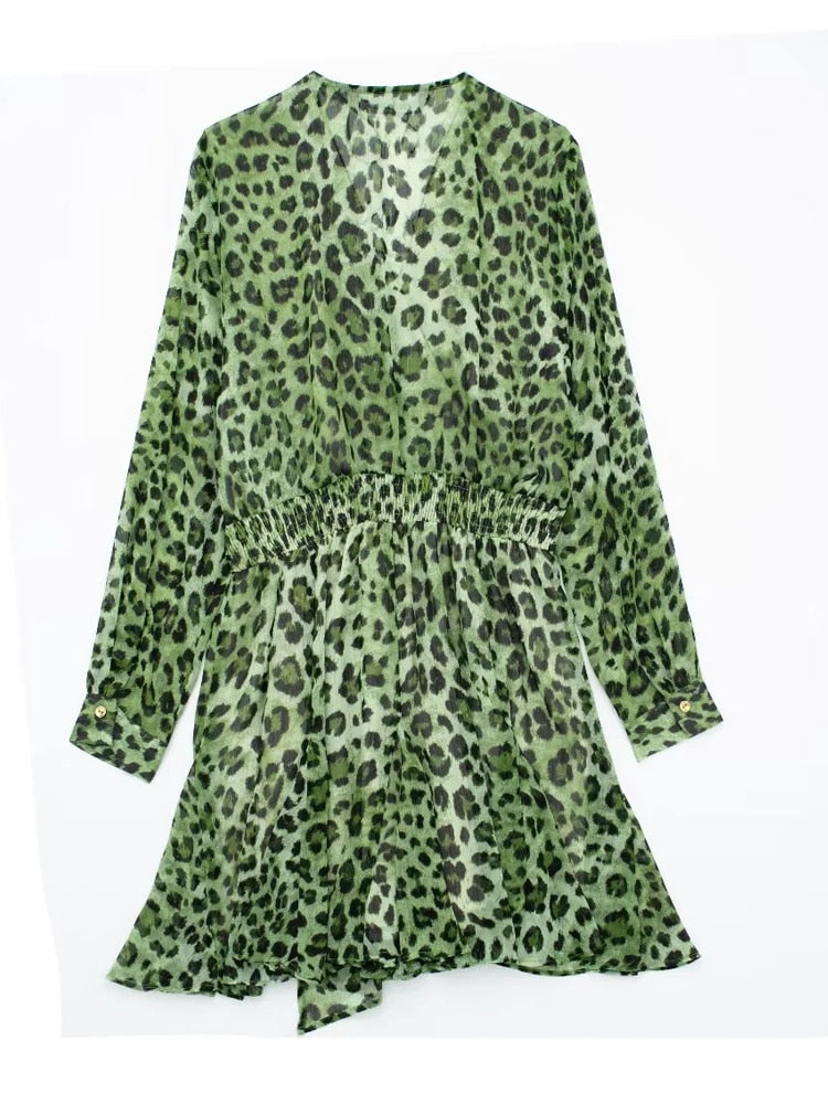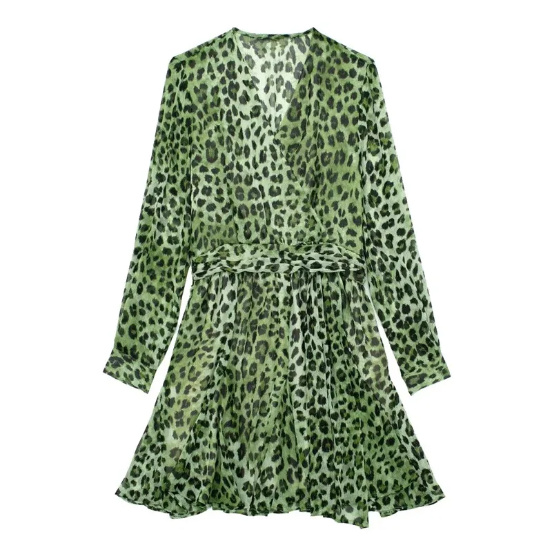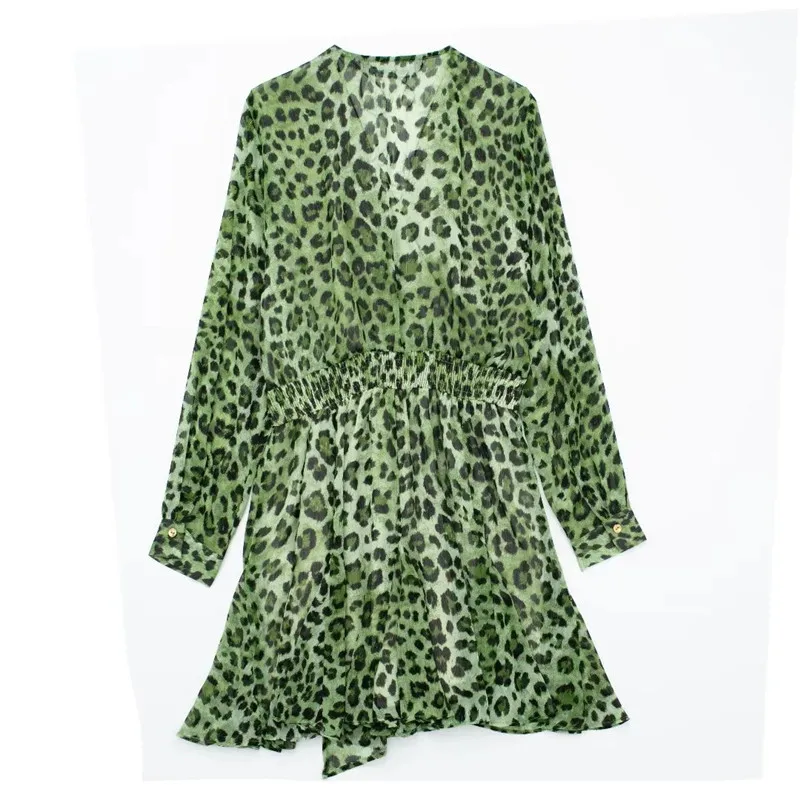 Yipinpay Green Chiffon Dress Woman Leopard Print Vintage Mini Dress Women Long Sleeve Short Dresses 2023 Elegant Chic Women Dresses