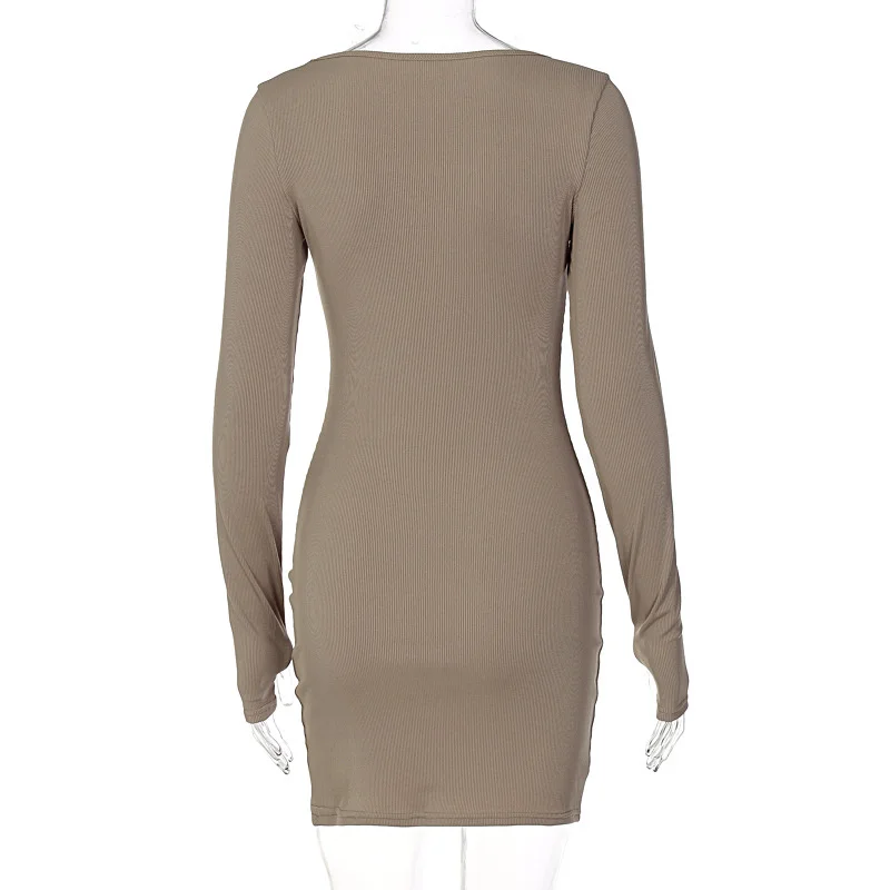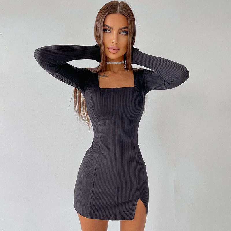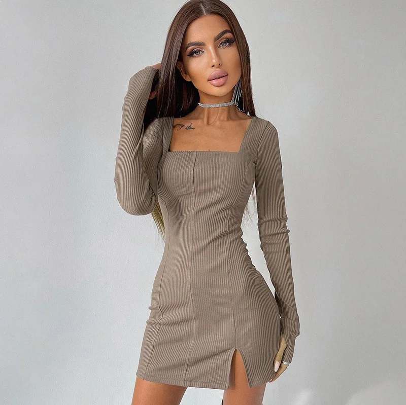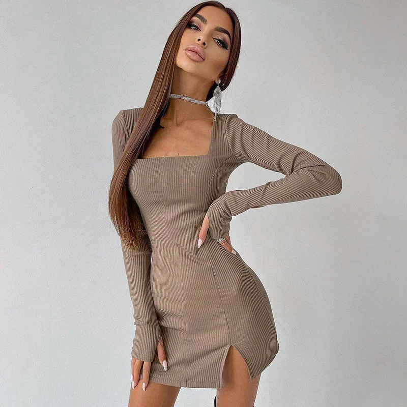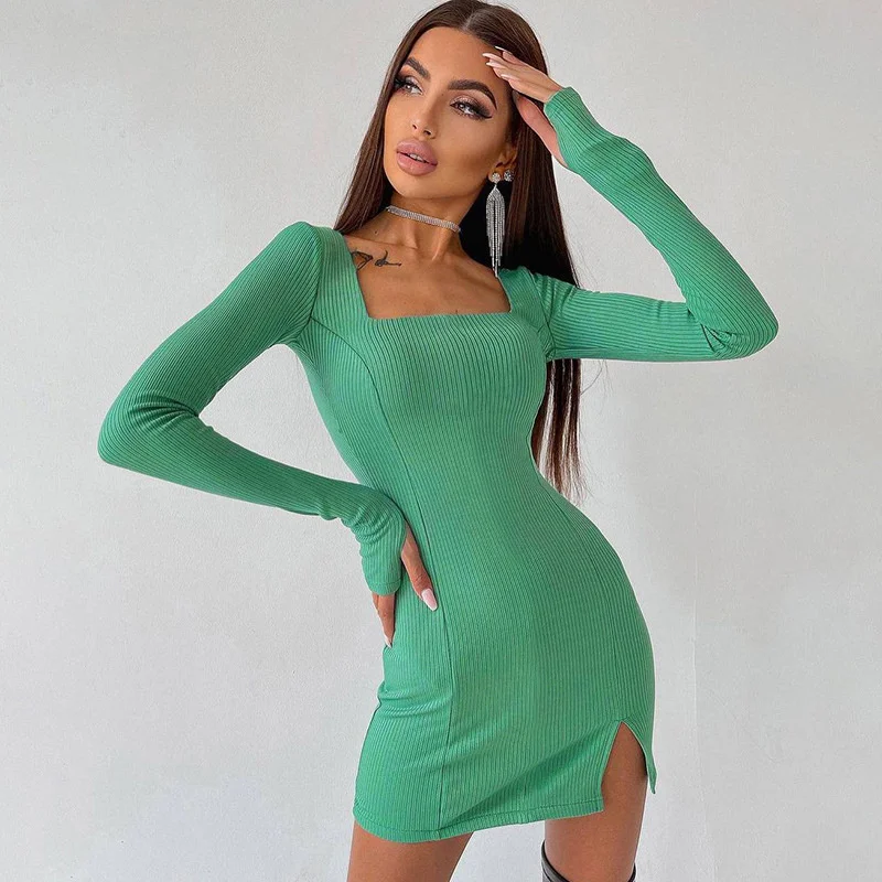 Yipinpay Green Knitted Long Sleeve Autumn Dress For Women Square Neck Slim Bodycon Mini Dresses Femme Club Party Outfits Clothes