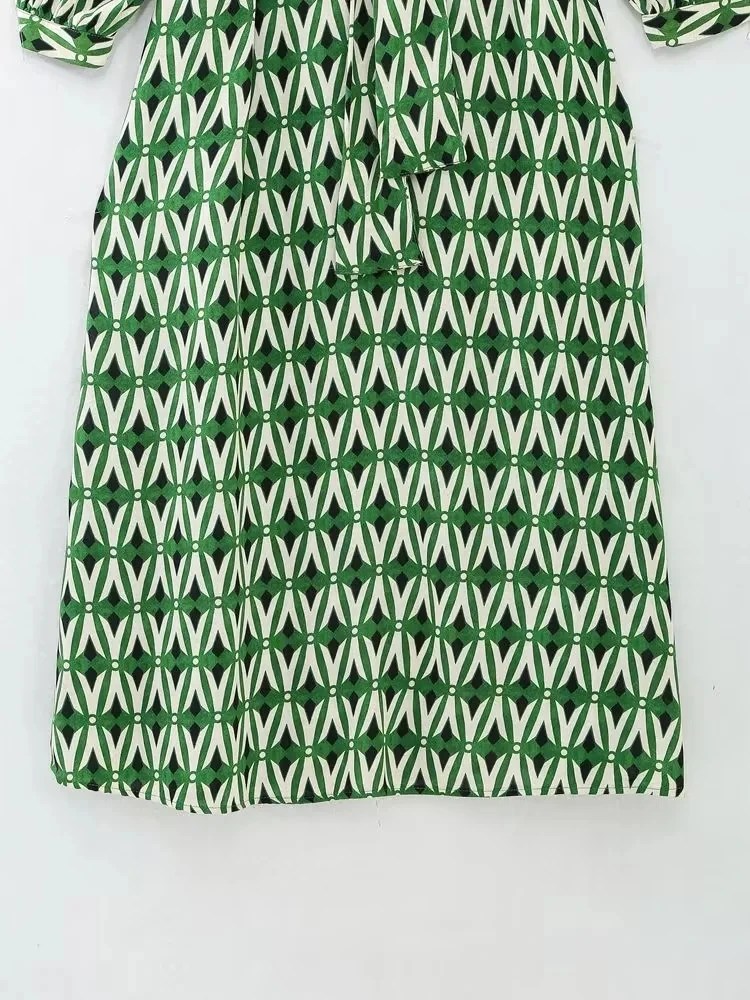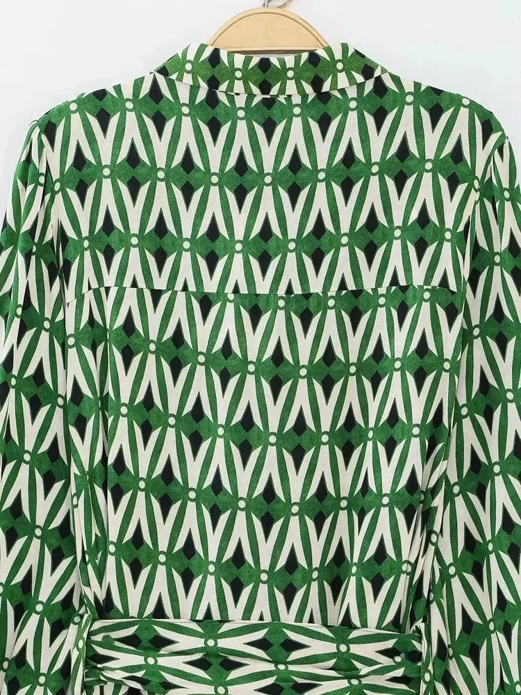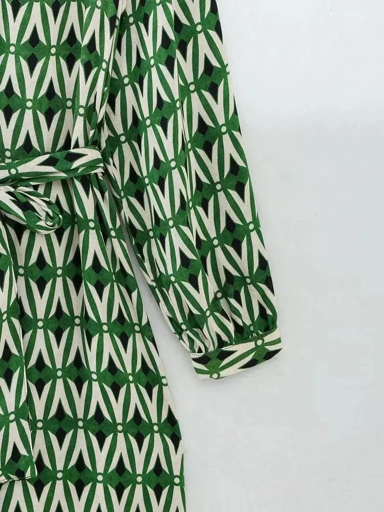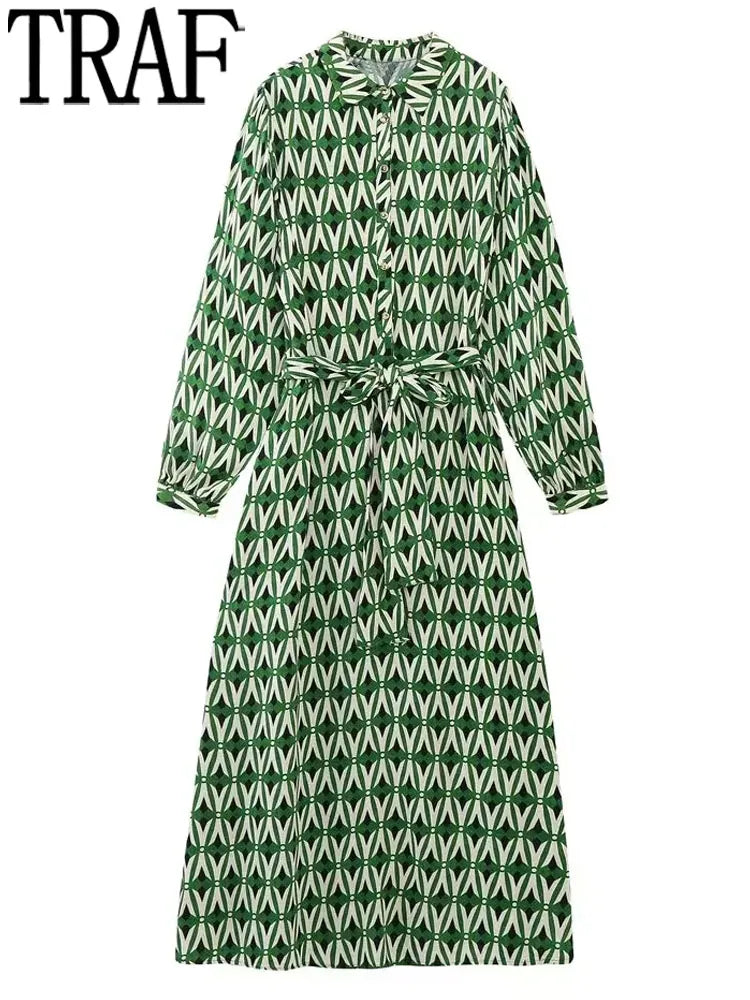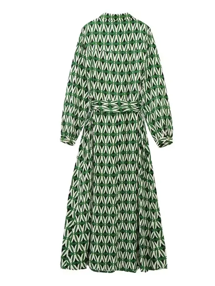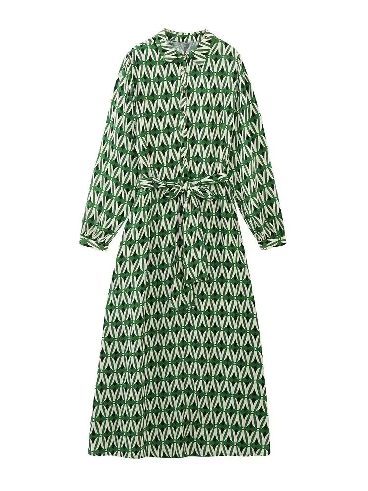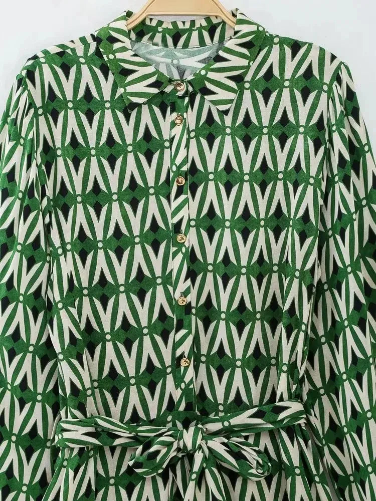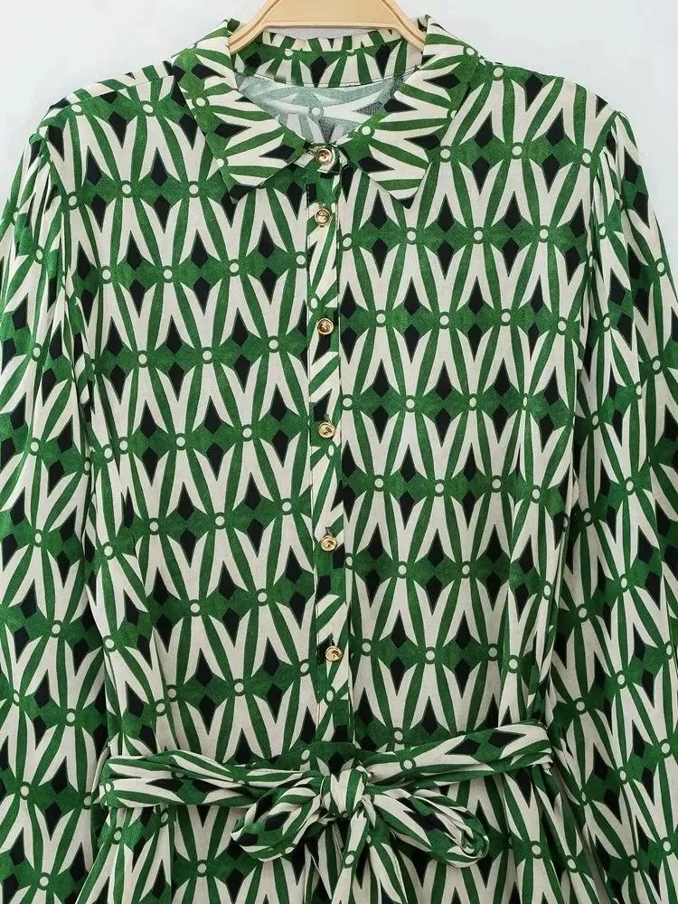 Yipinpay Green Shirt Dress Woman Geometric Print Long Dresses For Women 2023 Belt Long Sleeve Midi Dresses Woman Elegant Dress