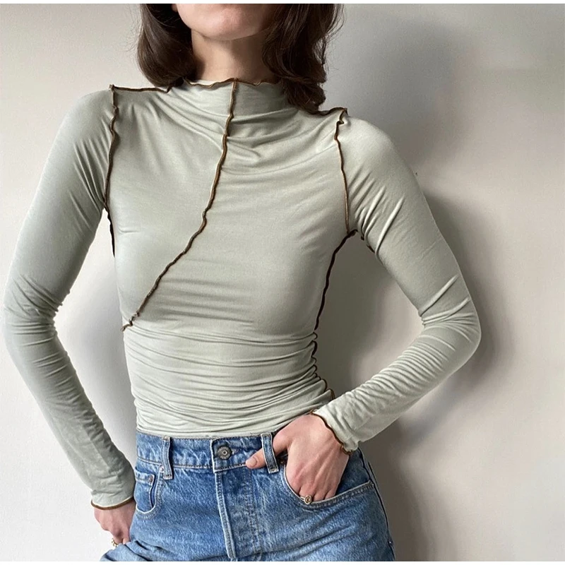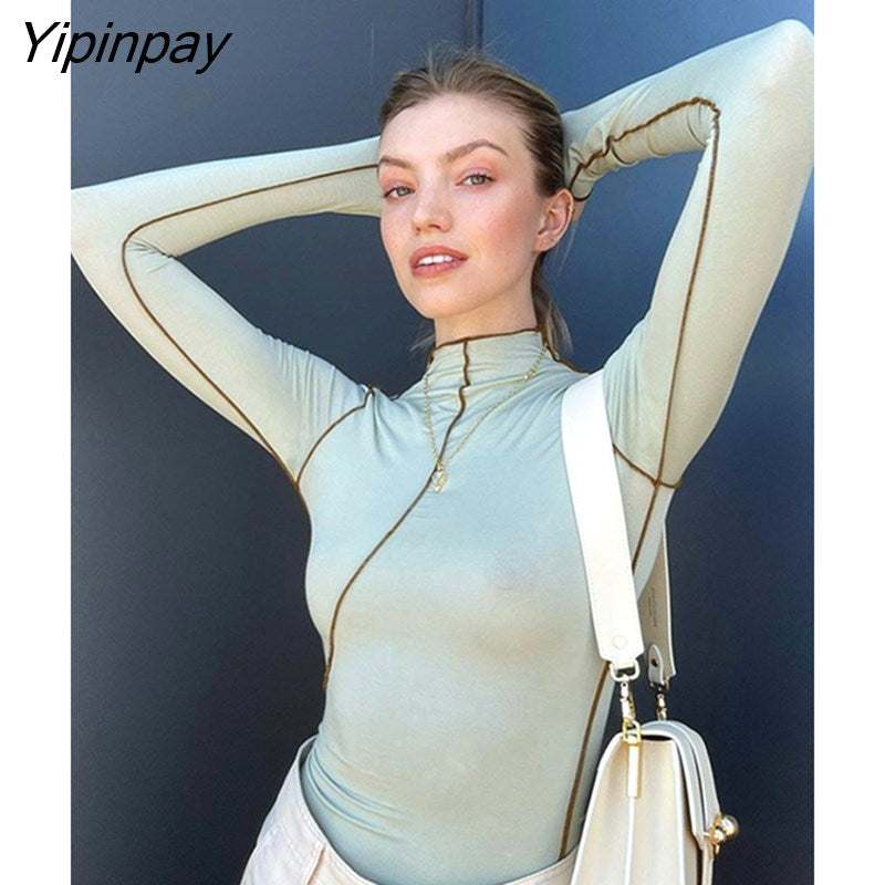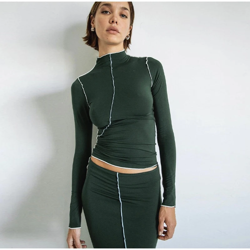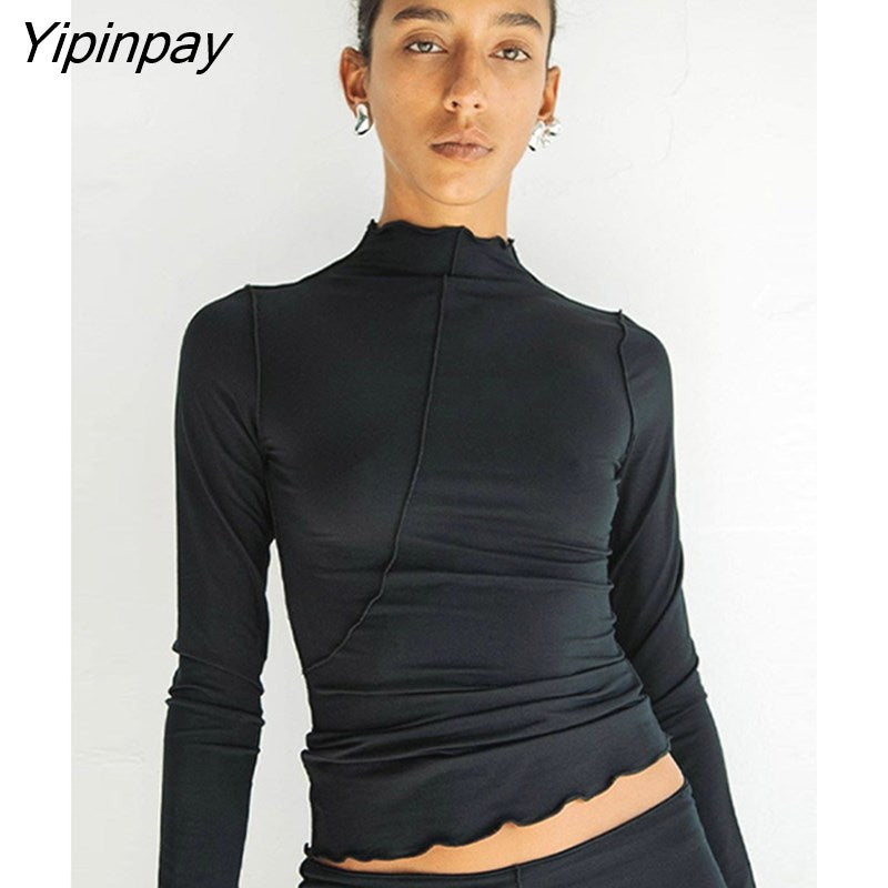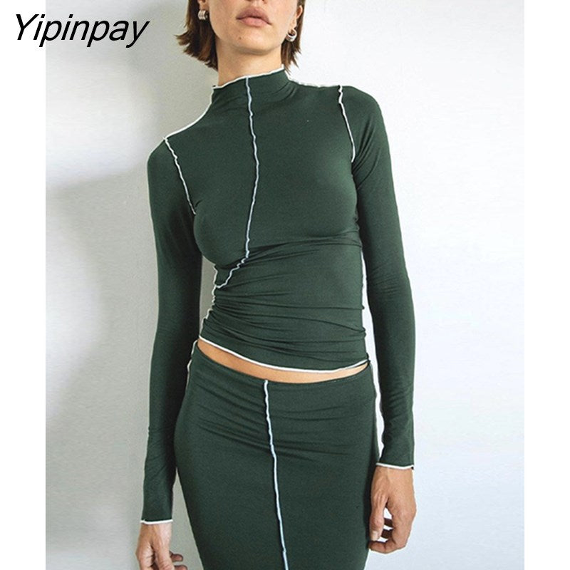 Yipinpay Half Turtleneck Bright Line Two Piece Suit For Women Sexy Long Sleeve Crop Top Skirt Sets 2023 Female Basic Tee Outfits