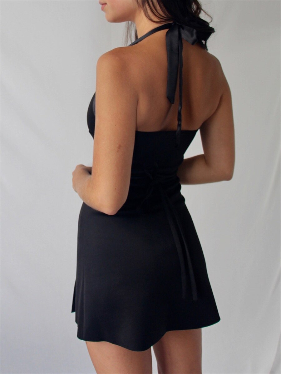 Yipinpay Halterneck Tie Up Mini Party Dress Elegant Party Club Vestidos Women Sleeveless Low Cut Backless Slit Short Dress Solid