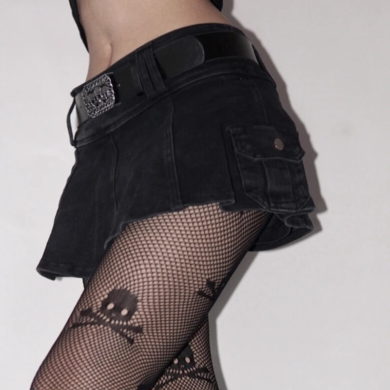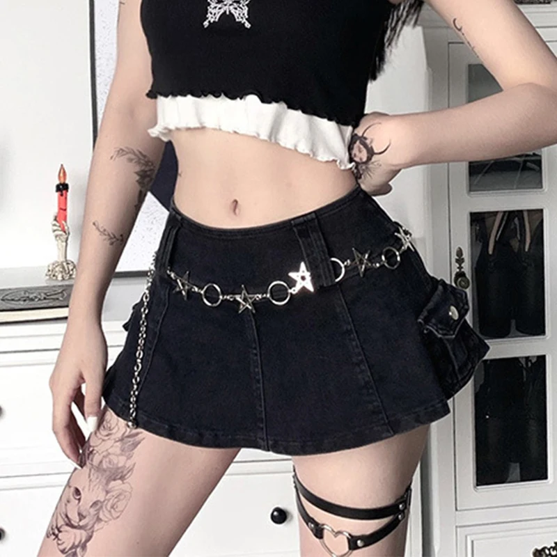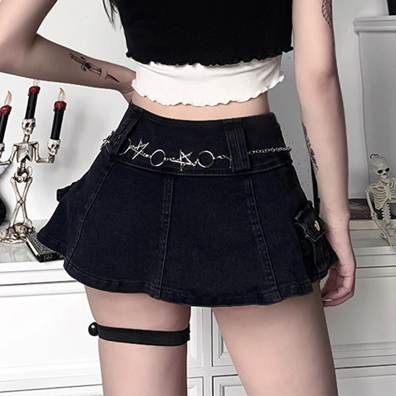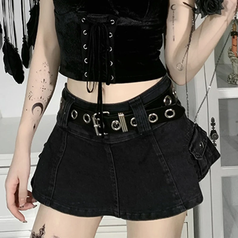 Yipinpay Harajuku Y2k Denim Skirt Women Dark Gothic Streetwear Mini Skirt with Skull Belt Mall Goth Punk Grunge Sexy Emo Clubwear