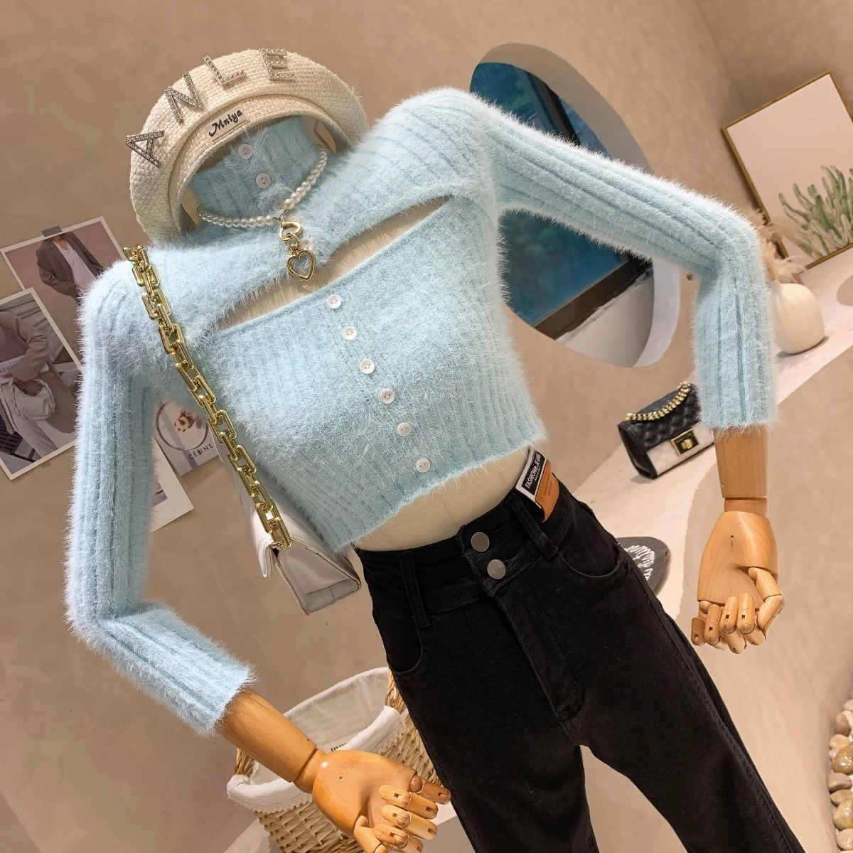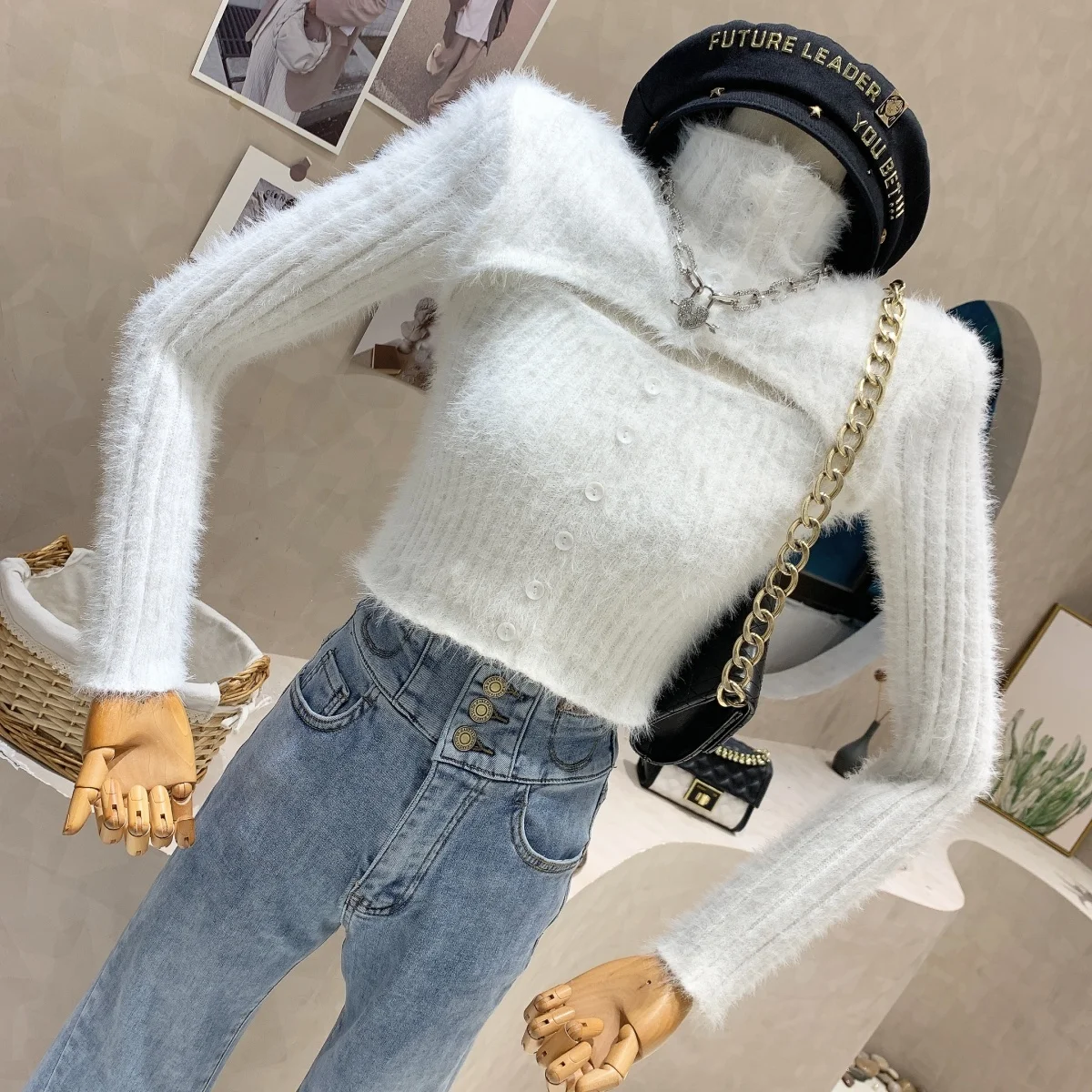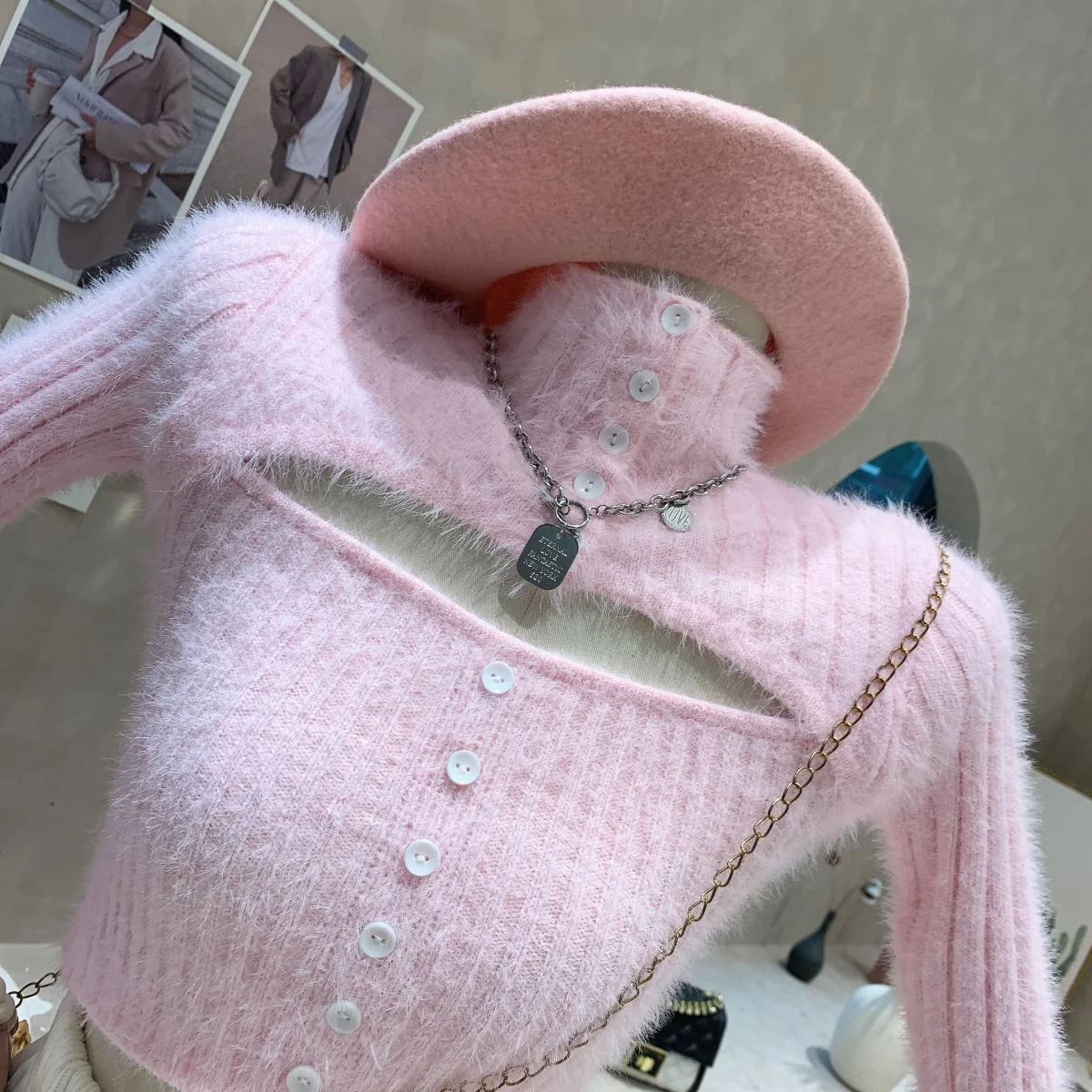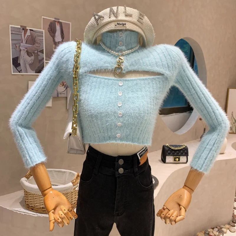 Yipinpay High Collar Sweater Women Slim Sexy Hollow Jumper Pullover Tops Crop Pink Sweaters Fur Button Knit Sueter Shirt