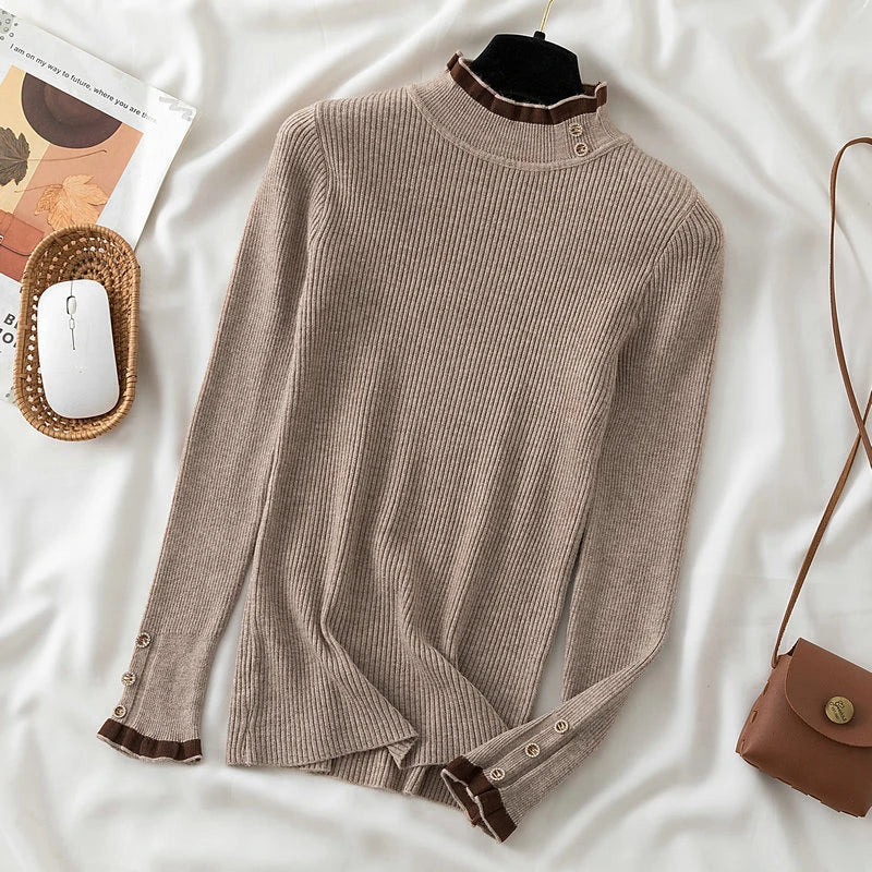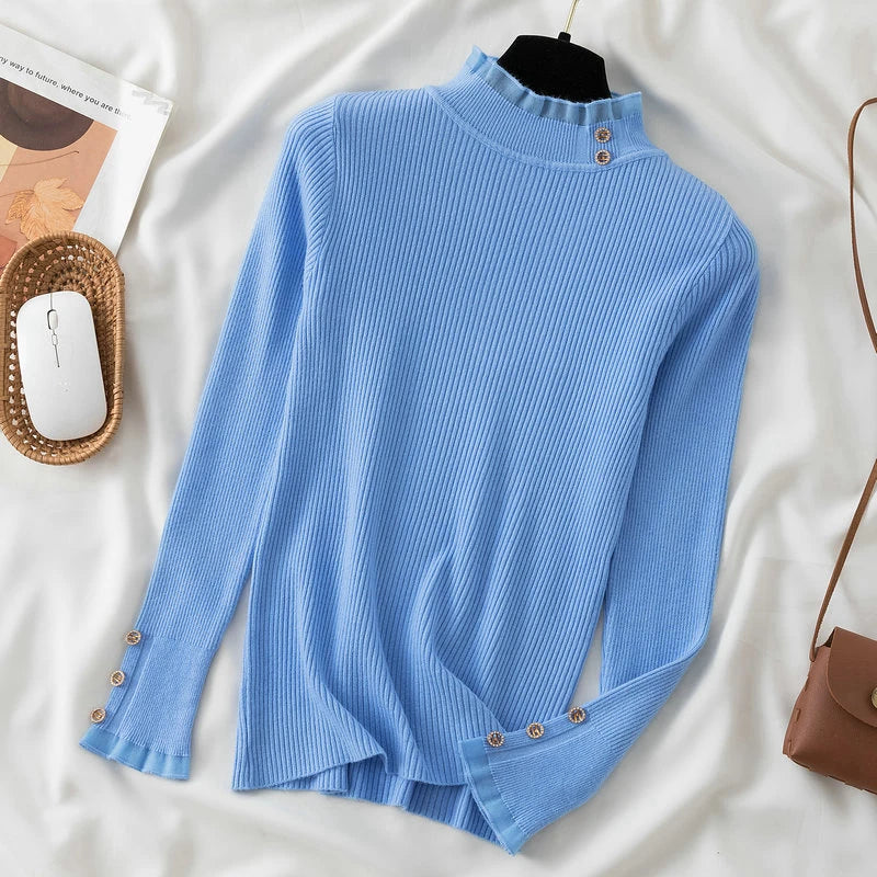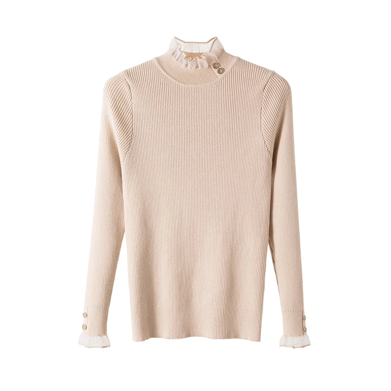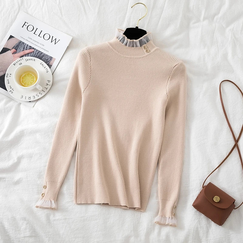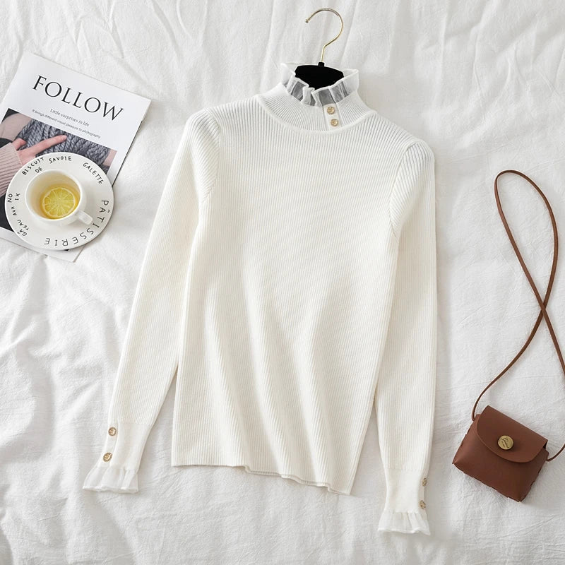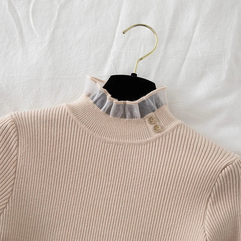 Yipinpay High Neck Knit Sweater Women's Autumn/Winter 2024 New Button Spliced Lace Fungal Edge Top Long Sleeve Slim Bottoming Shirt