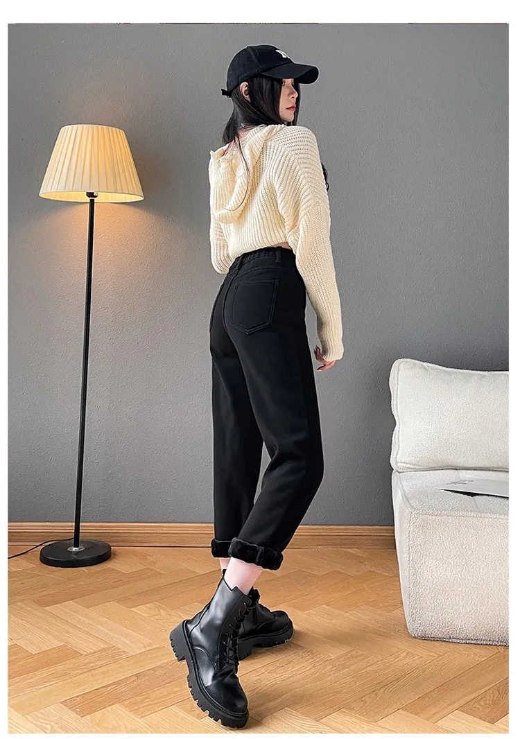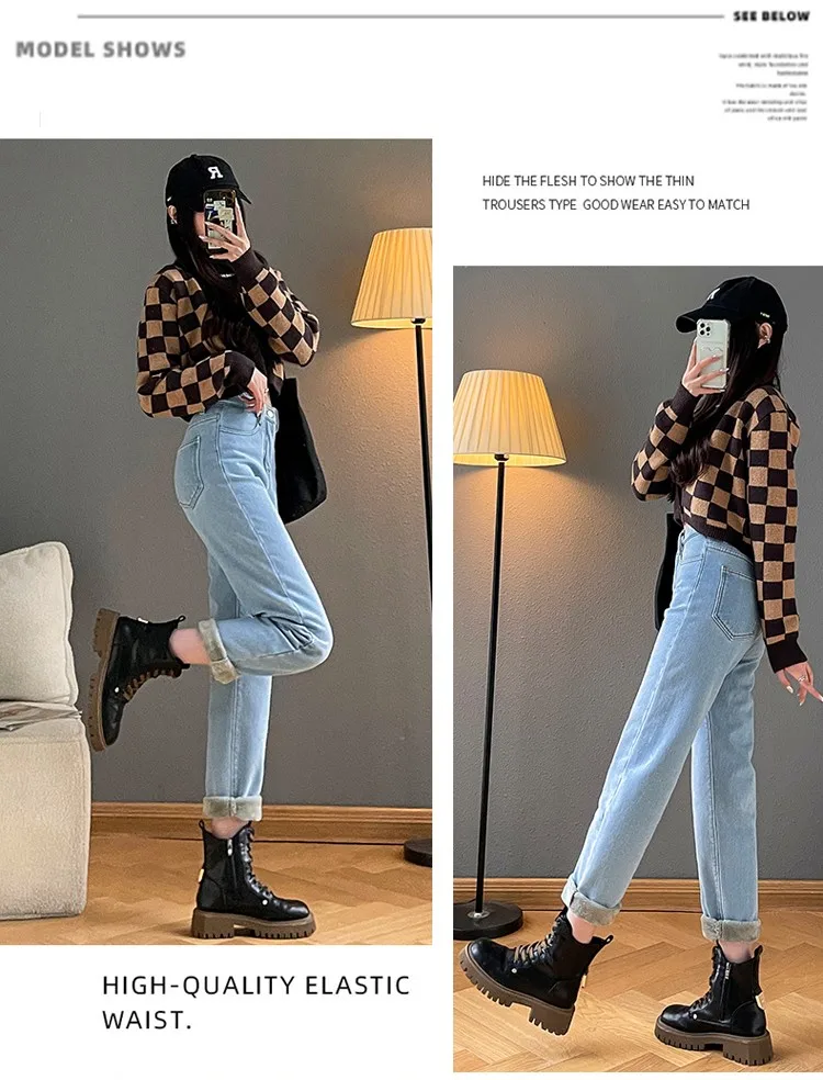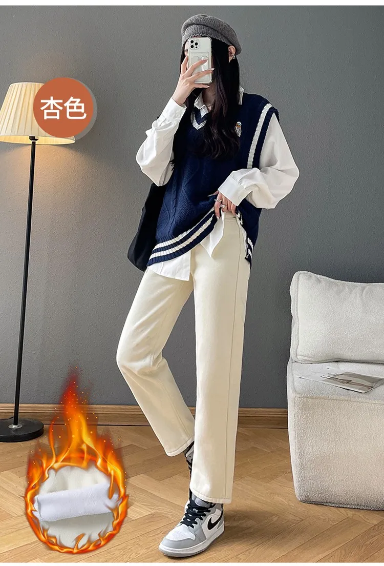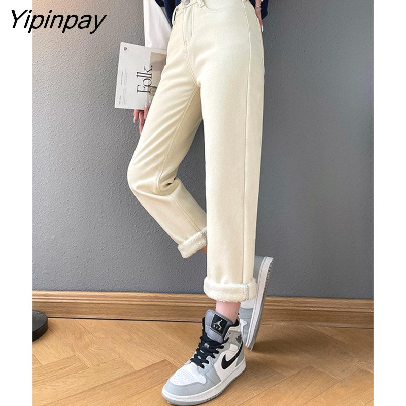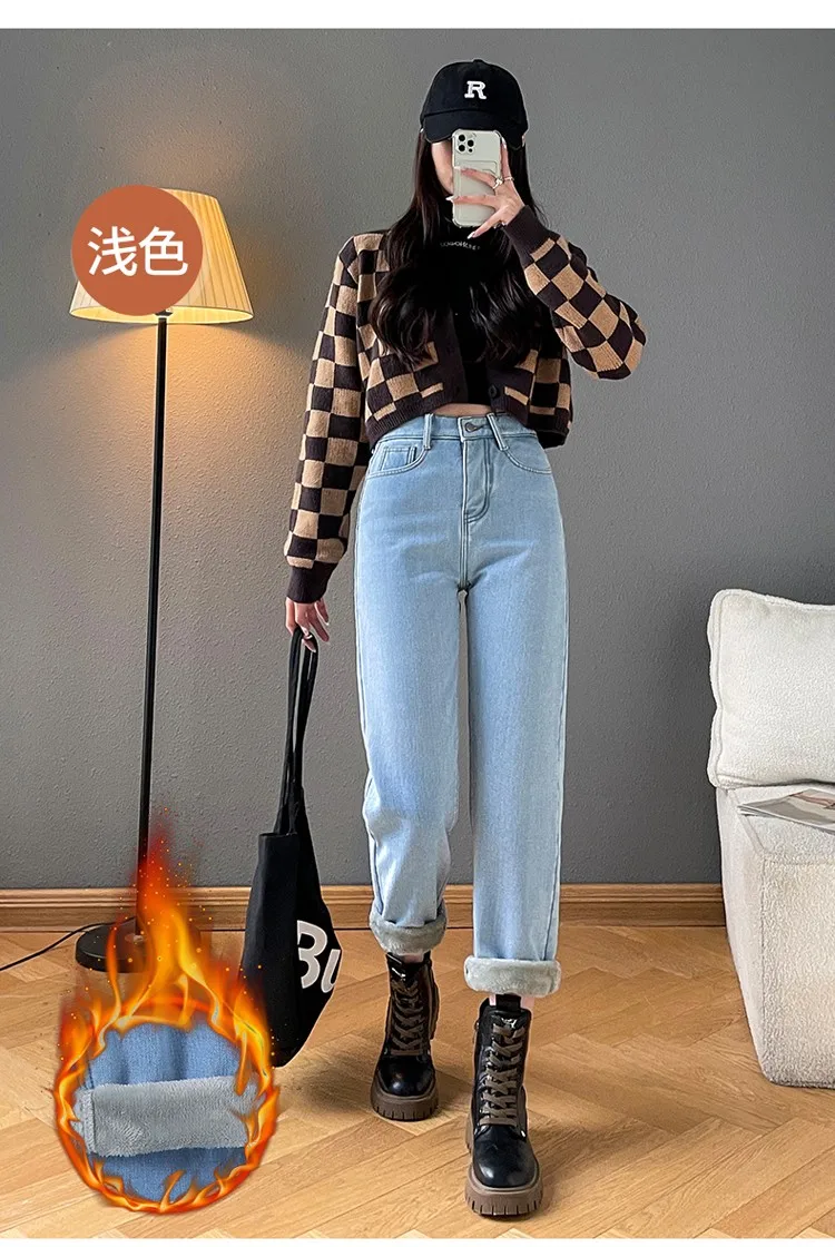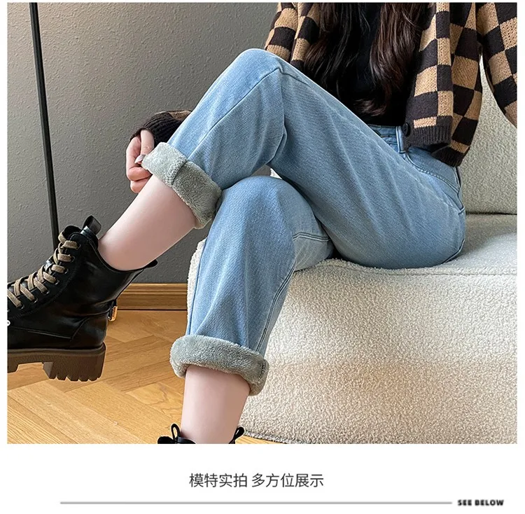 Yipinpay High Waist Thickened Plush Jeans Woman Straight Tube Loose Winter Style Versatile Harun Pants