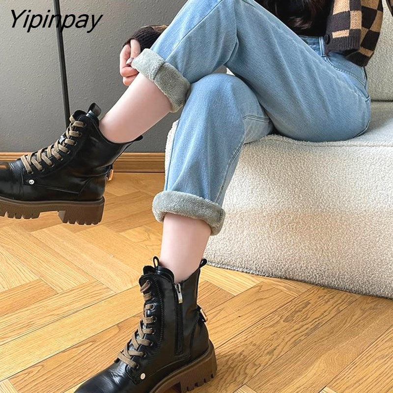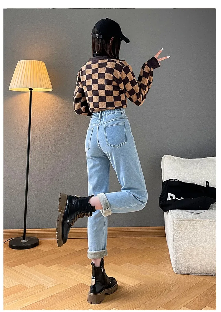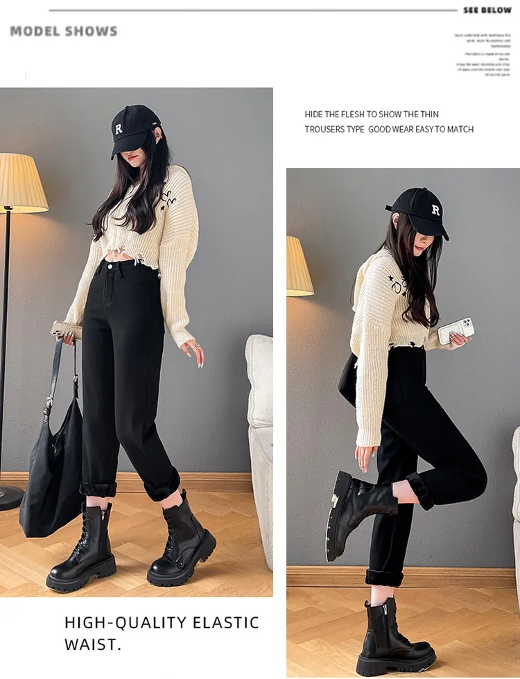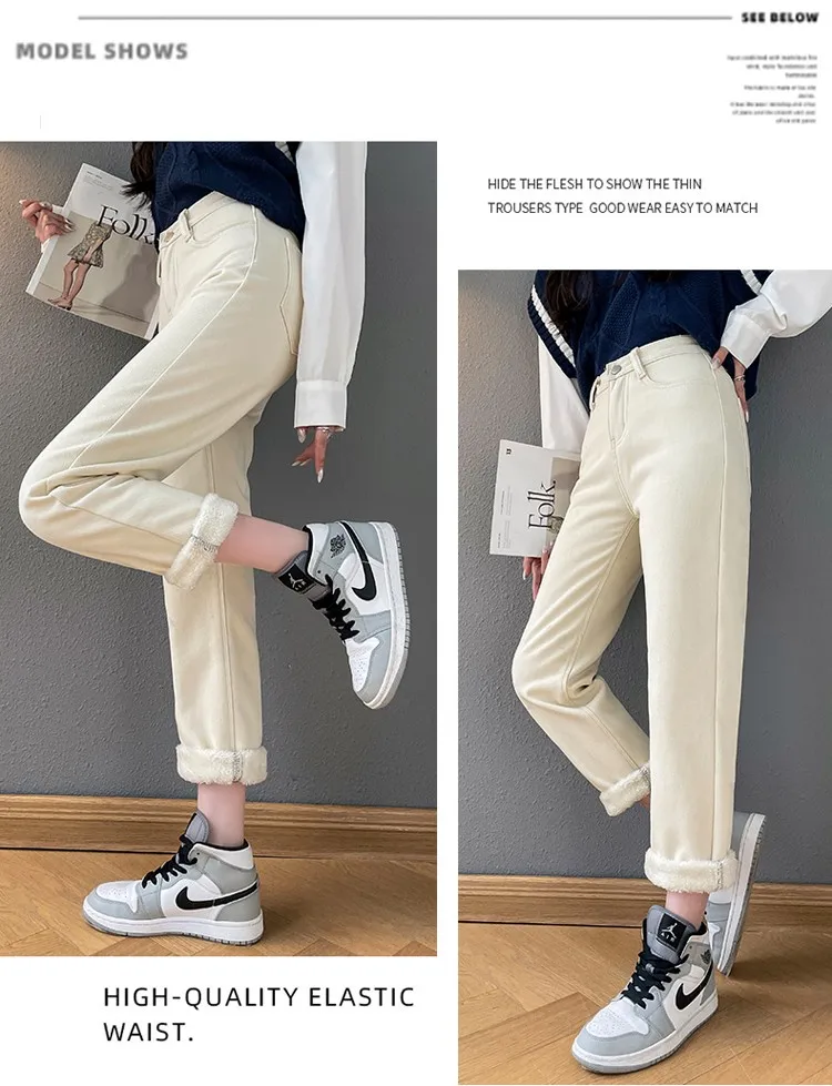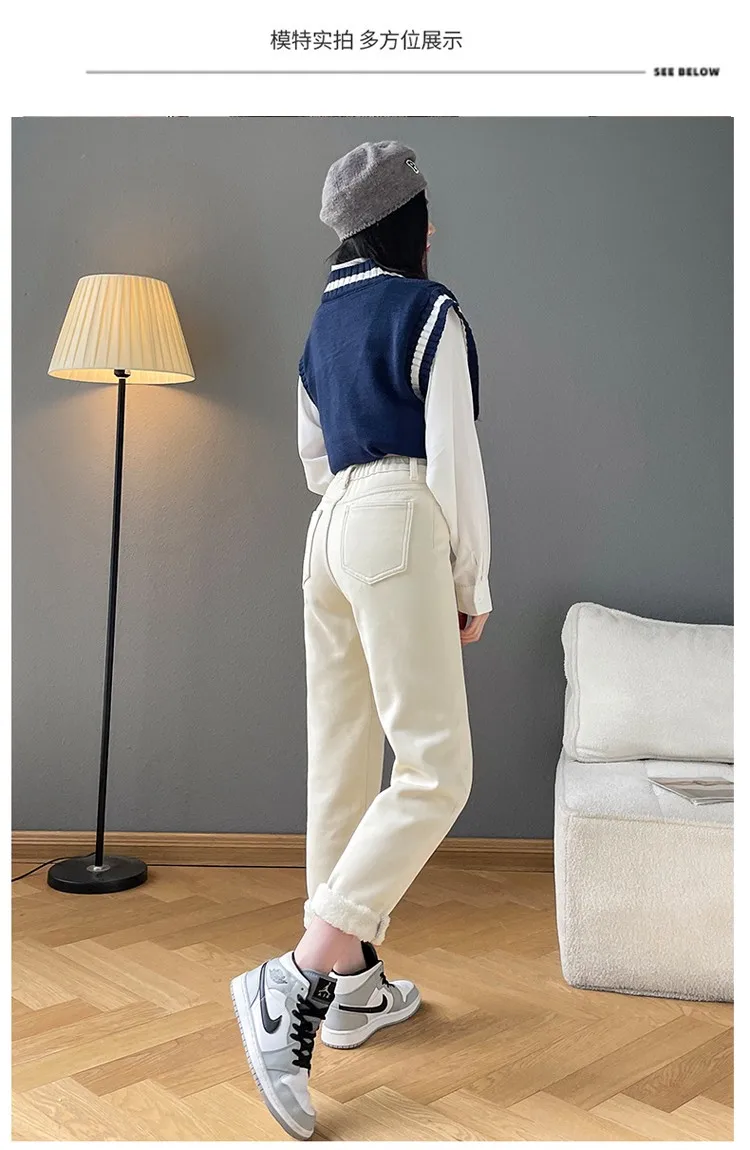 Yipinpay High Waist Thickened Plush Jeans Woman Straight Tube Loose Winter Style Versatile Harun Pants
