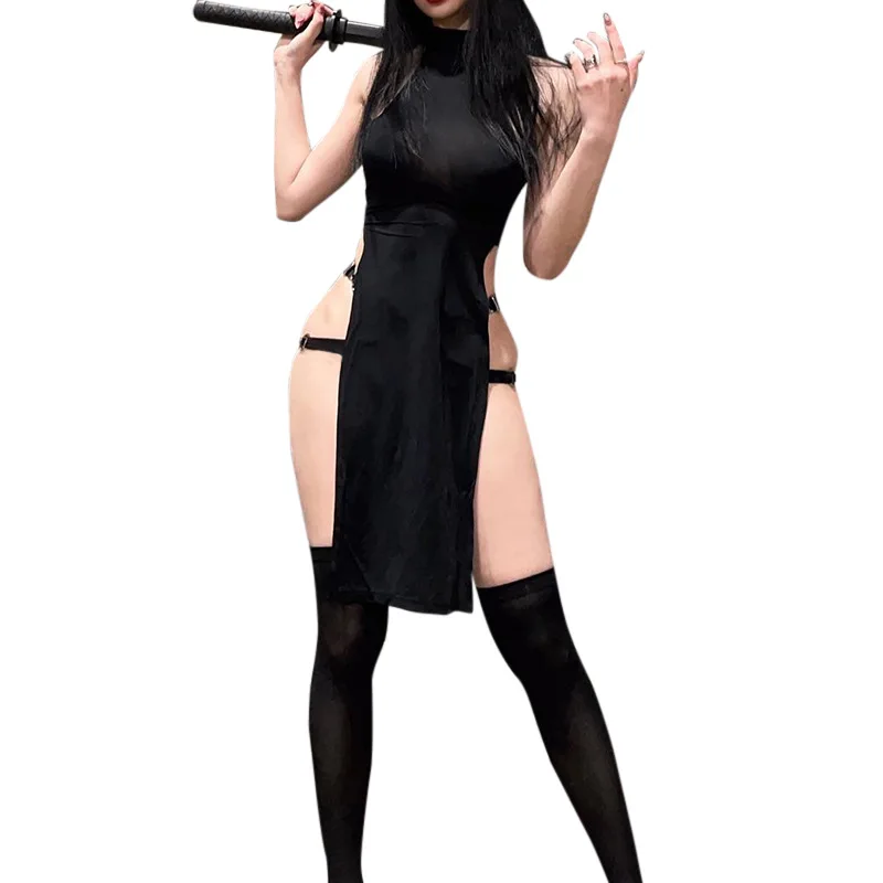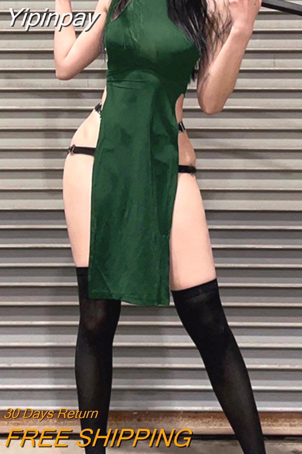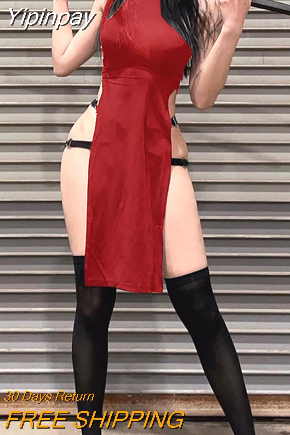 Yipinpay High Waist Y2k Slim Women Dress Dark Goth Cosplay High Split Side Sexy Sleeveless Dresses Harajuku Summer Night Clubwear