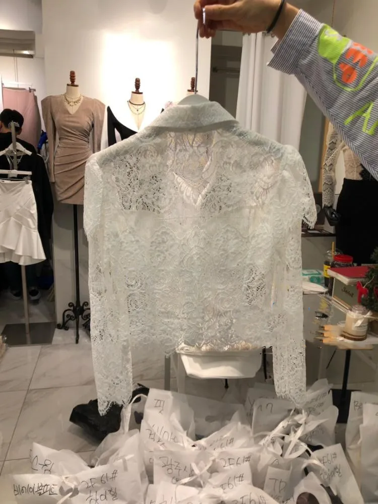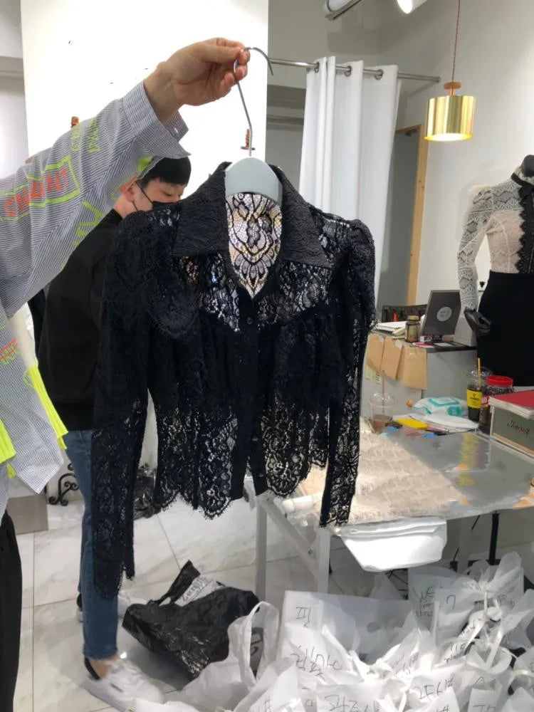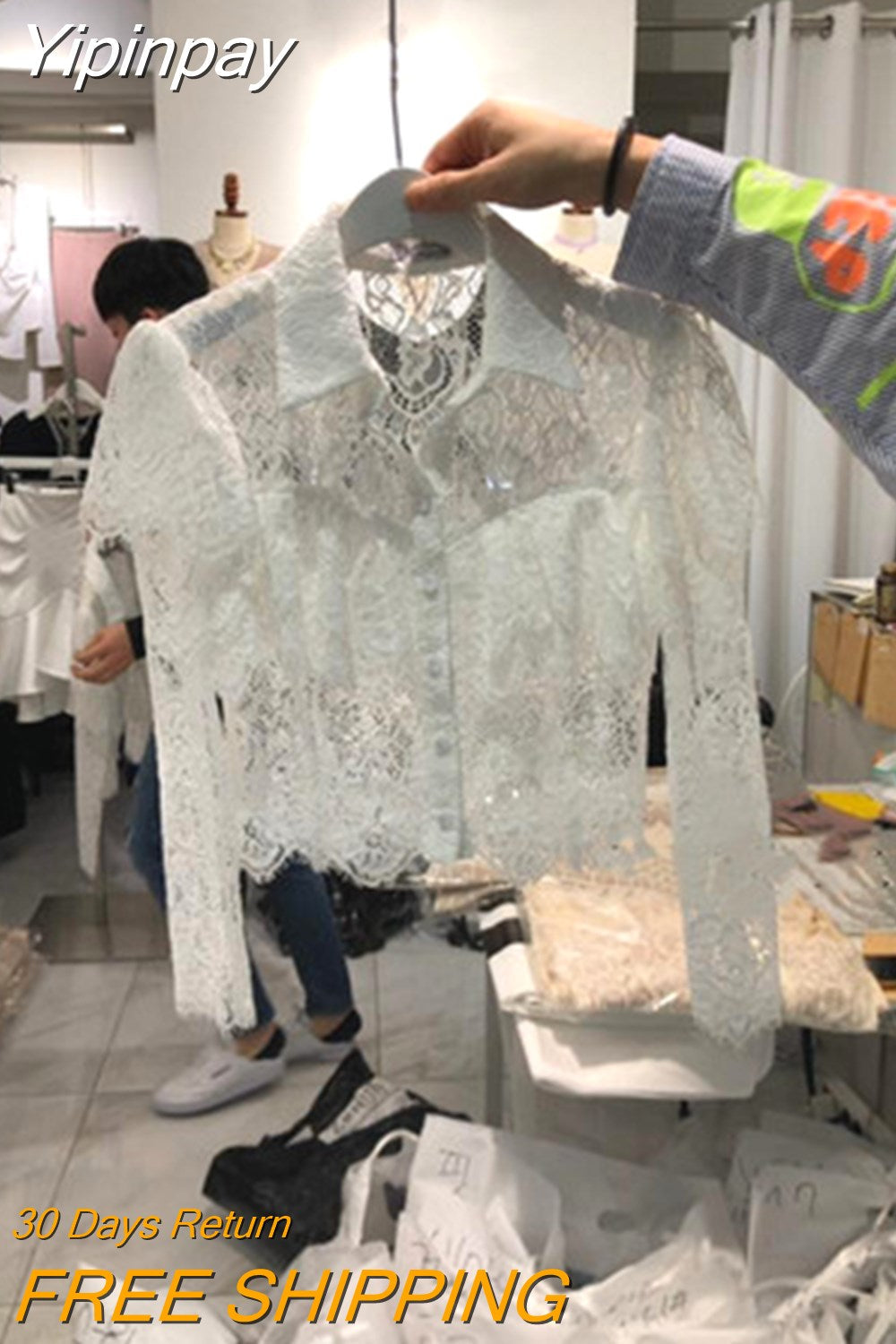 Yipinpay Hollow Out Crochet Black Lace Shirts Camisas De Mujer Slim Crop Tops Lapel Spring OL Blusas Femininas Retro Blouses Shirt