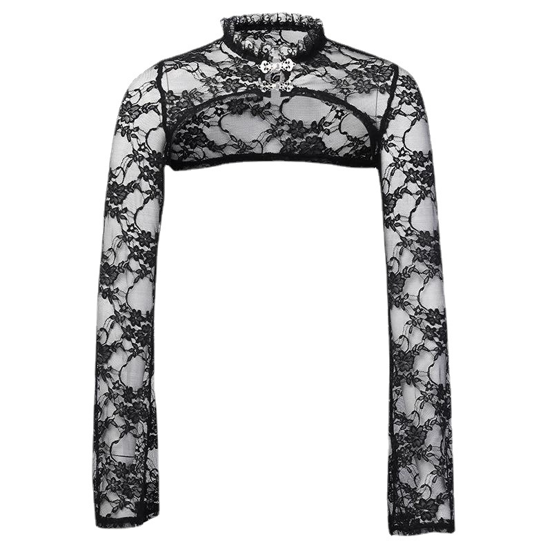 Yipinpay Horn Sleeve Black Collar V Inner Blouse The Court Tight Long-Sleeved Perspective Lace Bottomed Shirt