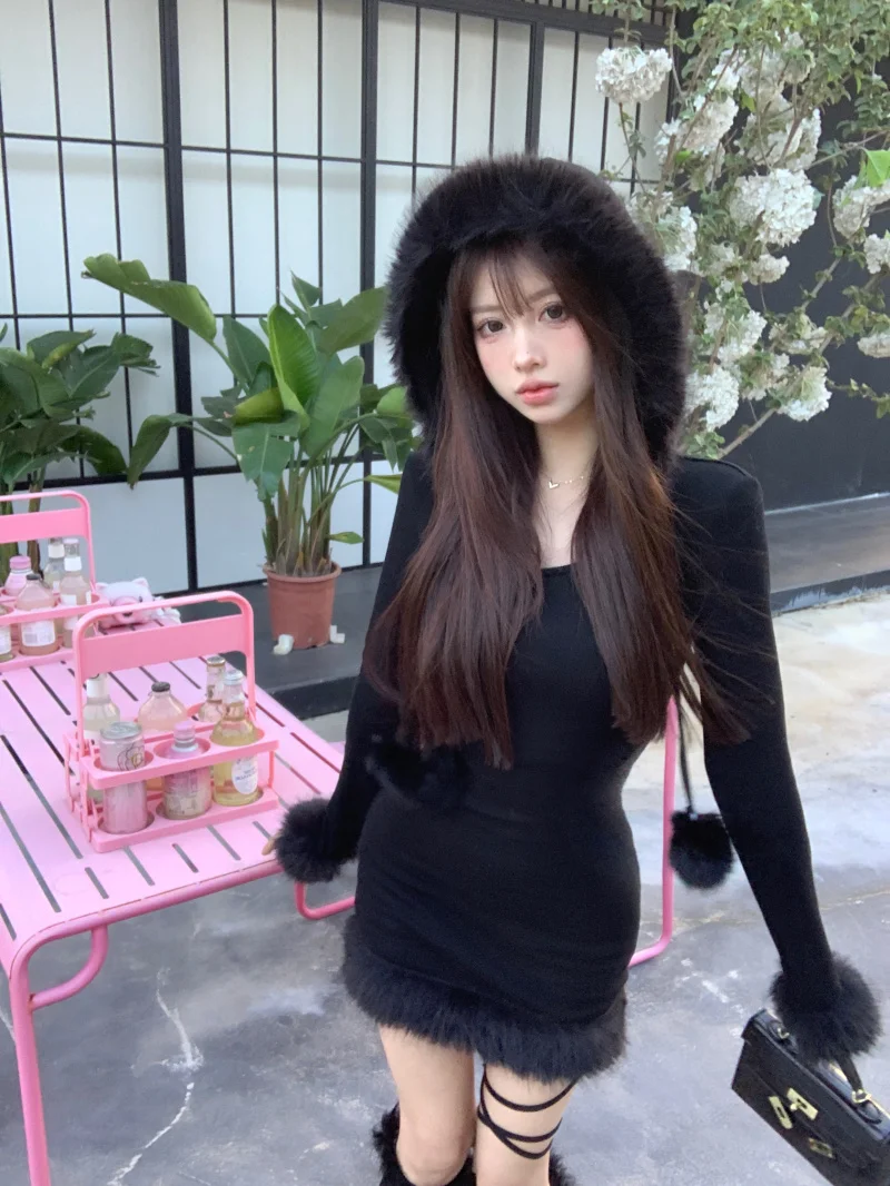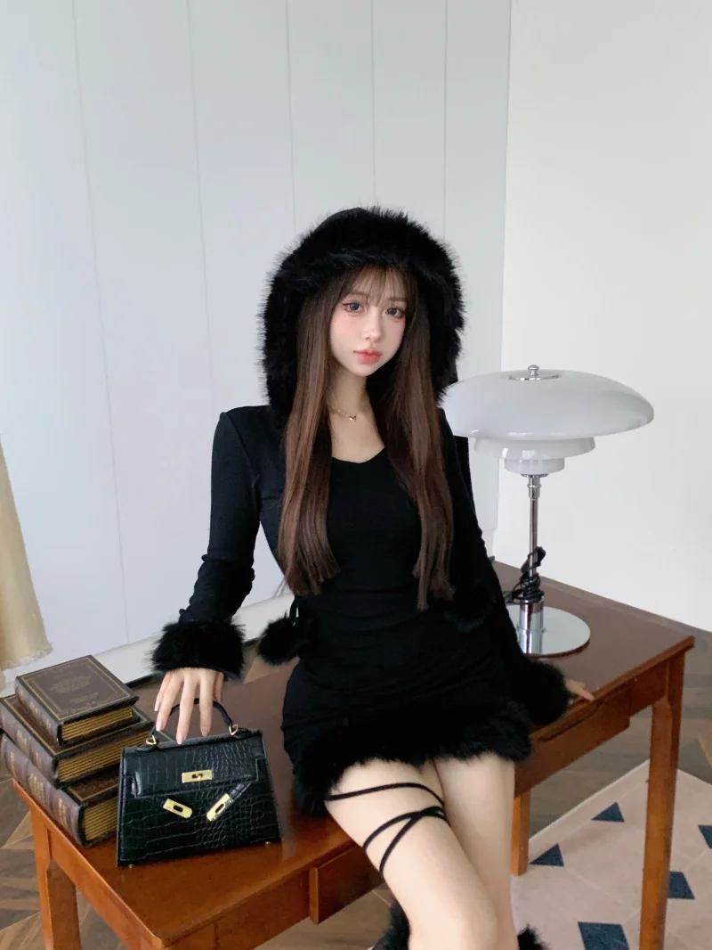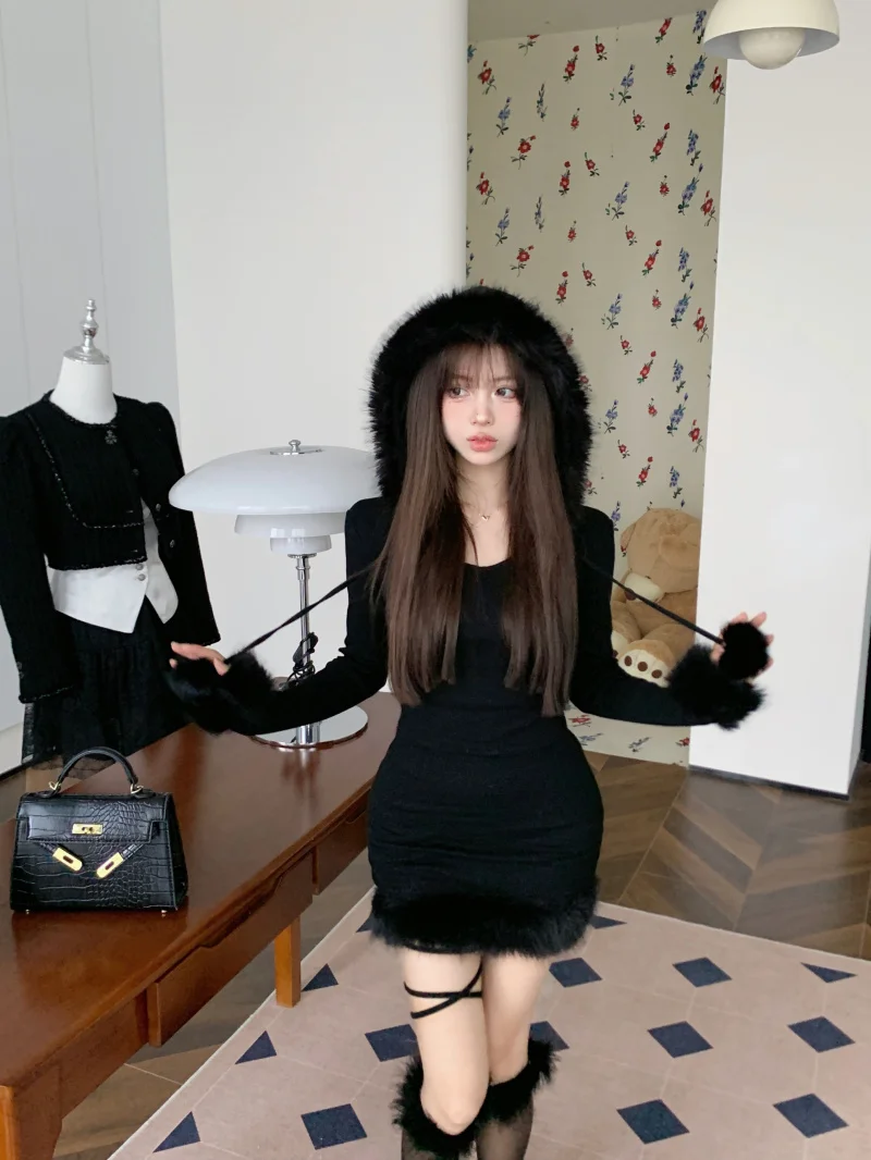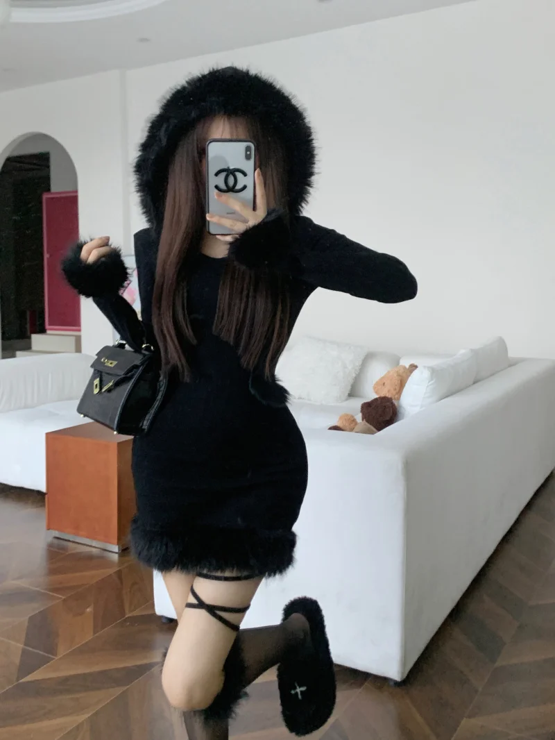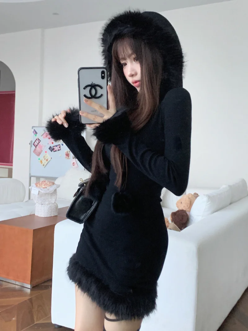 Yipinpay Hot Girl Black Knitted Hooded Fur Dress Women's Winter Slim Fit Pure Sexy Hip Wrap Short Dress Fashion Female Clothes