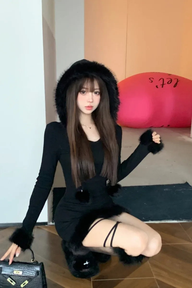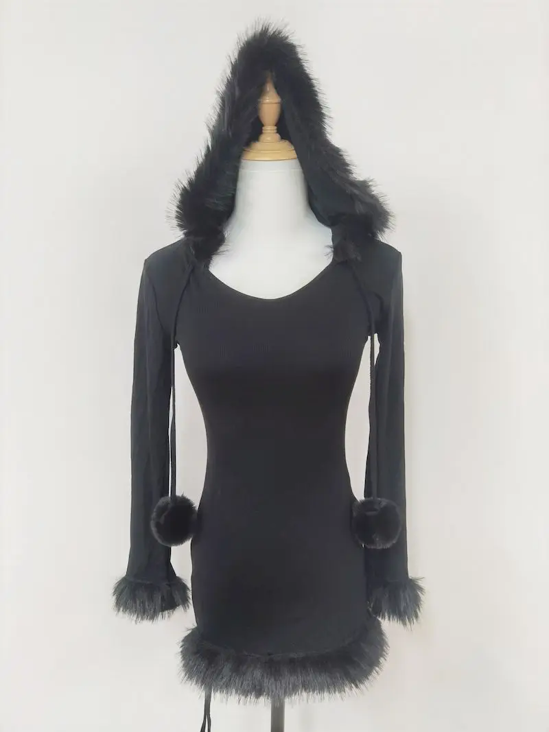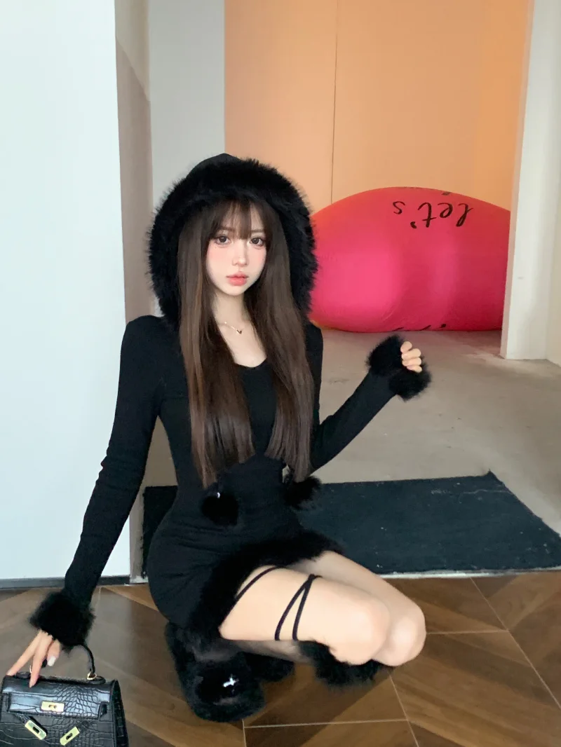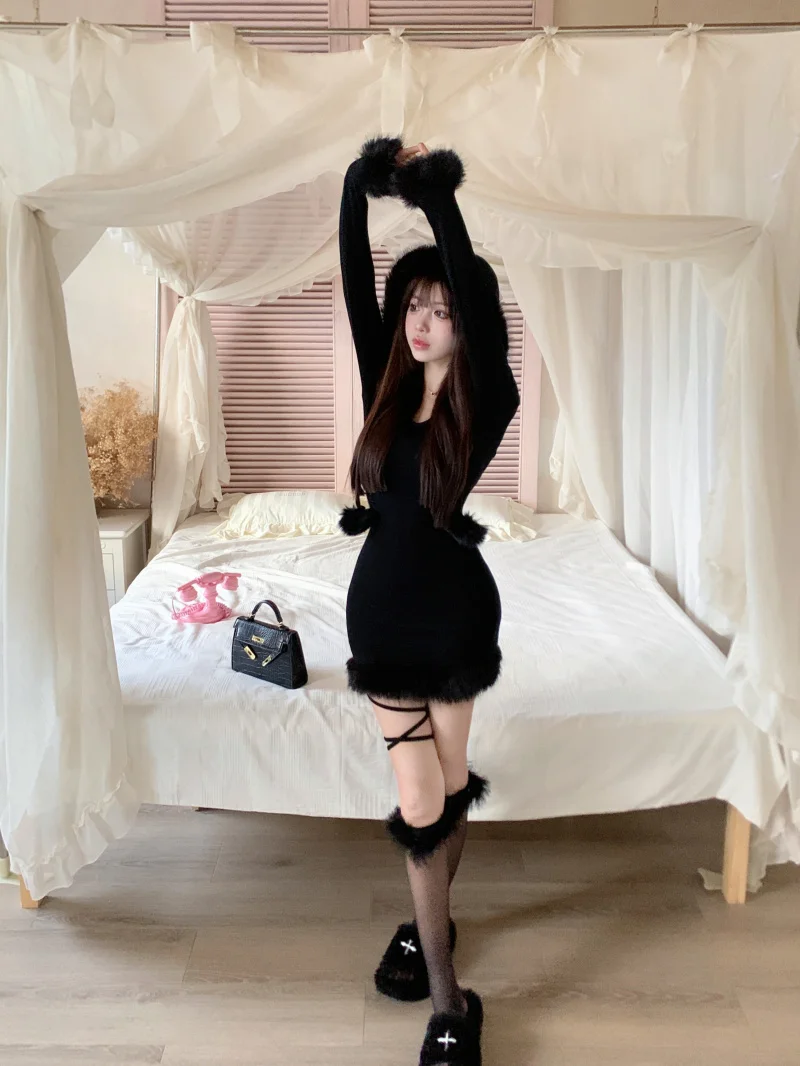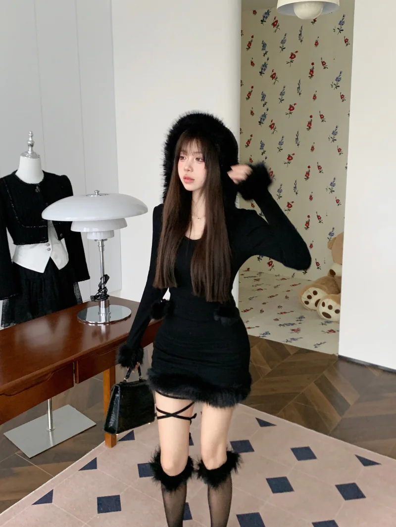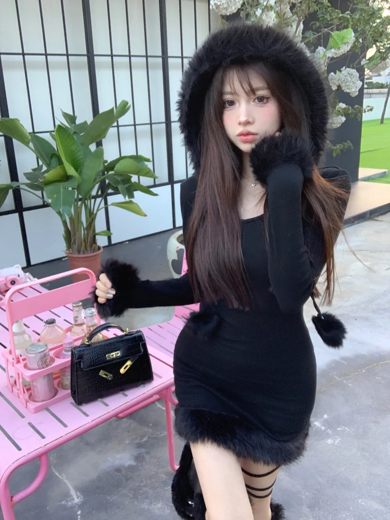 Yipinpay Hot Girl Black Knitted Hooded Fur Dress Women's Winter Slim Fit Pure Sexy Hip Wrap Short Dress Fashion Female Clothes