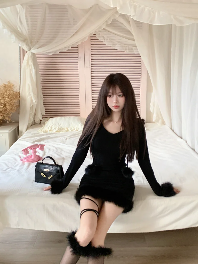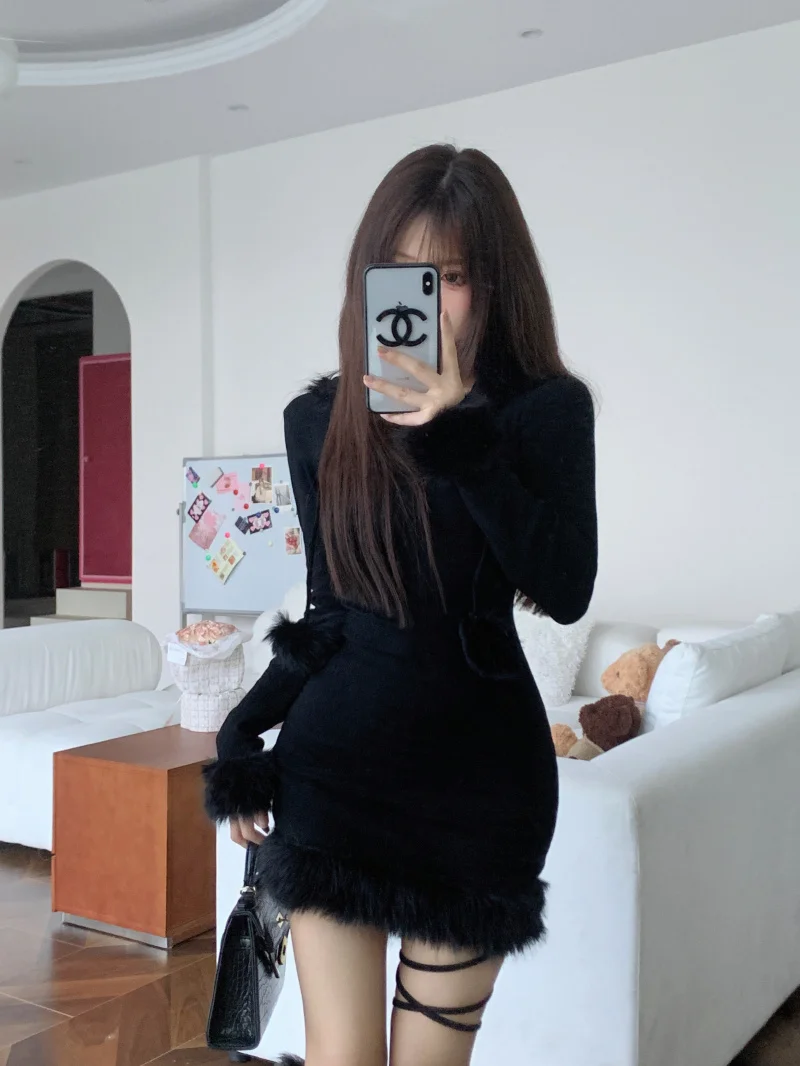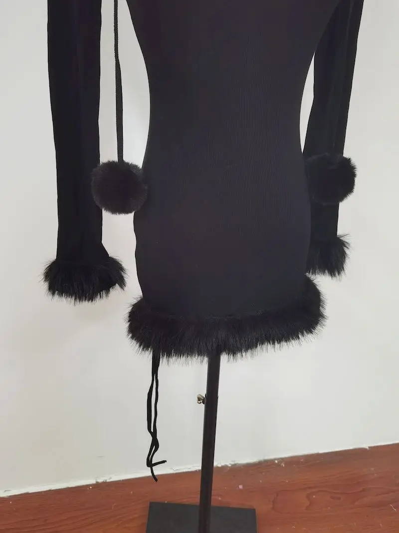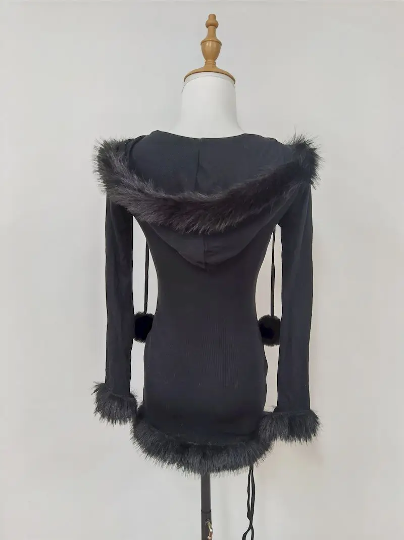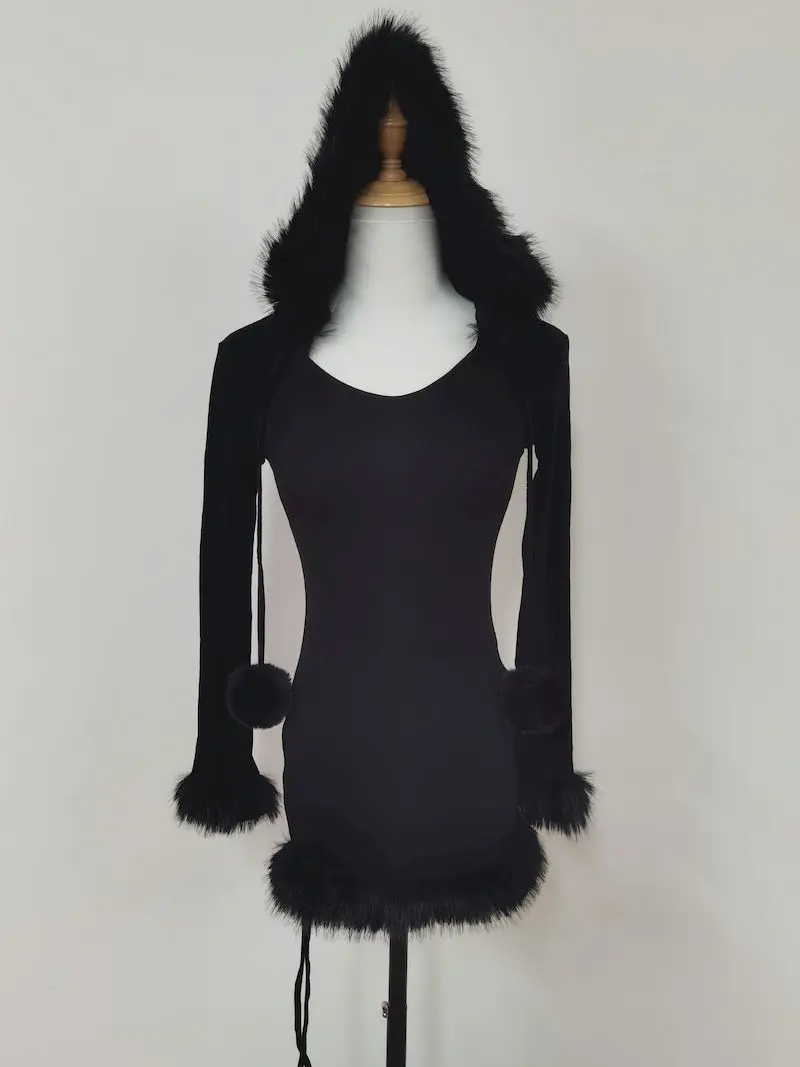 Yipinpay Hot Girl Black Knitted Hooded Fur Dress Women's Winter Slim Fit Pure Sexy Hip Wrap Short Dress Fashion Female Clothes