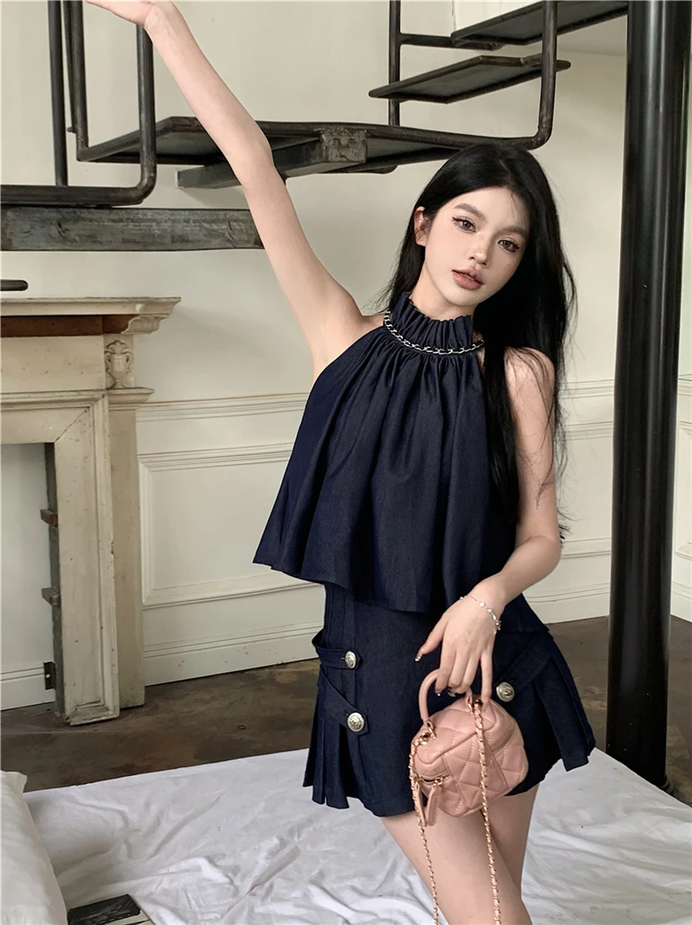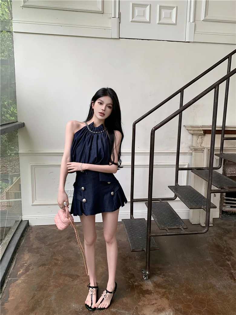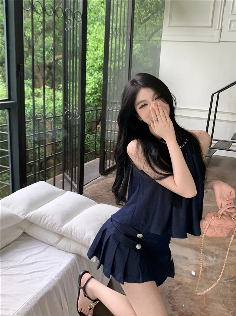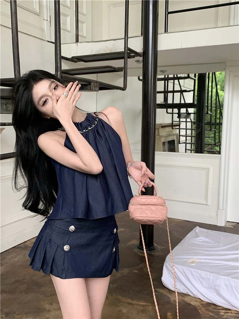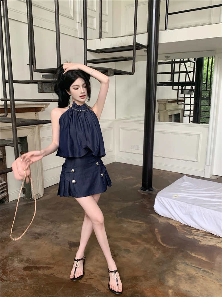 Yipinpay Hot Girl Retro Suit Women's Summer Halter Neck Off Shoulder Tank Top Denim Pleated Skirt Two-piece Set Female Clothes