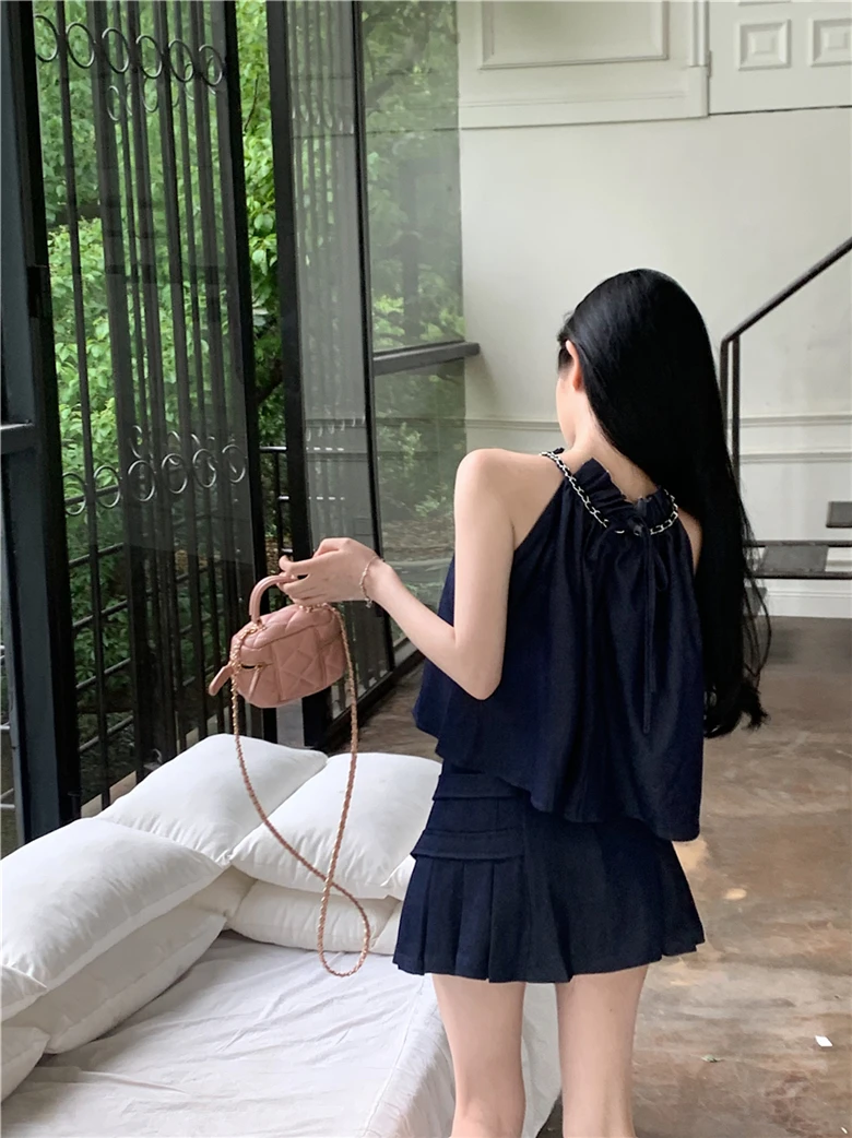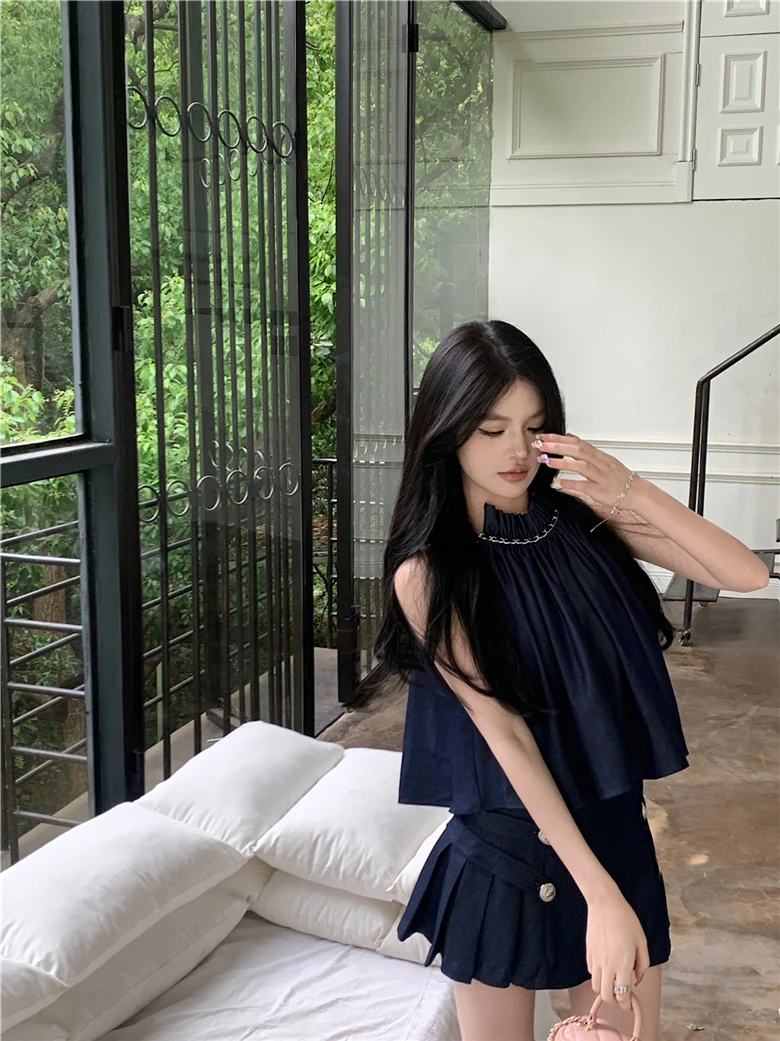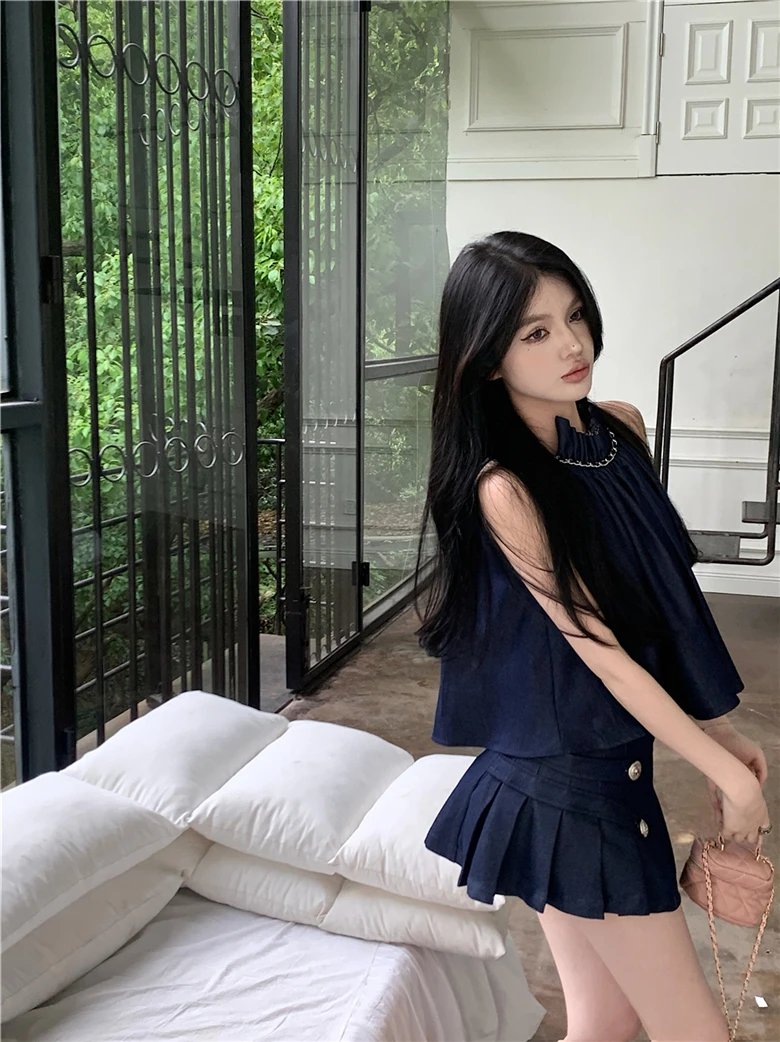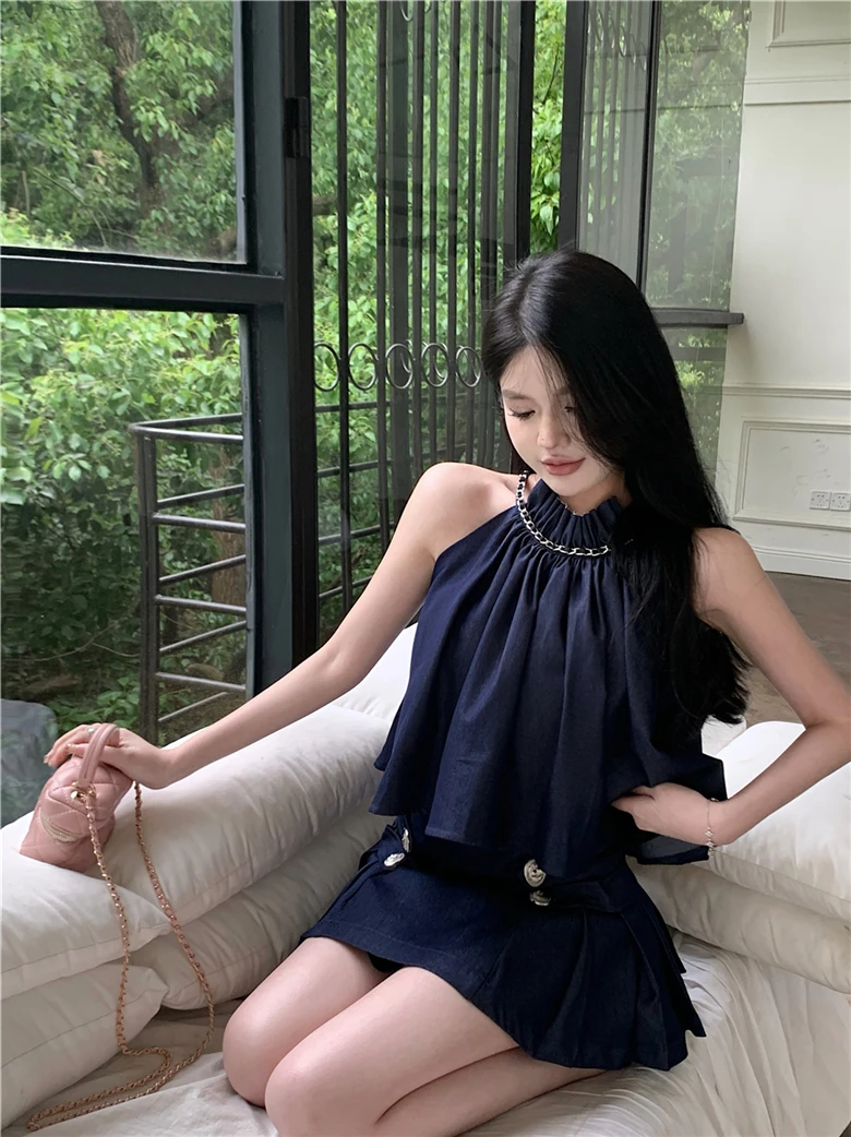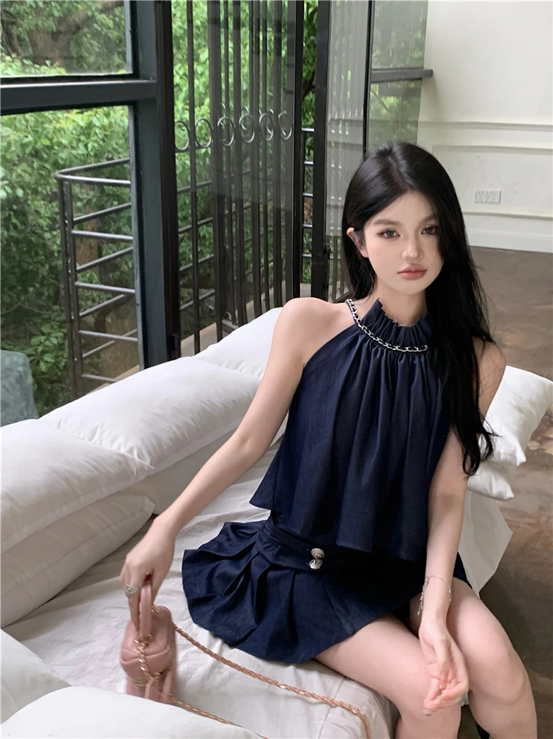 Yipinpay Hot Girl Retro Suit Women's Summer Halter Neck Off Shoulder Tank Top Denim Pleated Skirt Two-piece Set Female Clothes