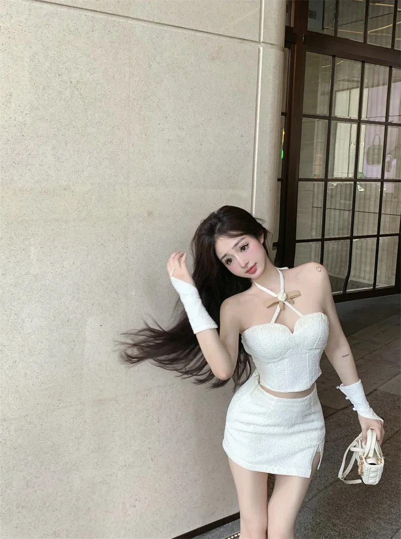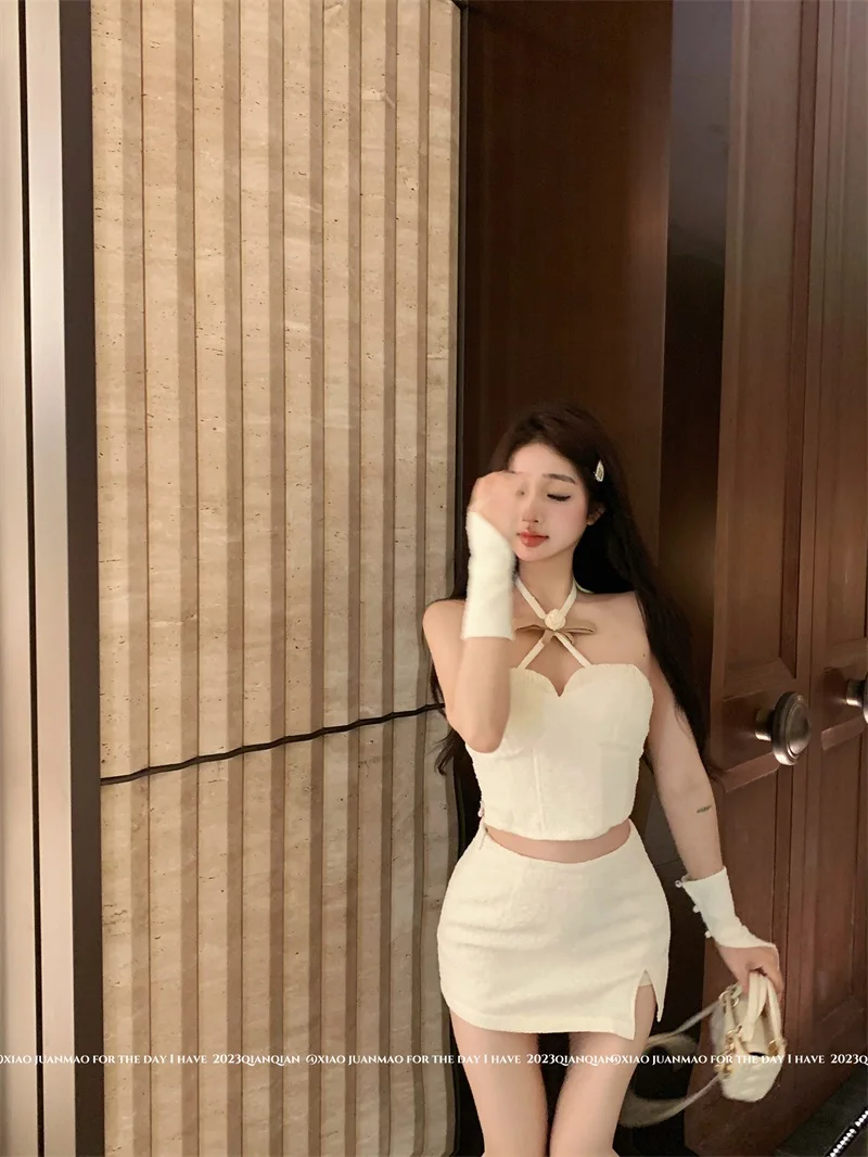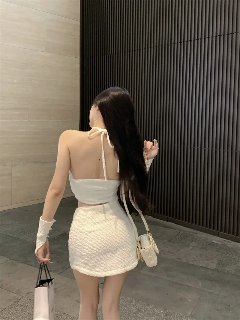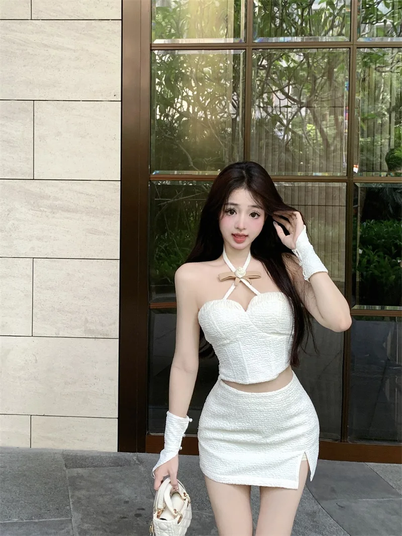Yipinpay Hot Girl Suit Women's Spring Slim Fit Halter Neck Tank Top High Waist Wrap Hip Skirt Two-piece Set Fashion Female Clothes