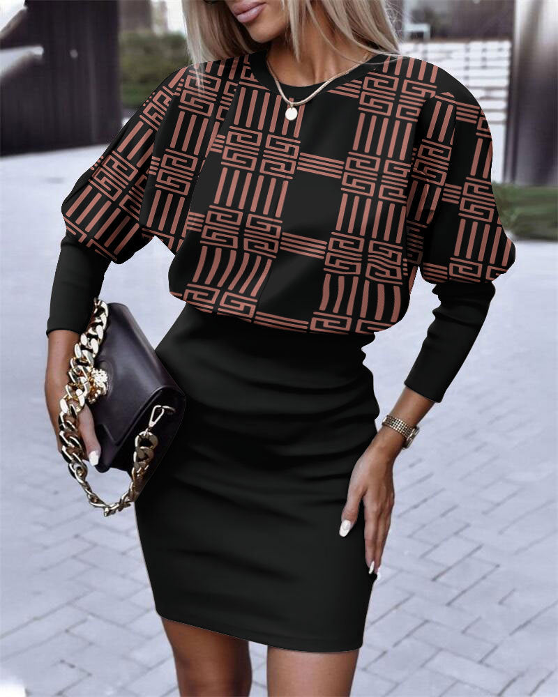 Yipinpay Independent Station Autumn New Fashion Printed Waist Round Collar Long-Sleeved Dress