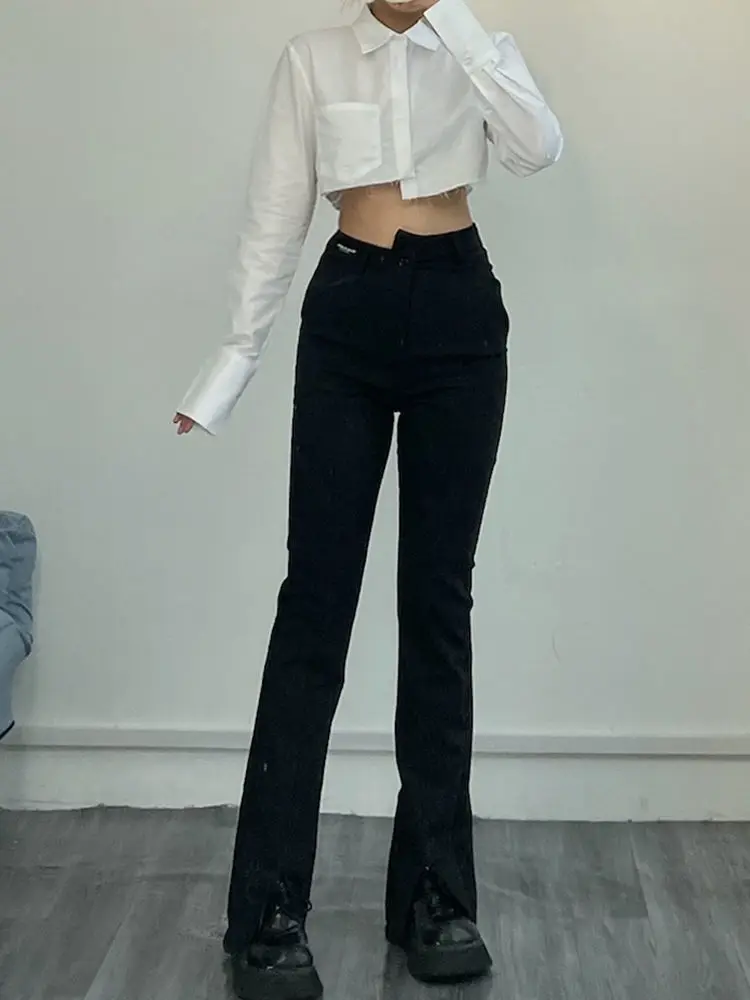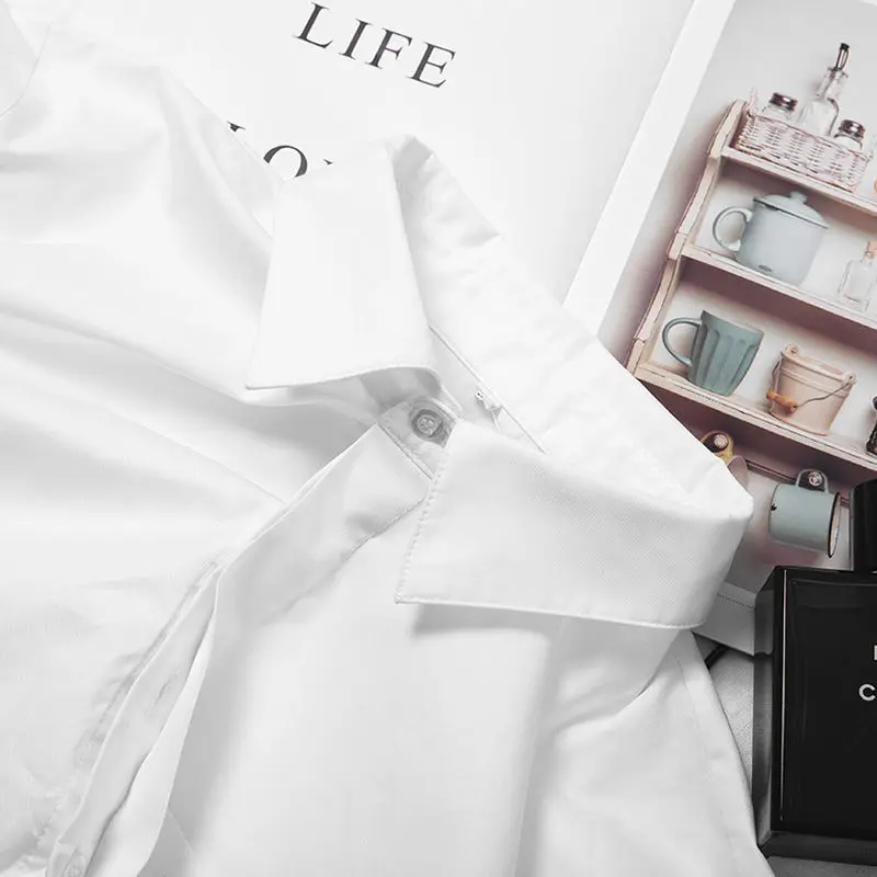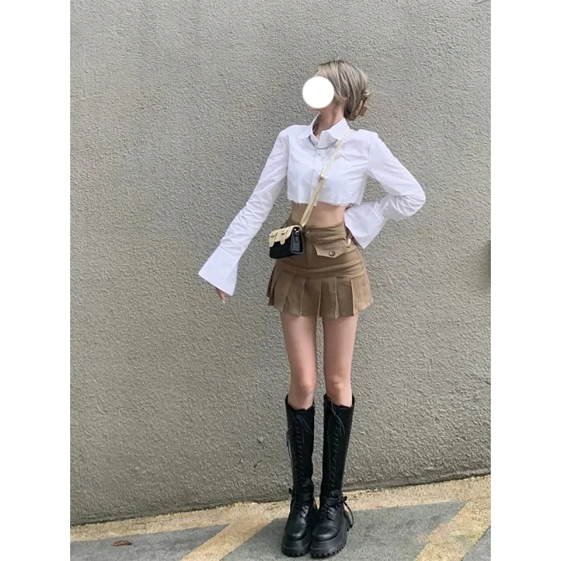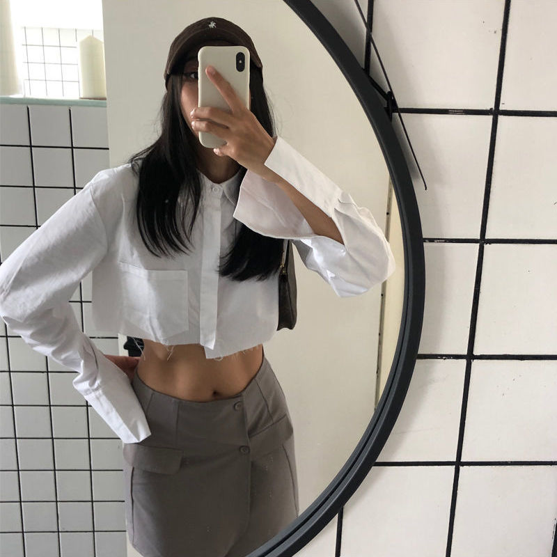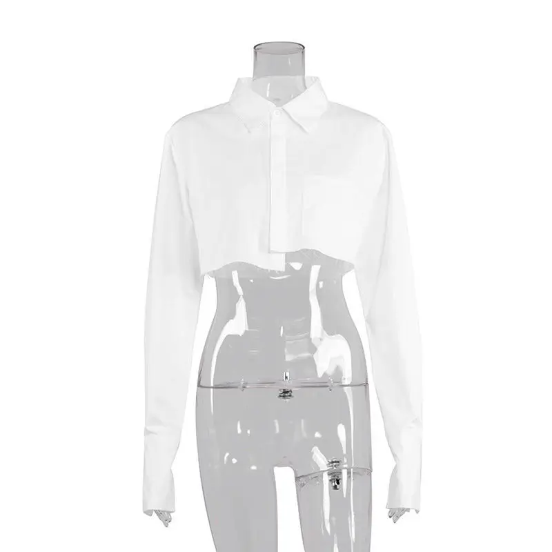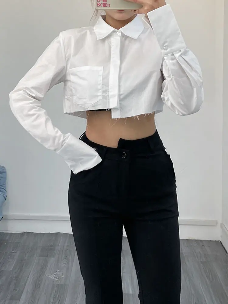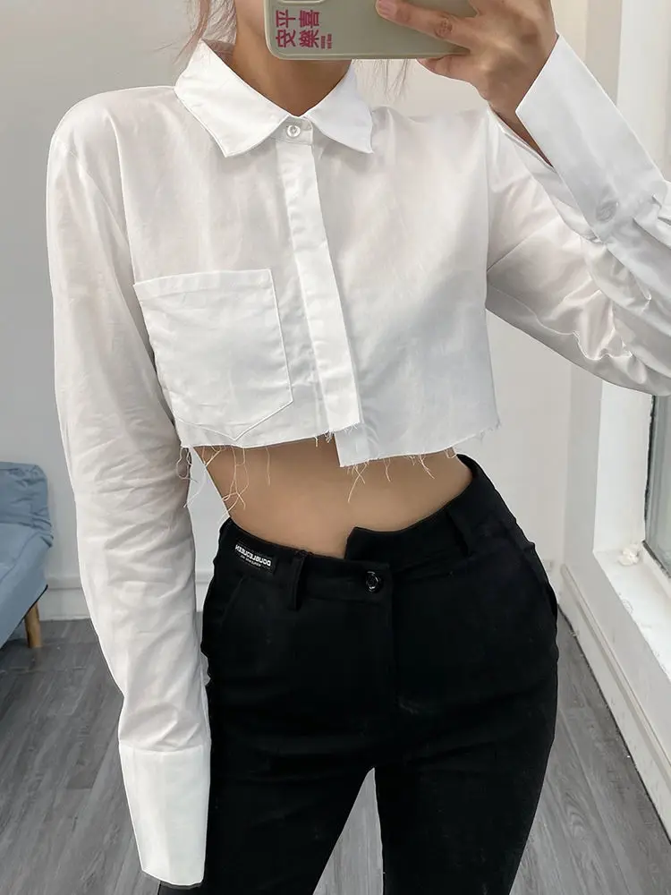Yipinpay Irregular Cropped Shirt Top Women Sexy Korean Streetwear Blouses Casual Lapel Pocket Patchwork Long Sleeve White Shirt