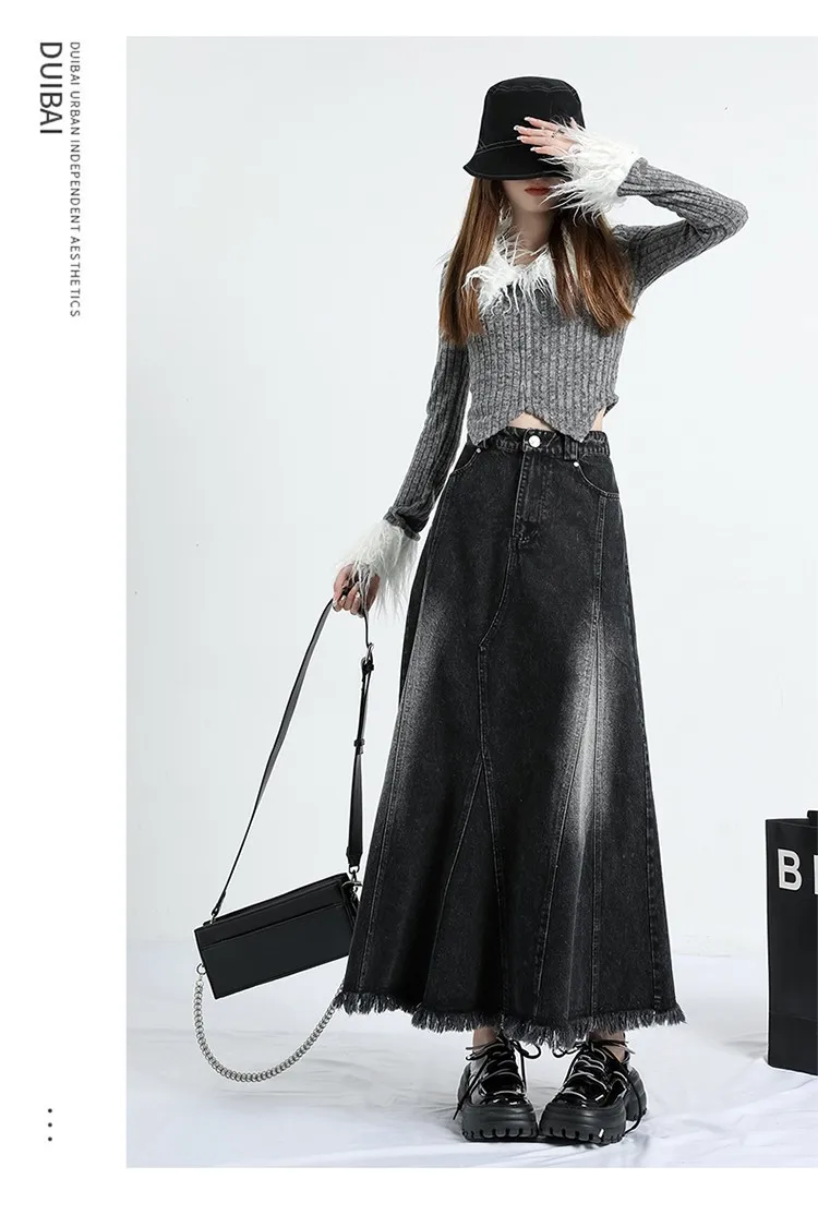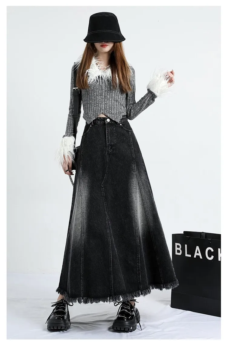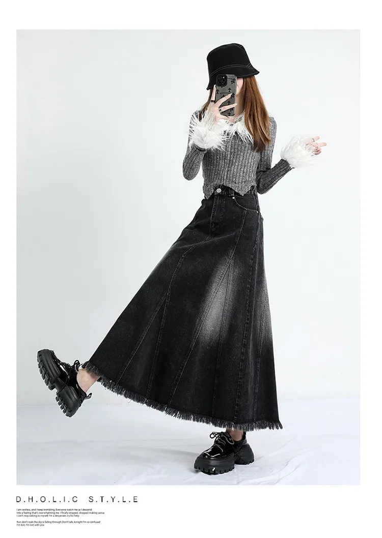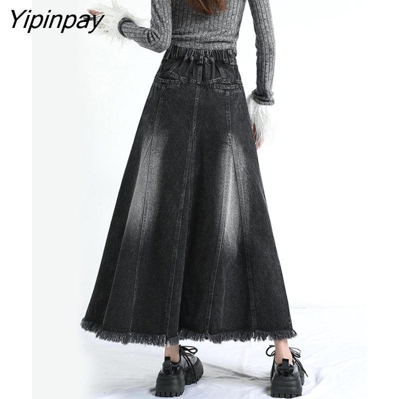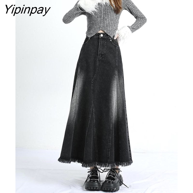 Yipinpay Irregular Long A-line Denim Skirt For Women High Waist Balck Jean Skirts For Ladies