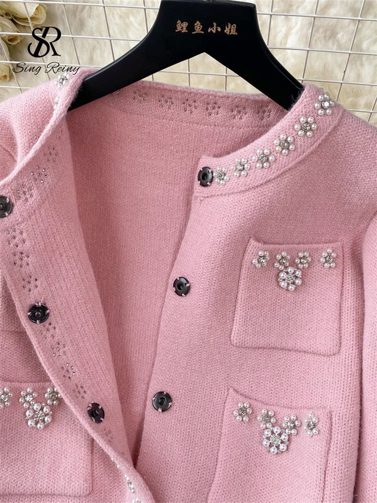 Yipinpay Japan Style Pearls Knit Suits Hidden Breasted Pockets Cardigan+Mini Pleated A Line Skirt Women Sweet Streetwear Sets