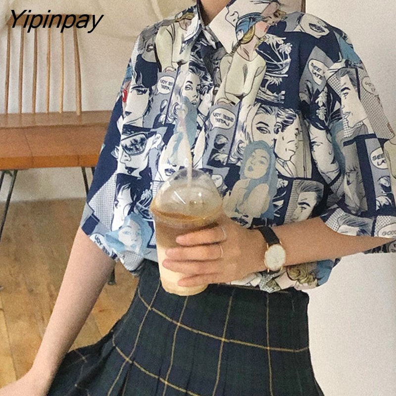 Yipinpay Japanese style Cartoon print Women Shirt Vintage Short Sleeve Button Up Y2K Womens Blouse 2023 Summer Loose Female Shirts